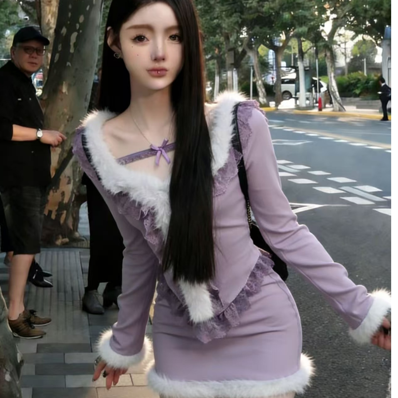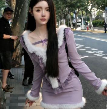 FA55617# 韩系温柔纯欲辣妹名媛千金风显瘦蕾丝毛毛上衣短裙秋冬女潮两件套 服裝批發女裝批發服飾貨源