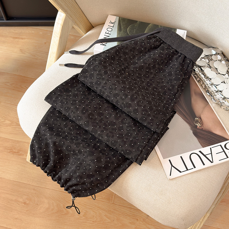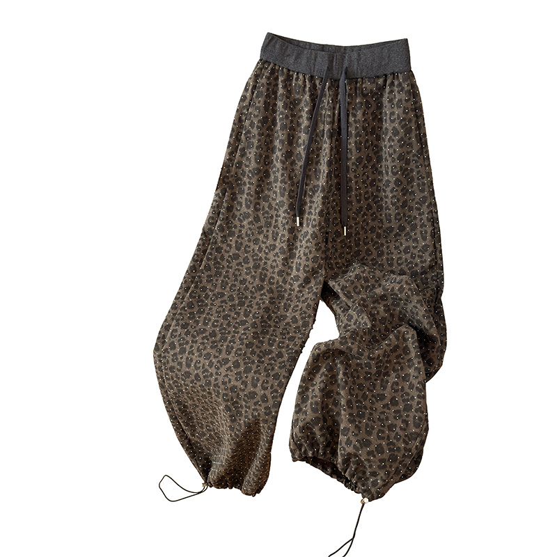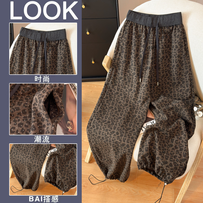 BY10342# 春季新款烫钻豹纹阔腿裤宽松韩版休闲裤百搭运动裤束脚两穿工装裤 服裝批發女裝批發服飾貨源