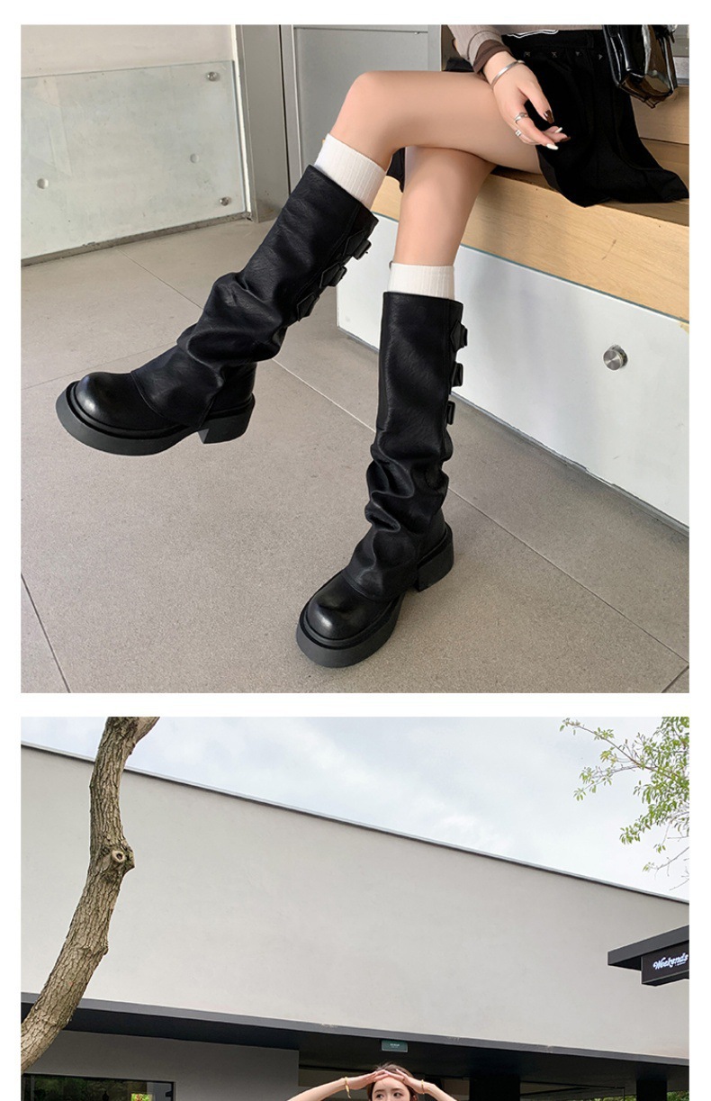 X-32024# 棕色靴子女夏款复古显瘦长筒靴百搭褶皱长靴厚底高跟靴 鞋子批發女鞋批發鞋子靴子貨源