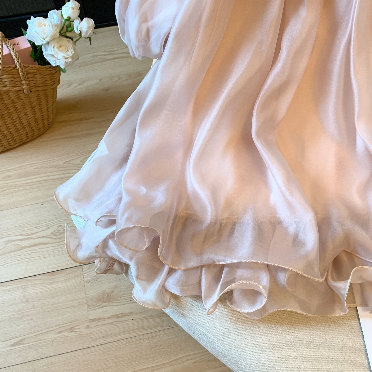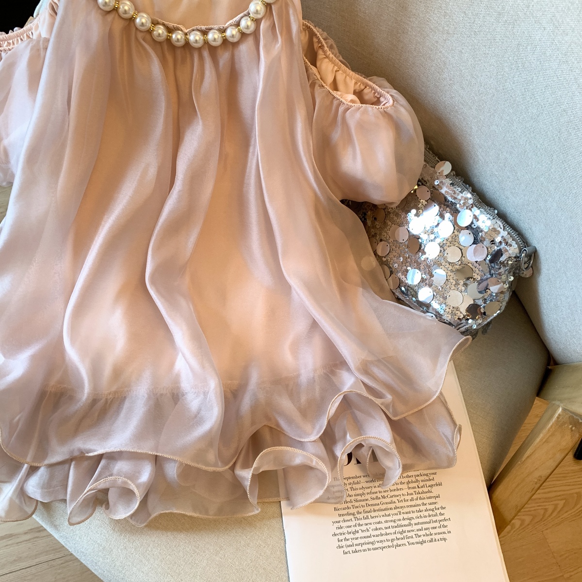 FA21810# 温柔风纯欲性感露肩吊带雪纺衫立体珍珠链超仙气中长款上衣 服裝批發女裝批發服飾貨源