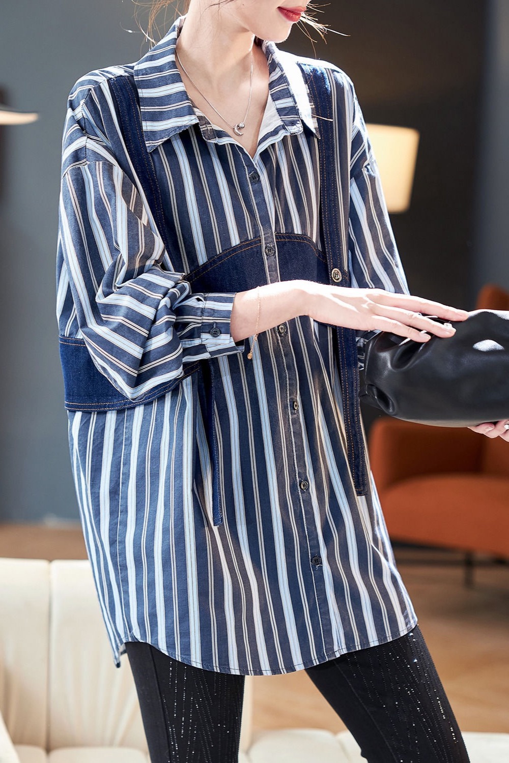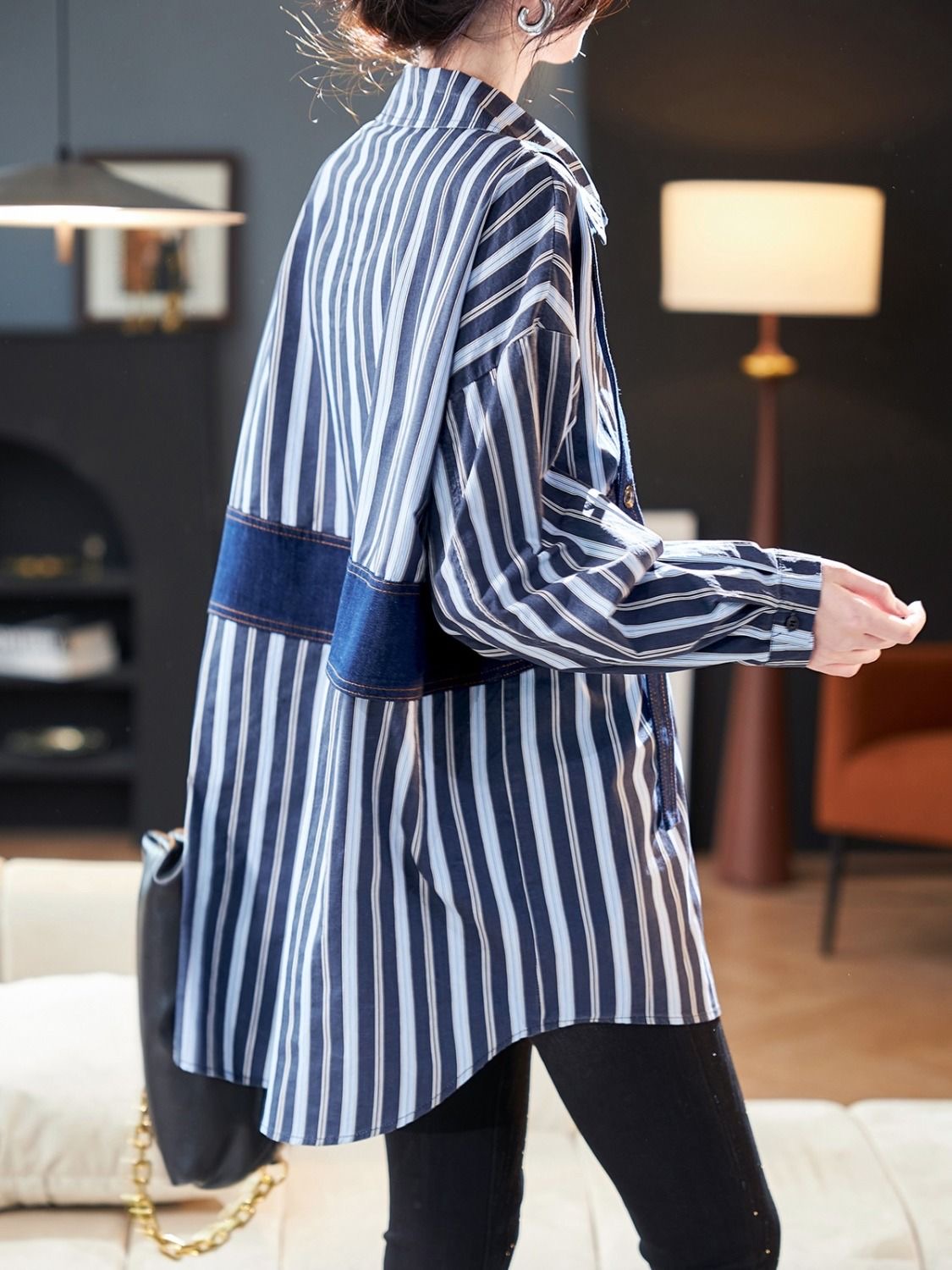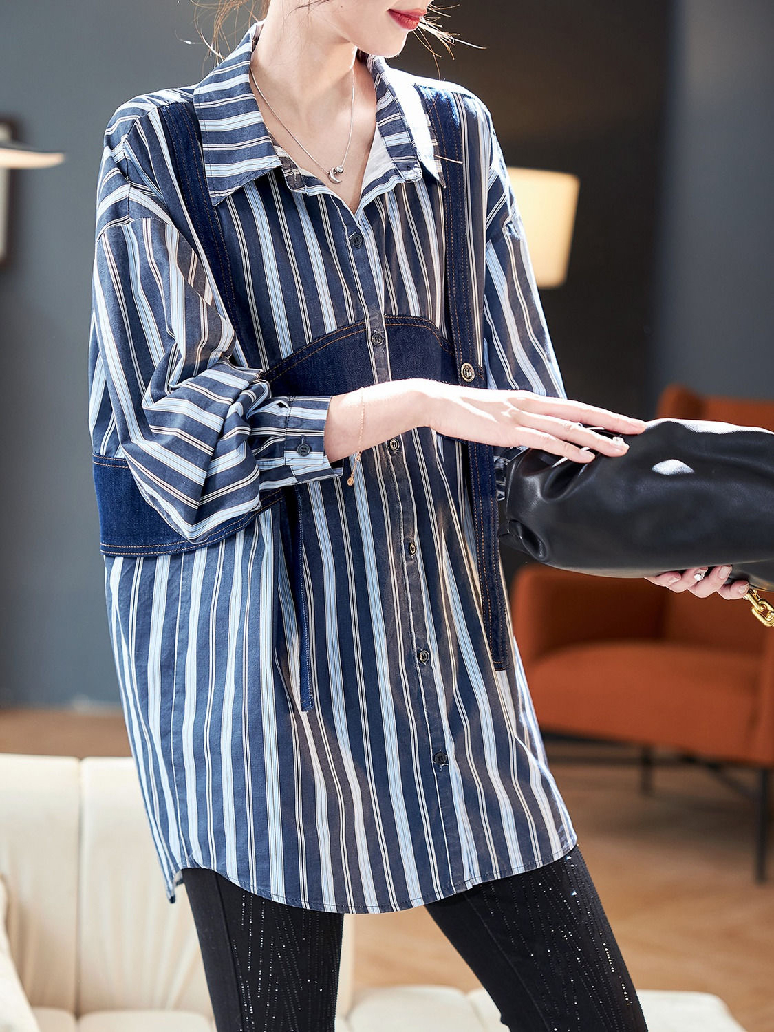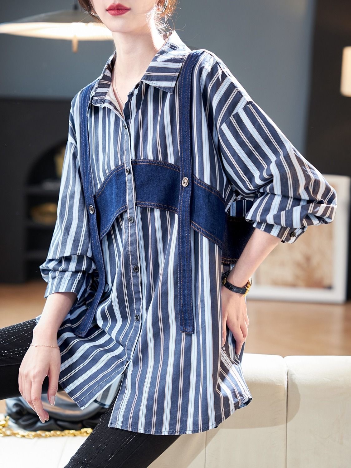 FA35893# 秋季新款时尚韩版显瘦百搭气质牛仔条纹撞色拼接长袖衬衫 服裝批發女裝批發服飾貨源