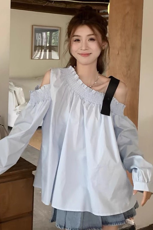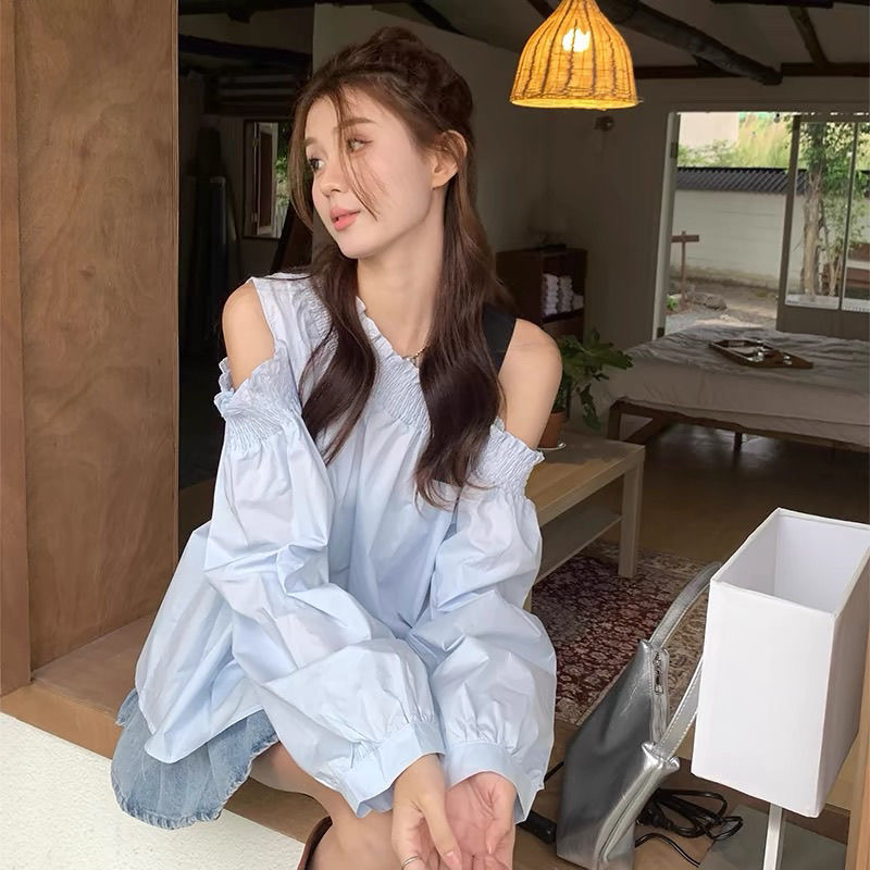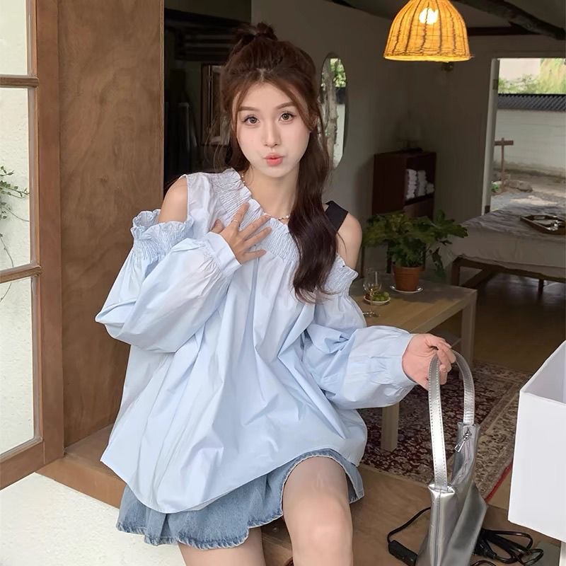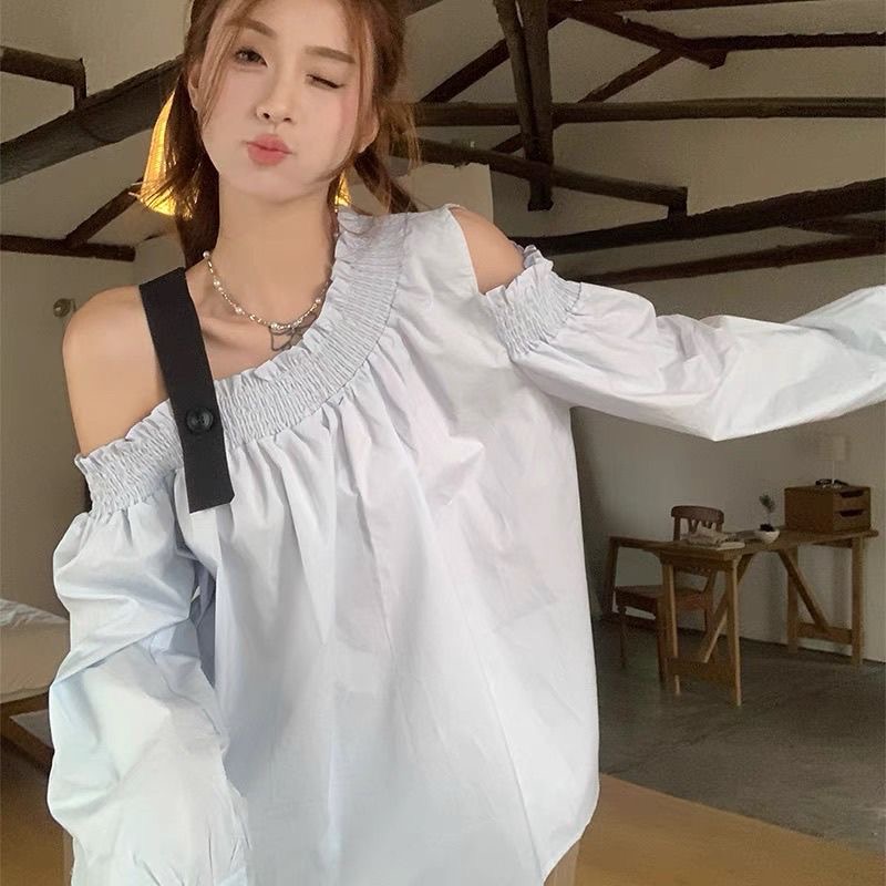 FA35894# 大码微胖妹妹mm夏季宽松设计感露肩性感撞色气质长袖衬衫上衣女潮 服裝批發女裝批發服飾貨源