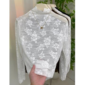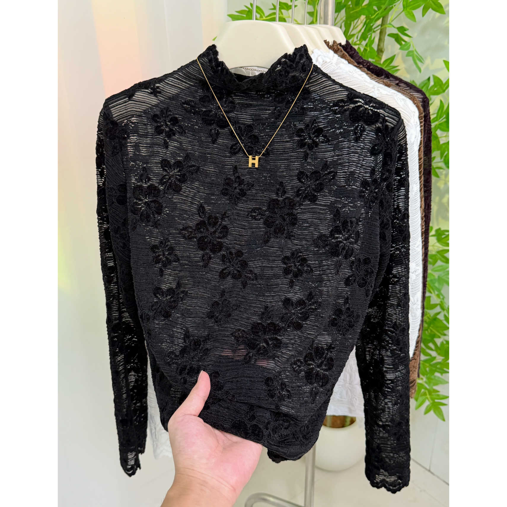 FA41961# 半高领蕾丝网纱长袖t恤女秋季新款时尚钩花花边领百搭打底衫 服裝批發女裝批發服飾貨源
