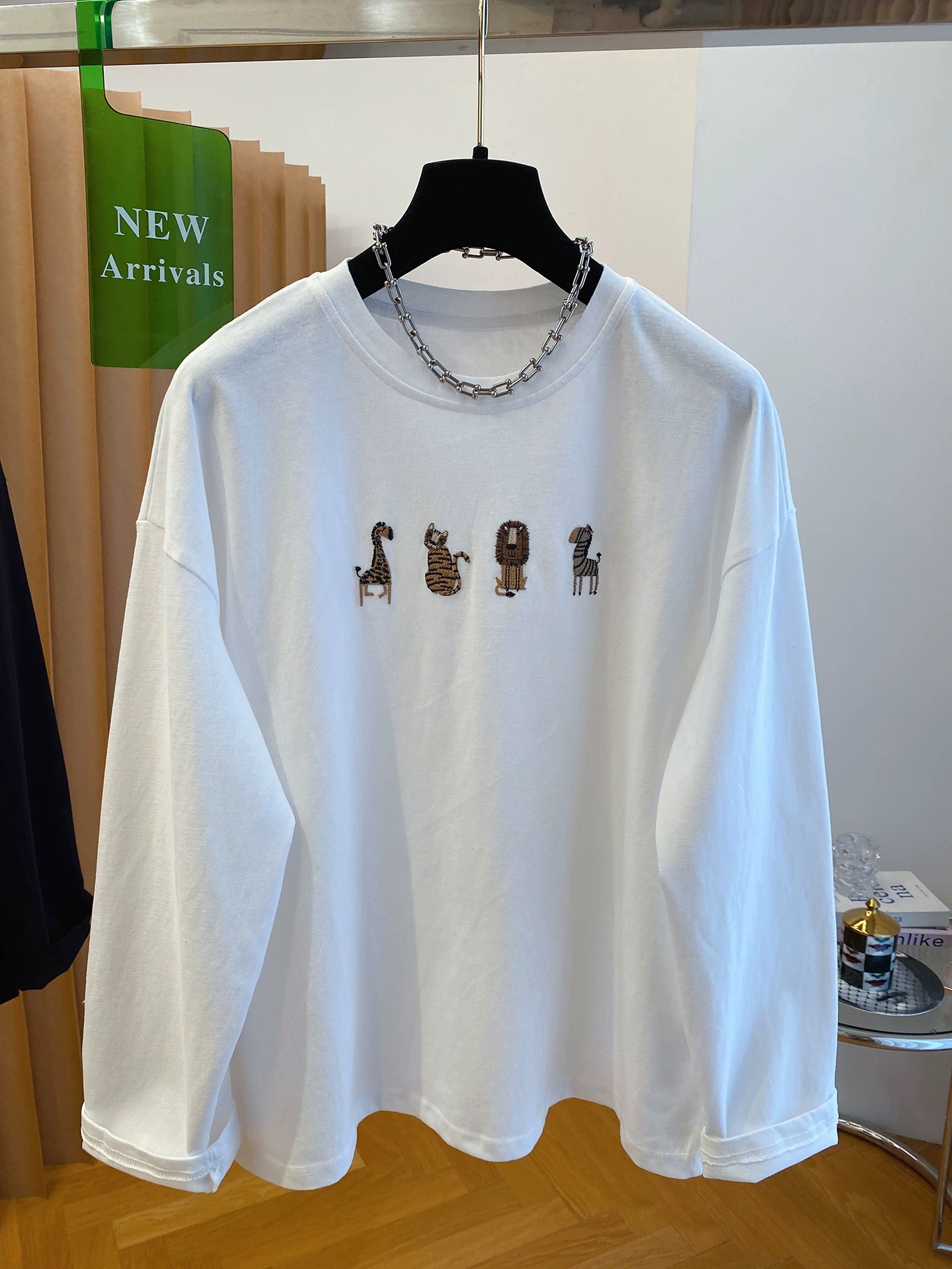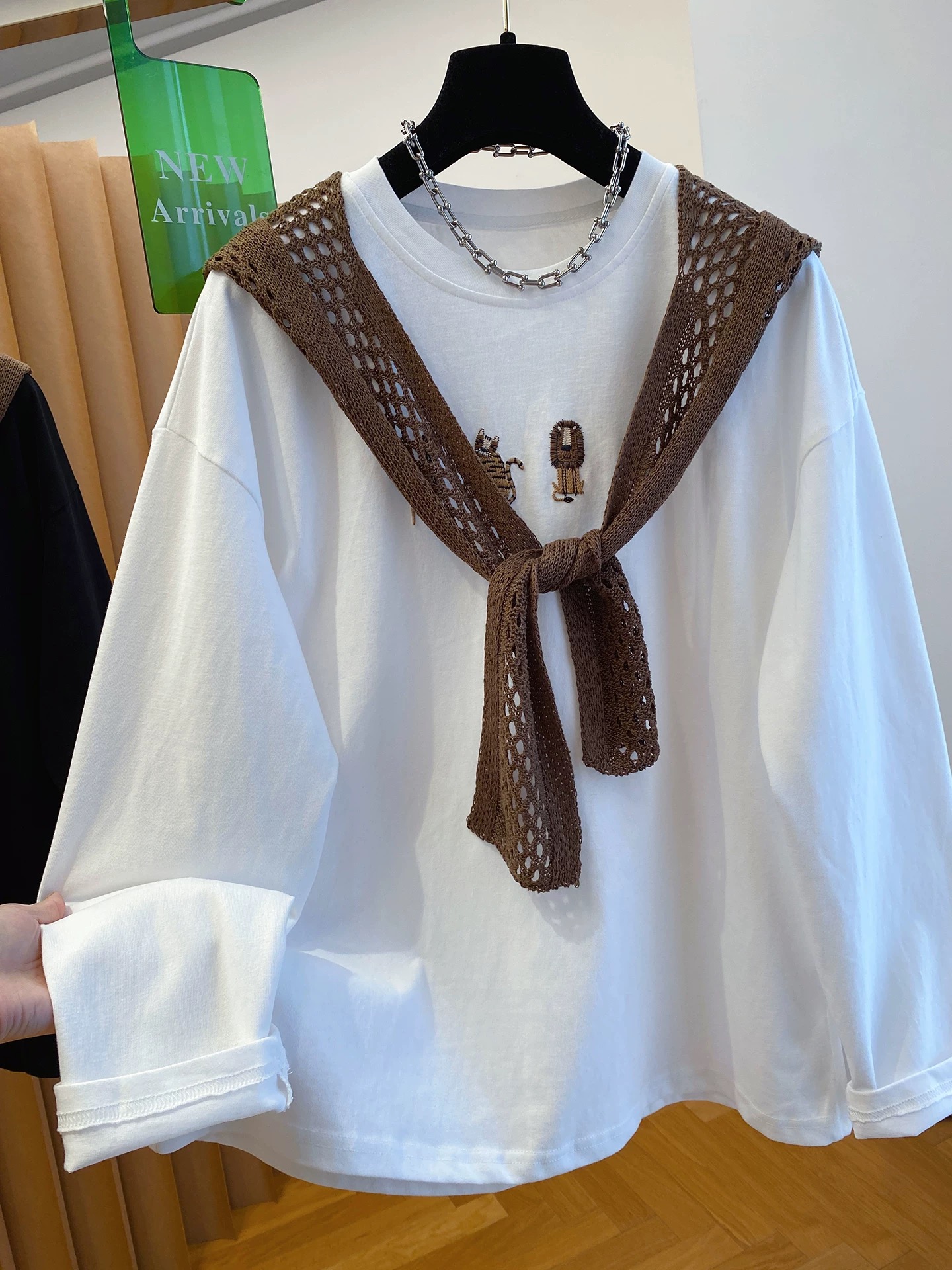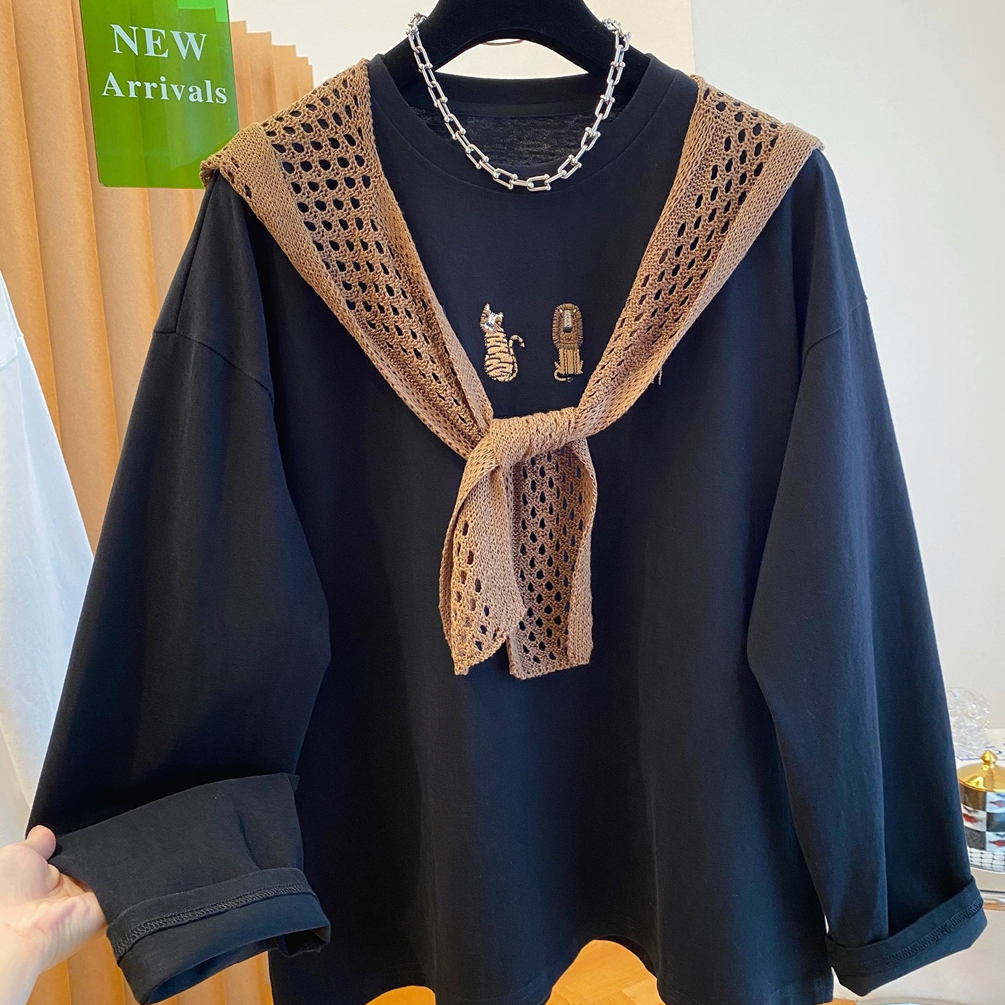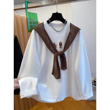 FA41966# 特大码300斤韩版百搭卡通刺绣t恤女长袖带披肩两件套上衣 服裝批發女裝批發服飾貨源