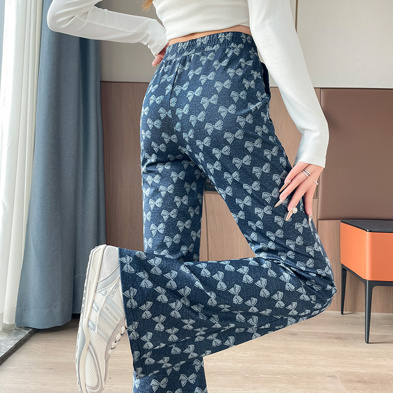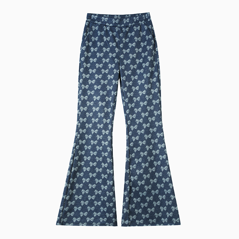 FA41968# 秋季复古弹力修身微喇蝴蝶结印花休闲裤女独特气质收腰喇叭长裤 服裝批發女裝批發服飾貨源