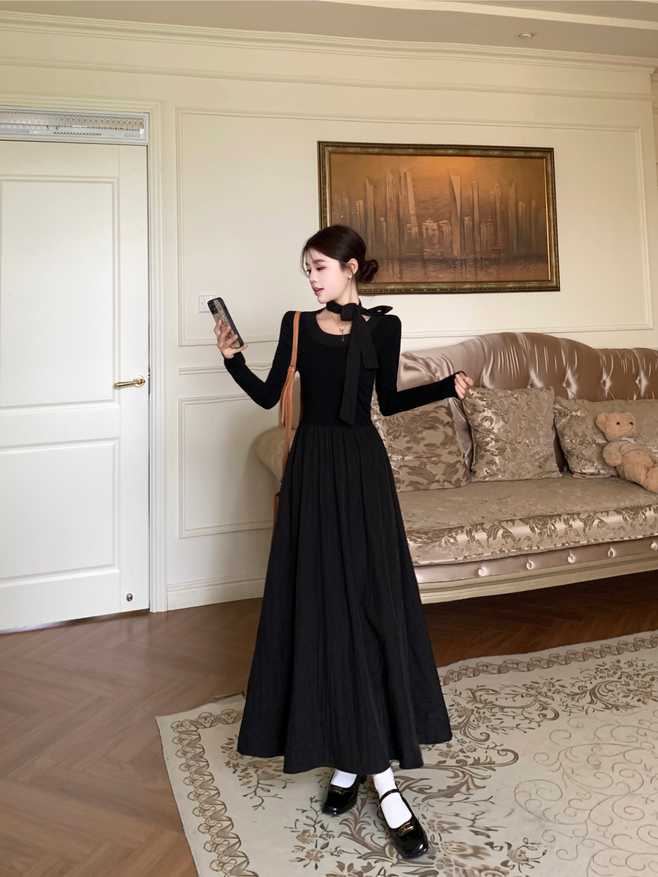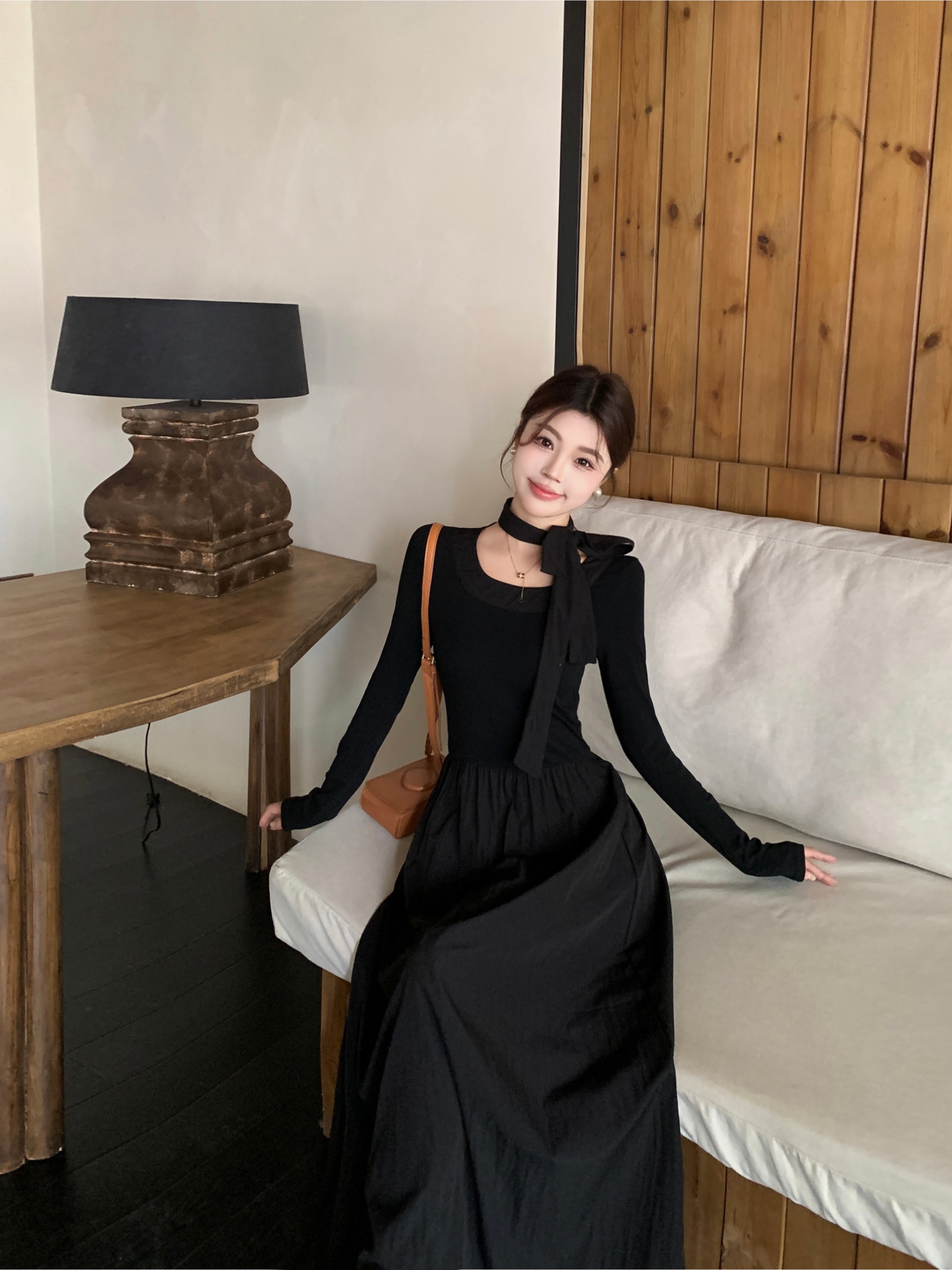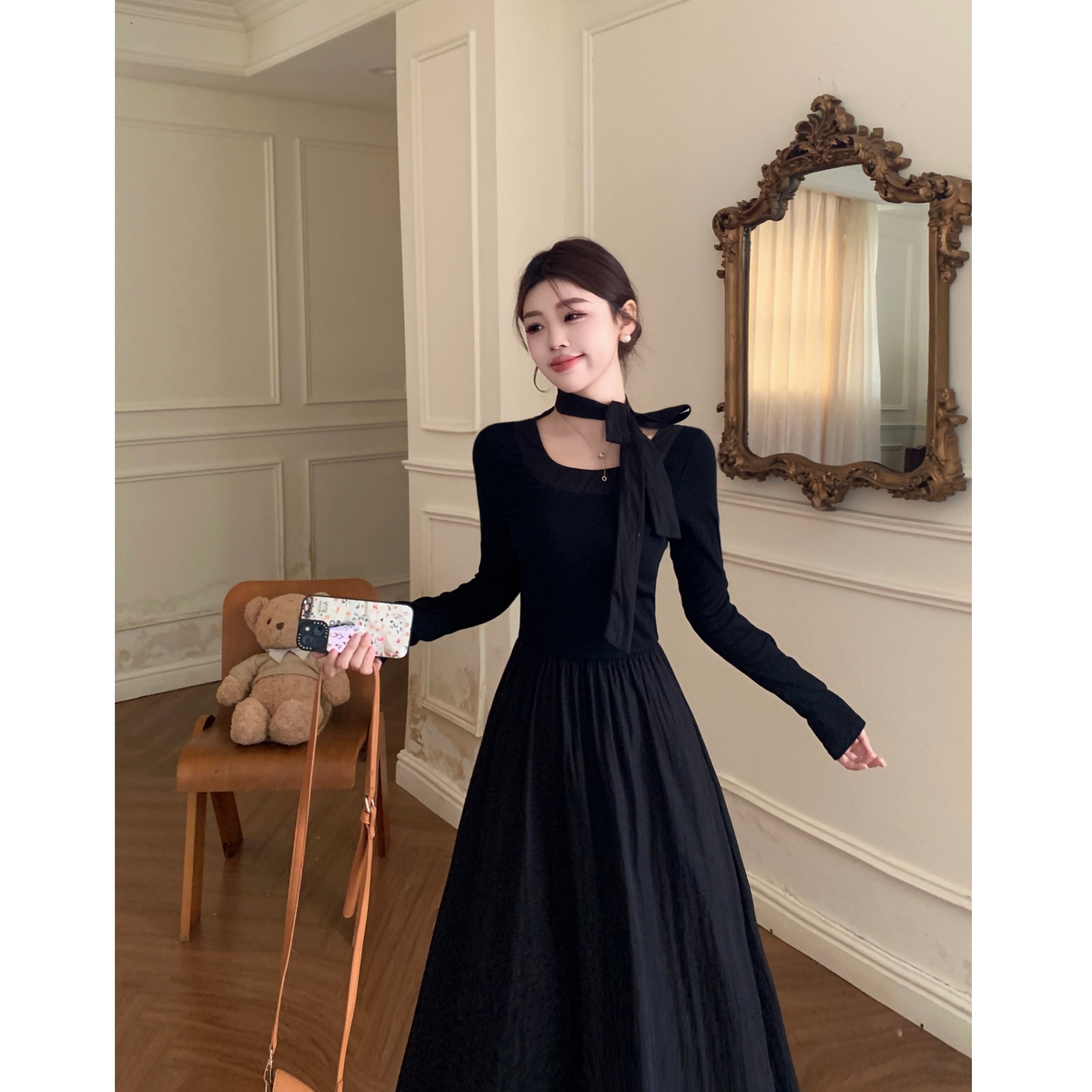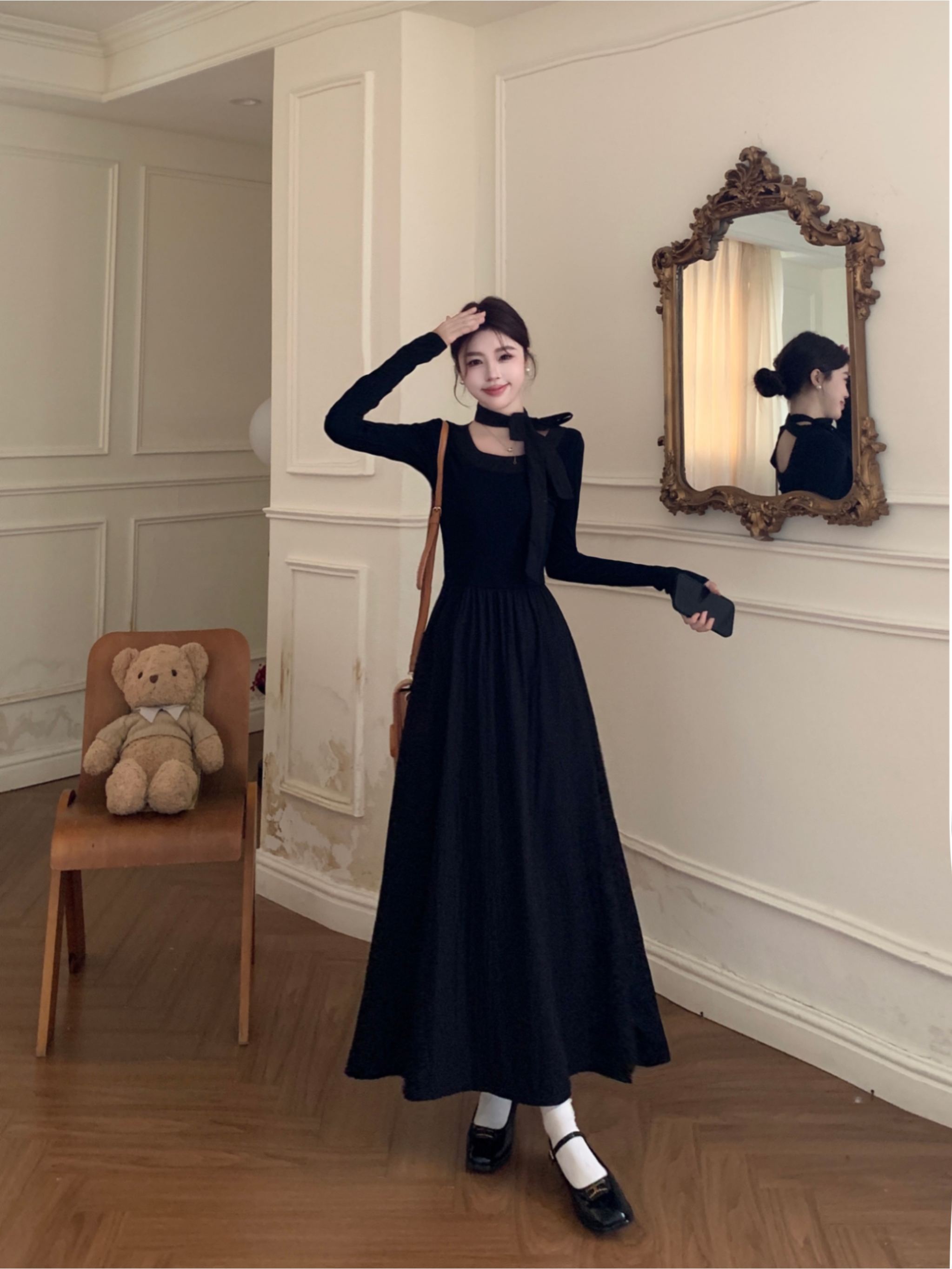 FA41973# 韩系大圆领温柔气质长袖显瘦中长款黑色蝴蝶结连衣裙 服裝批發女裝批發服飾貨源