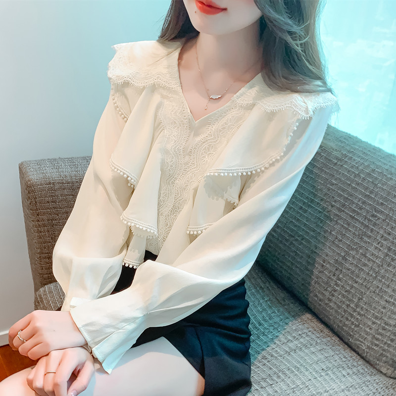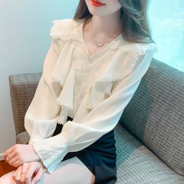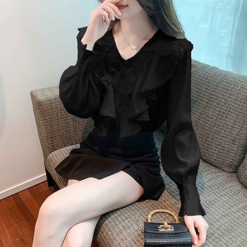 FA41974# 秋季新款荷叶边气质V领小衫女小众别致蕾丝长袖打底衫 服裝批發女裝批發服飾貨源