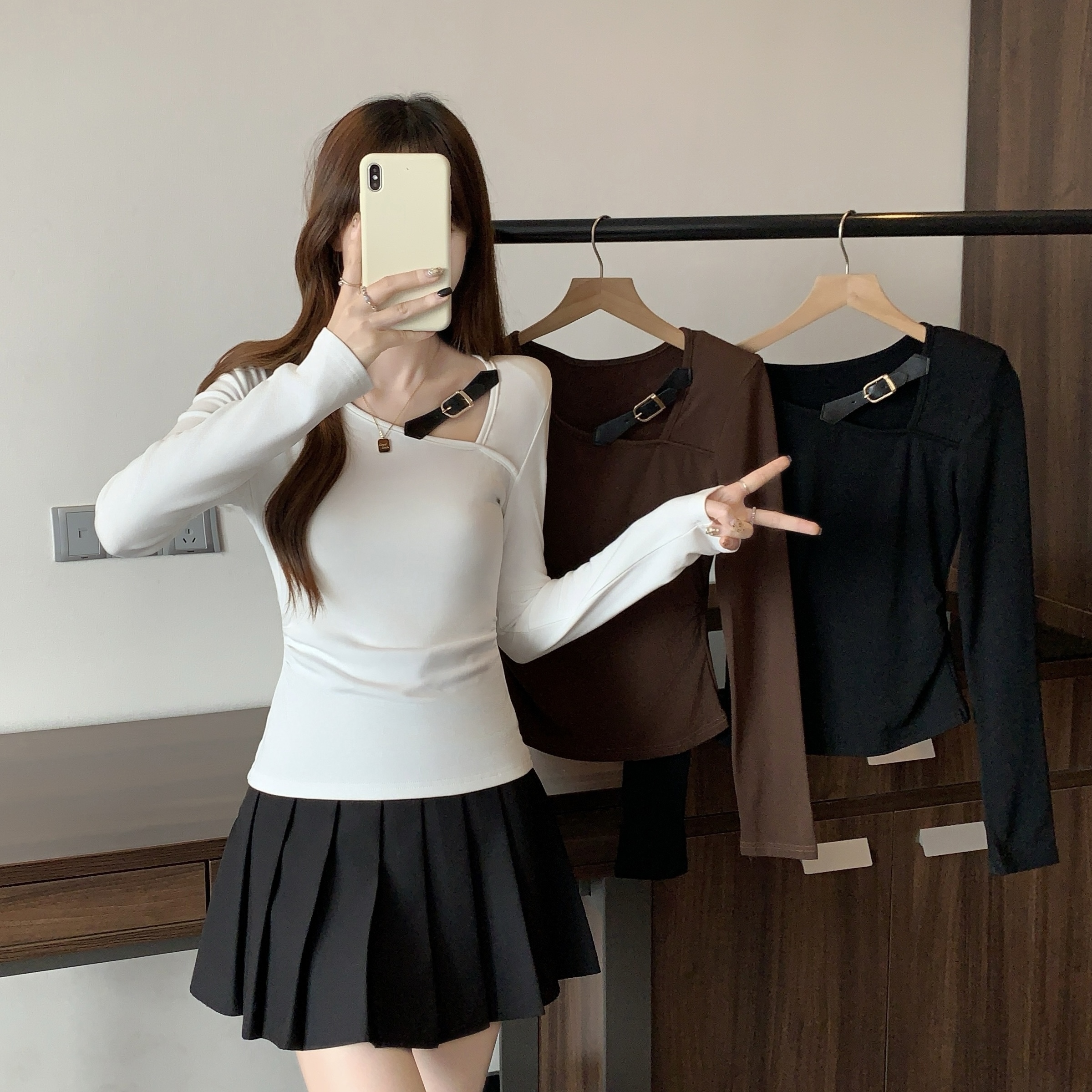 FA42518# 胖MM秋季新款辣妹不规则斜肩设计感褶皱修腰T恤上衣打底衫女 服裝批發女裝批發服飾貨源