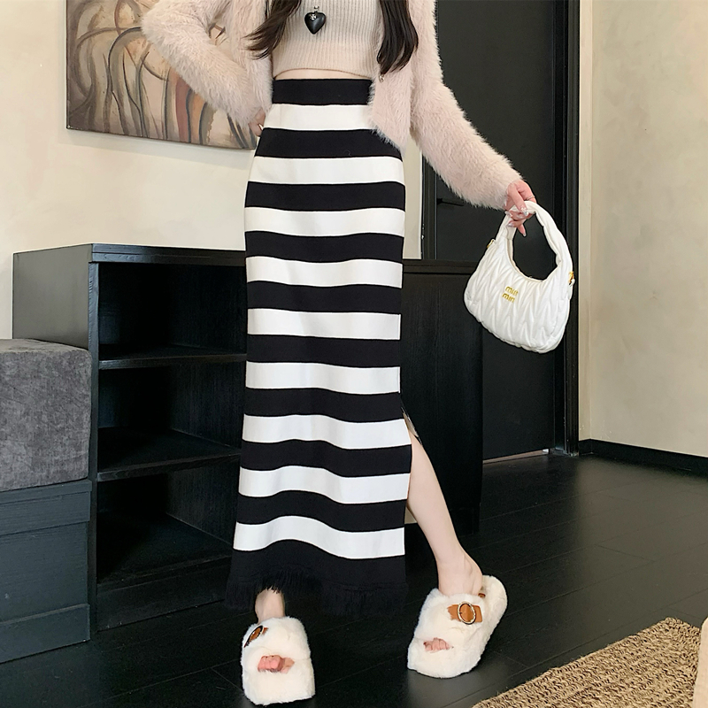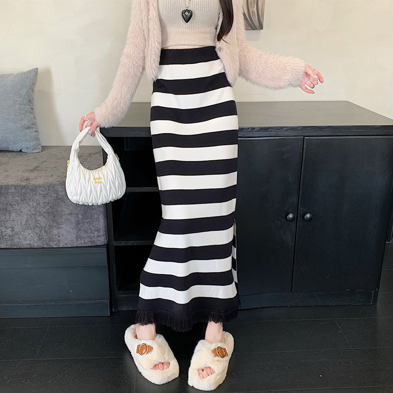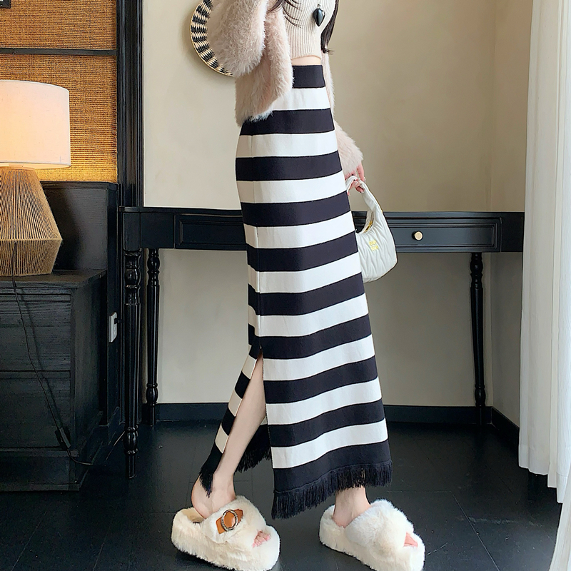 FA44224# 针织条纹流苏开叉半身长裙子早秋新款气质长裙包臀直筒毛线裙 服裝批發女裝批發服飾貨源