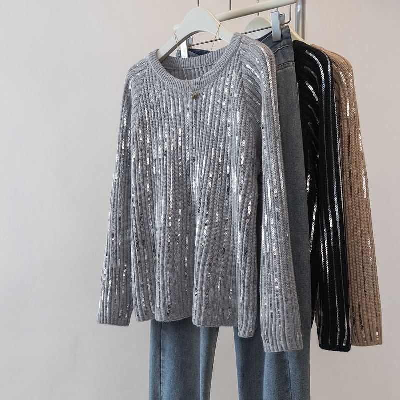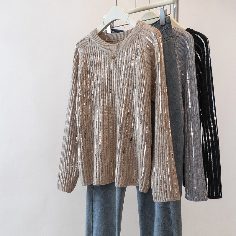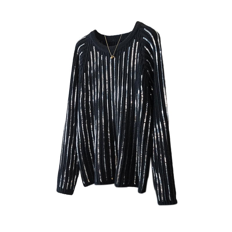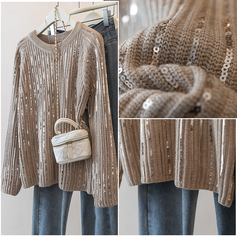 FA44538# 胖mm重工时尚亮片针织毛衣秋冬温柔显瘦长袖圆领套头高端毛衣 服裝批發女裝批發服飾貨源