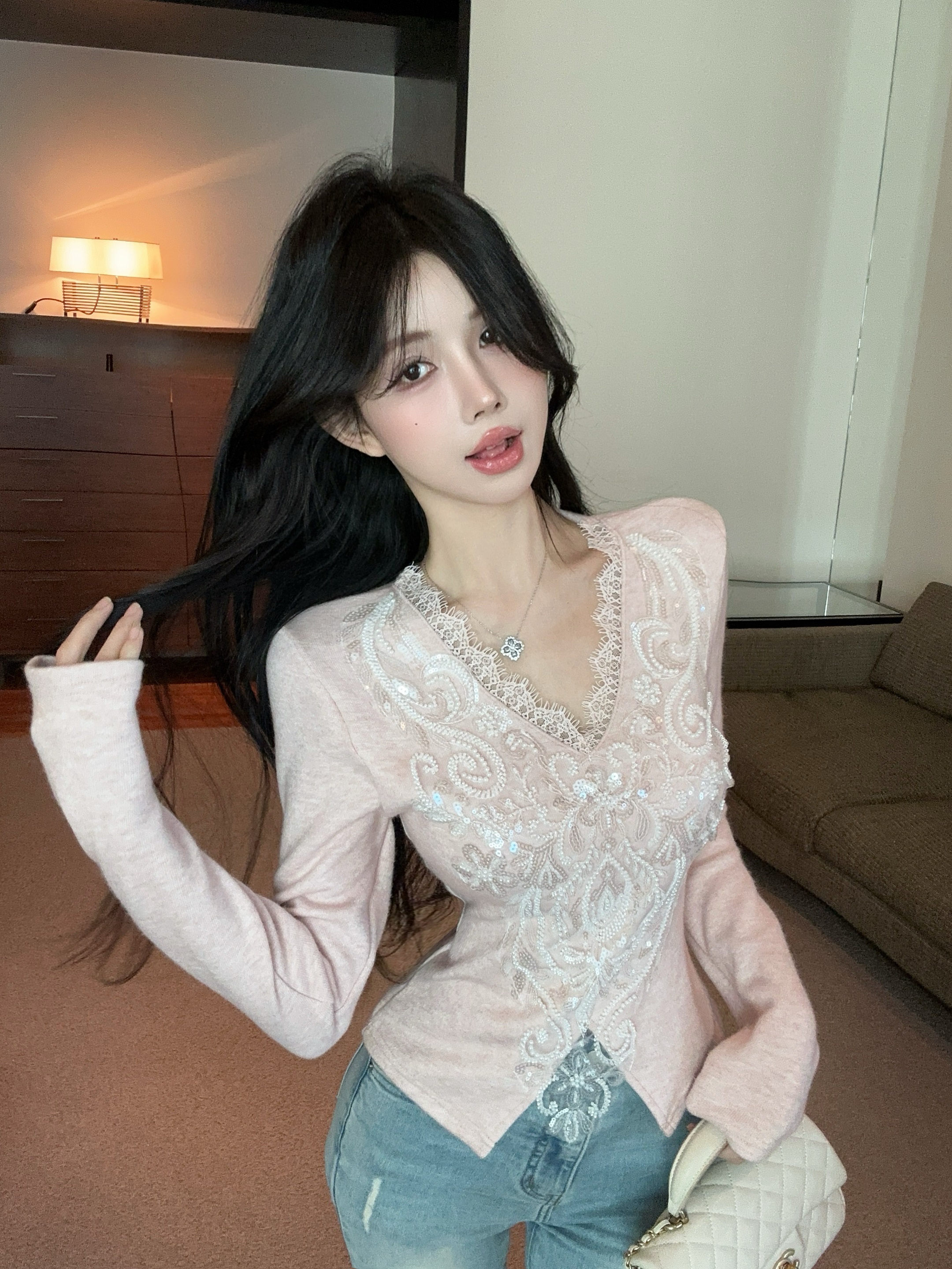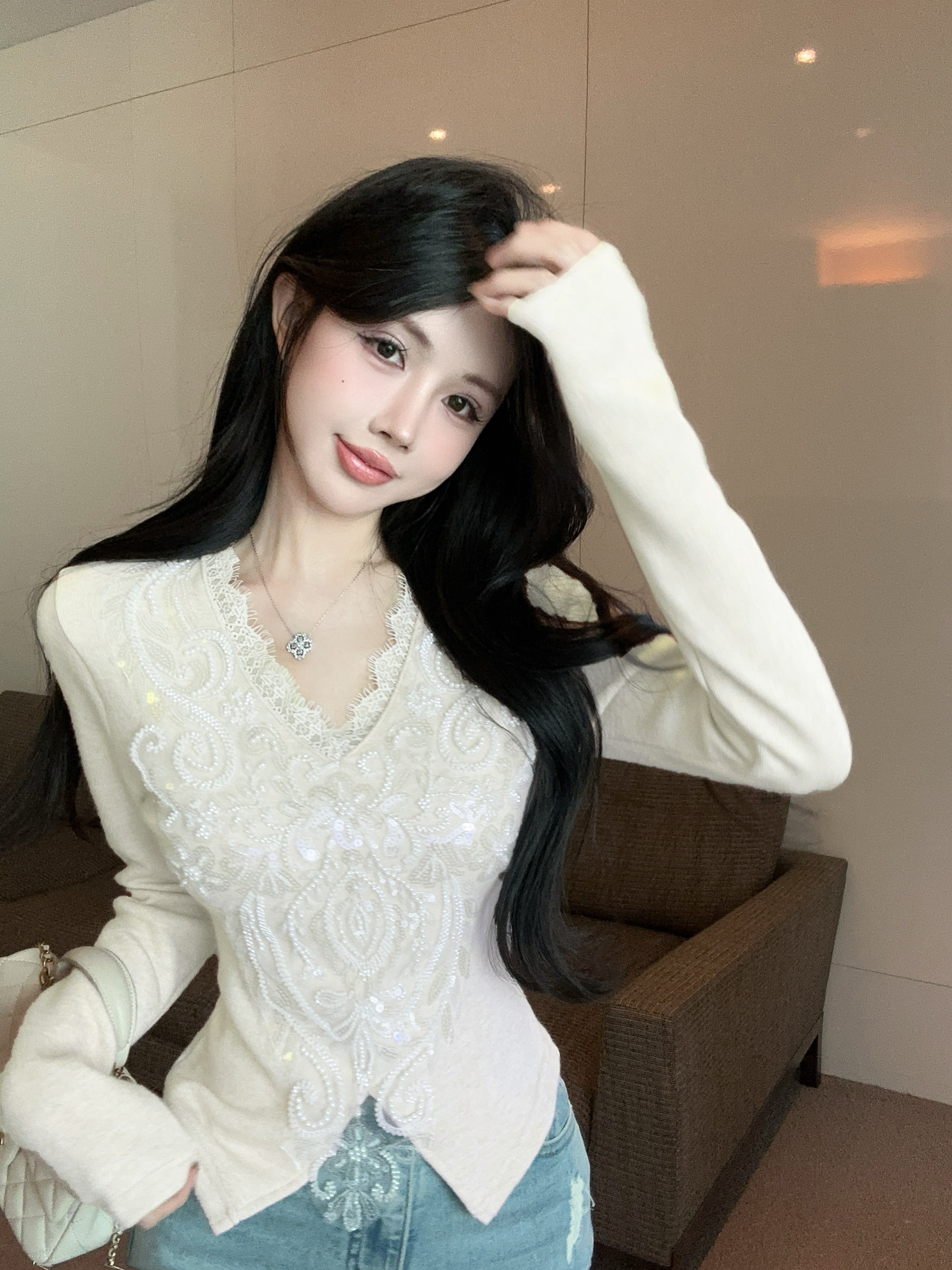 FA44541# 亮片刺绣V领设计感内搭气质上衣 服裝批發女裝批發服飾貨源