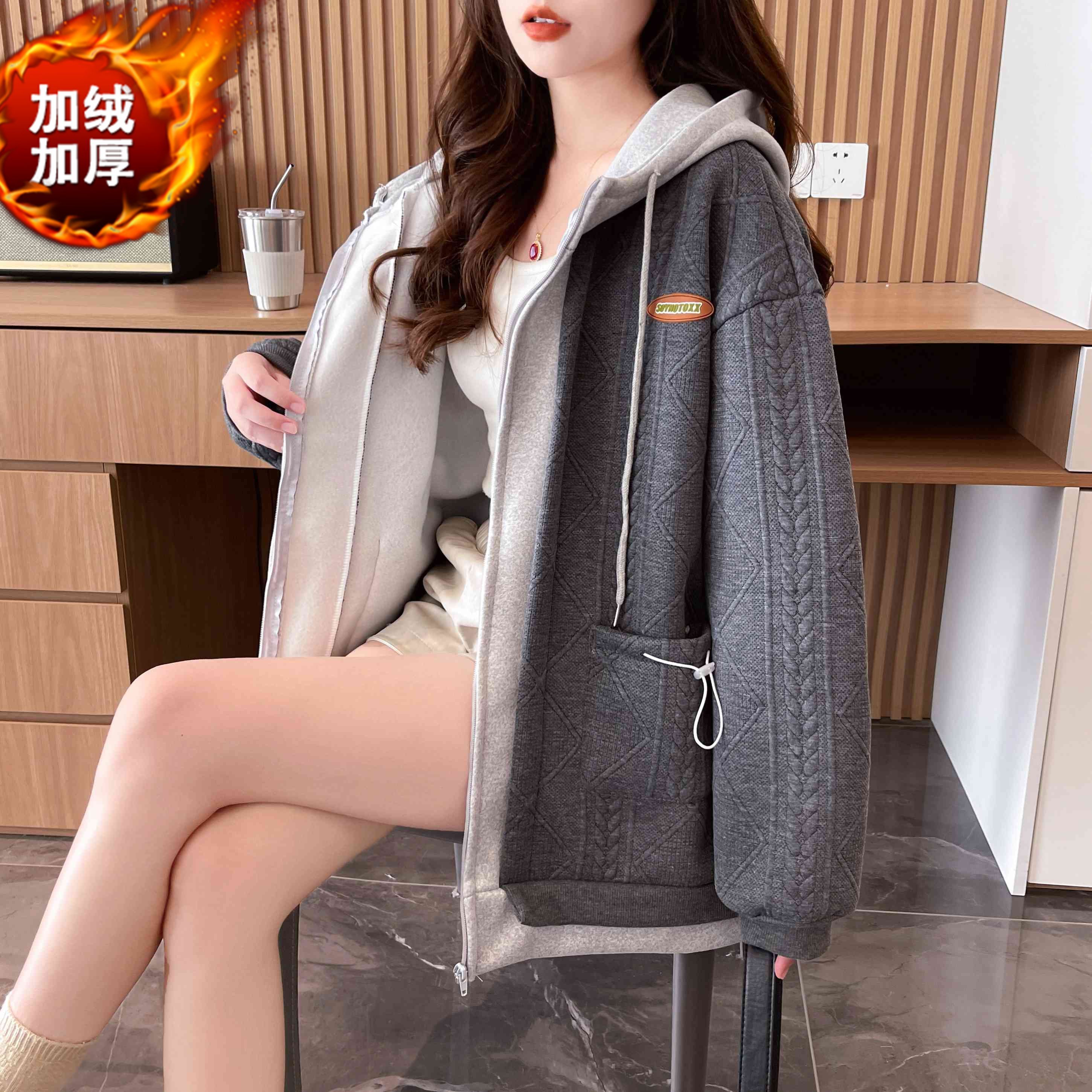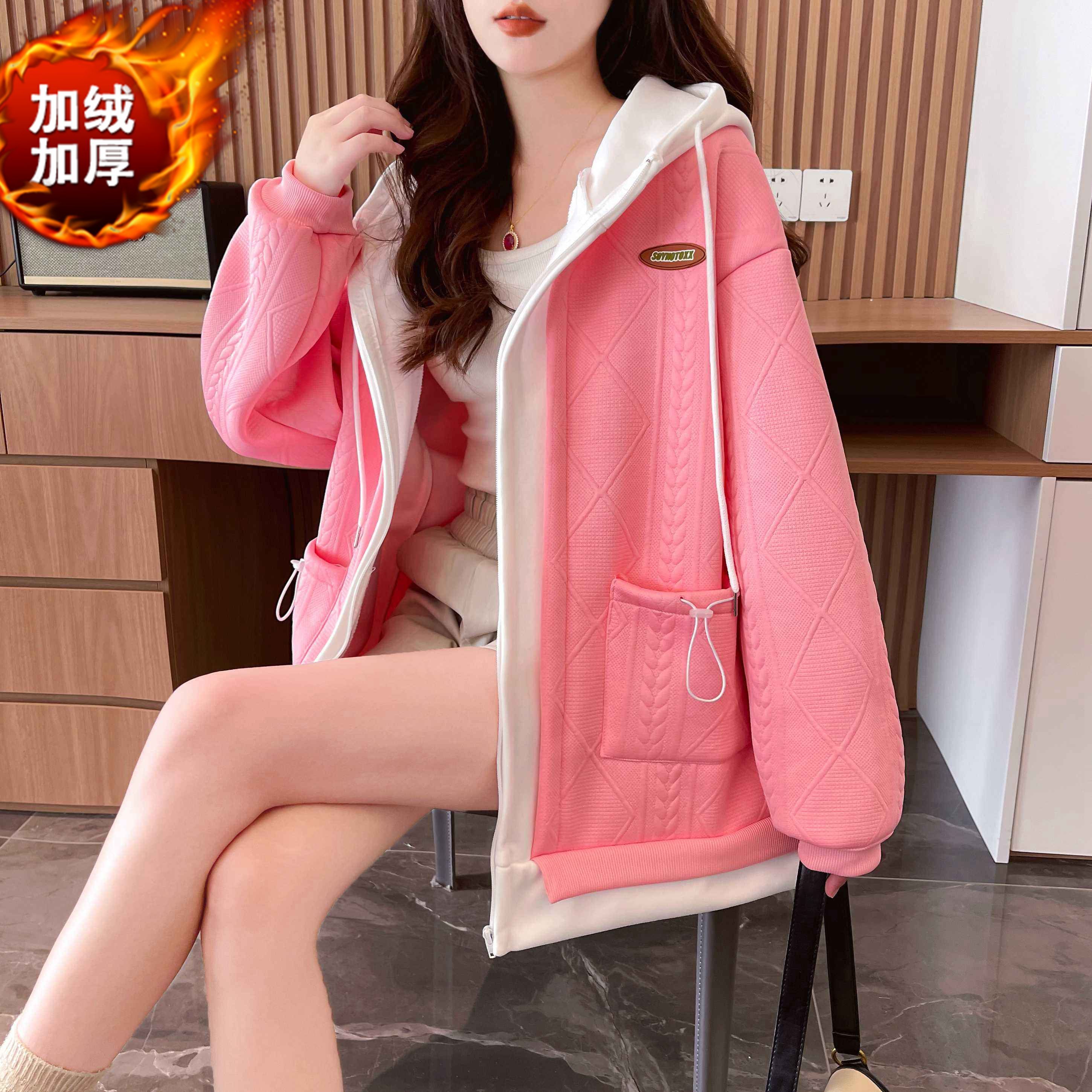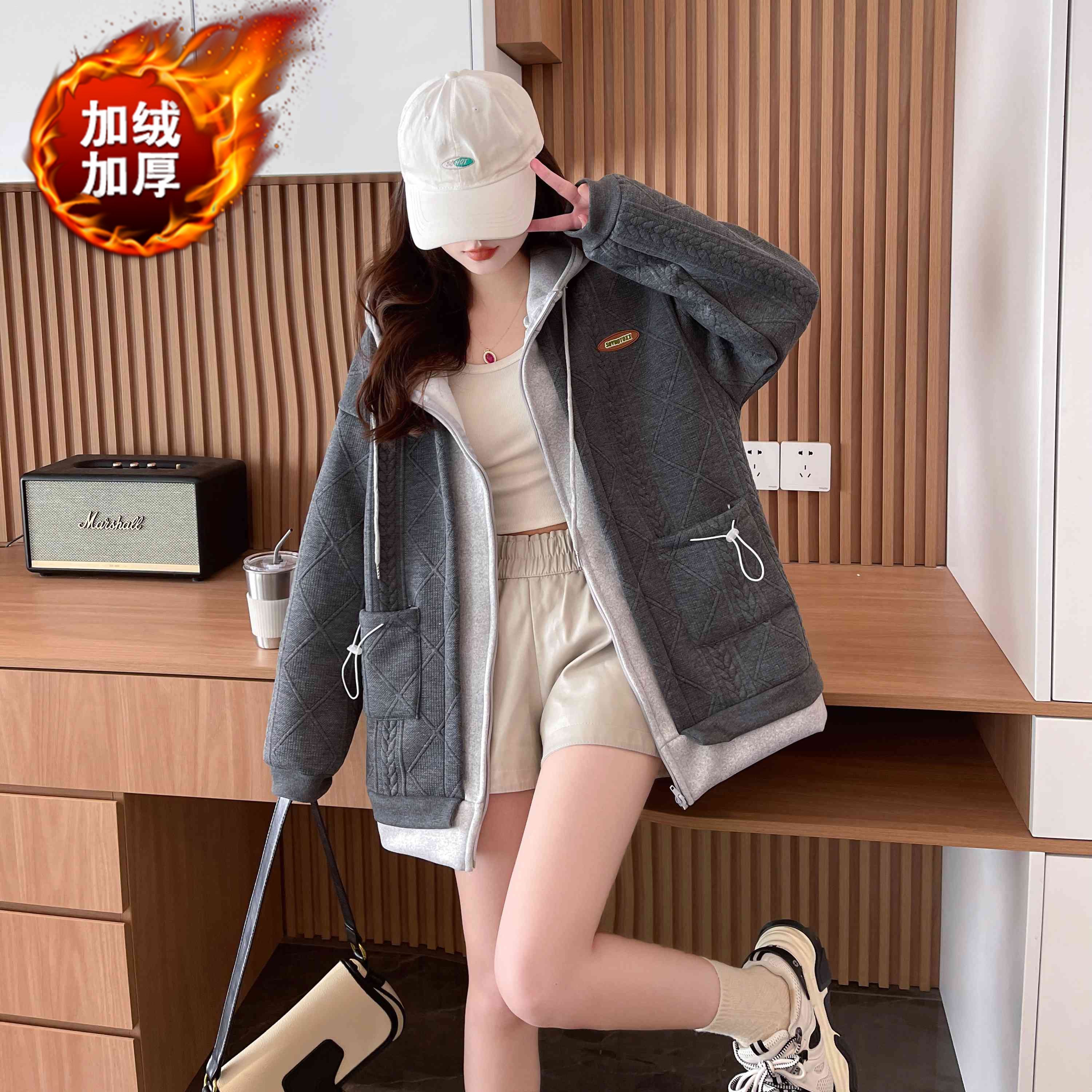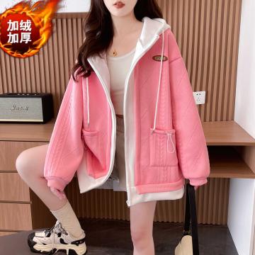 FA44814# 提花复合加绒秋冬加绒加厚假两件胖mm300斤连帽卫衣女外套 服裝批發女裝批發服飾貨源