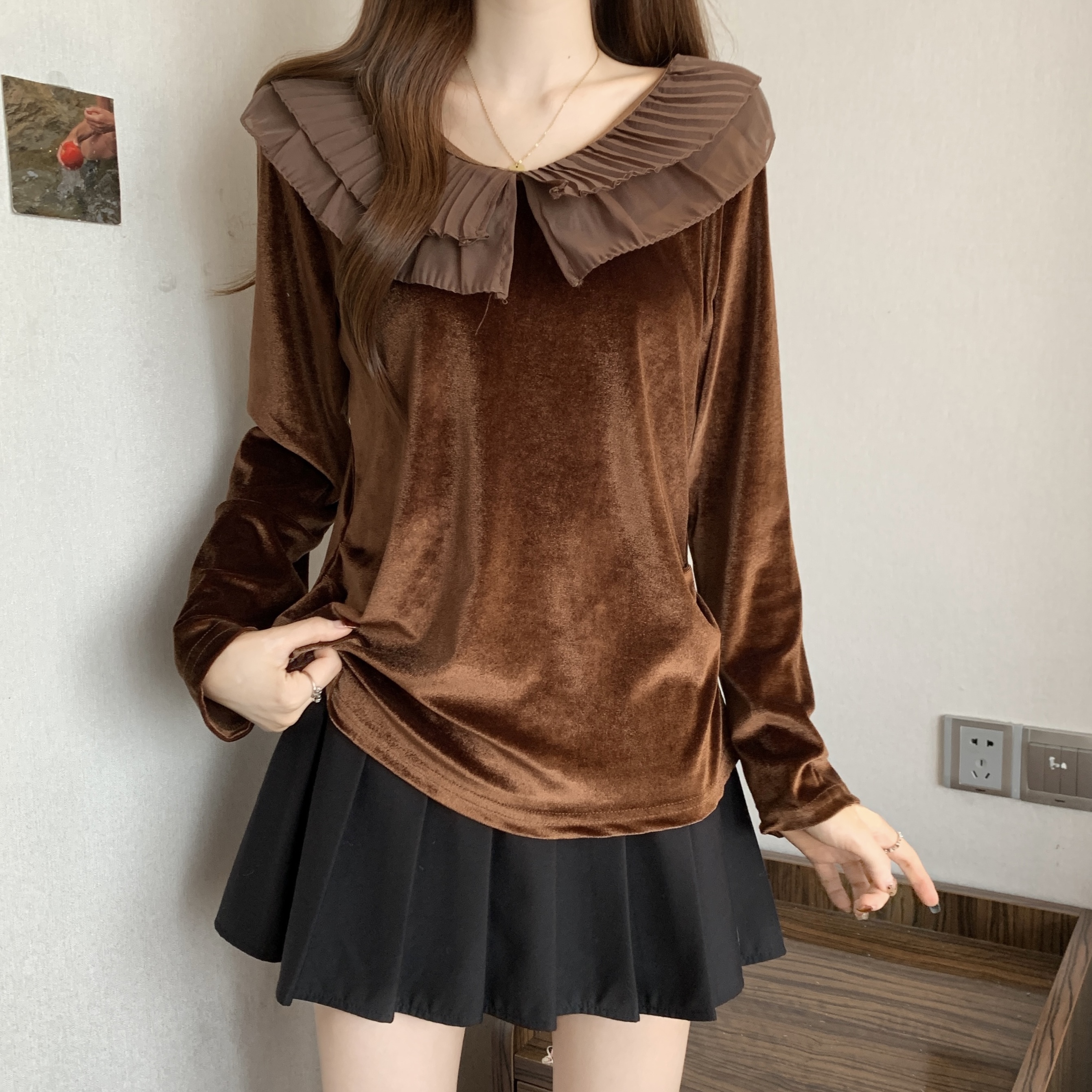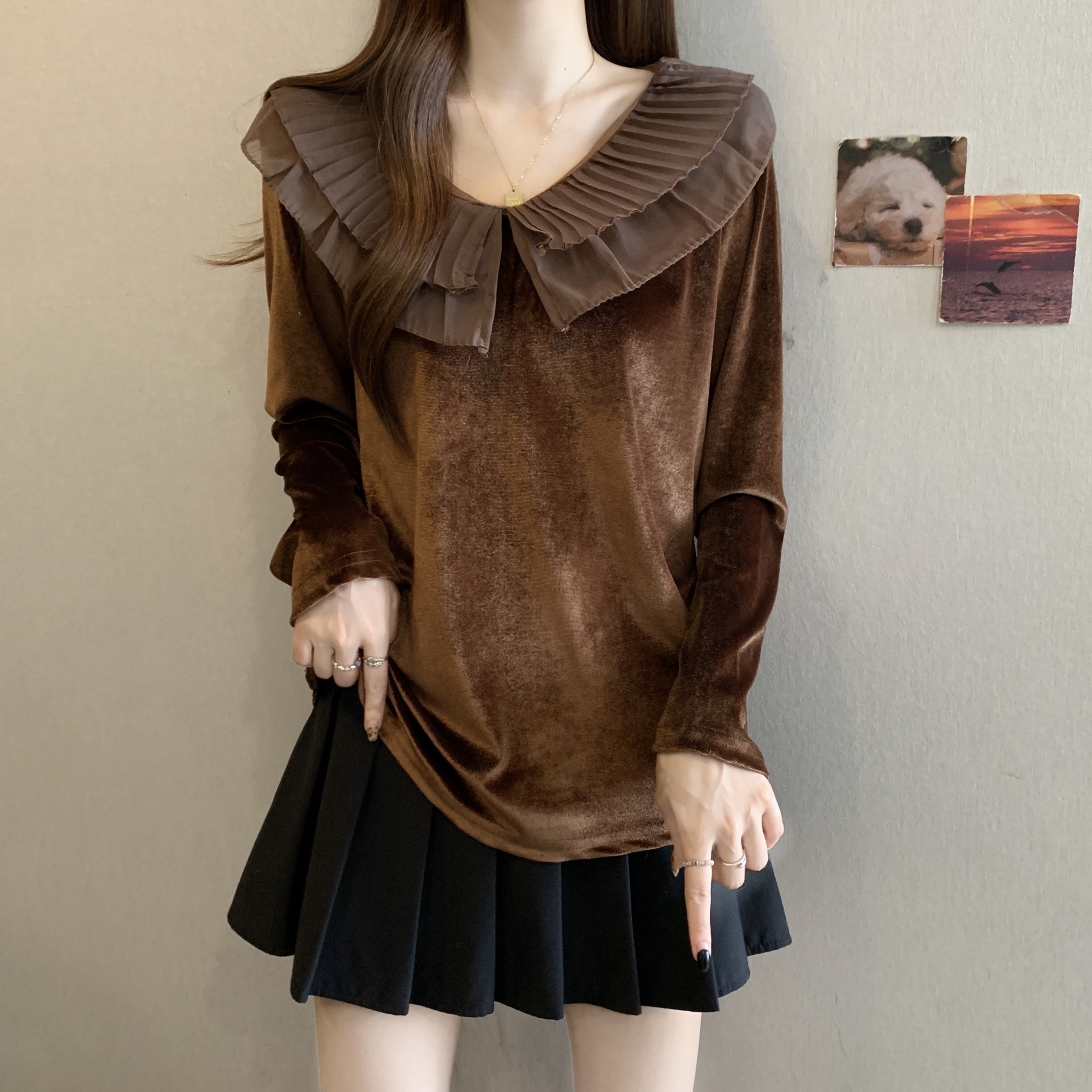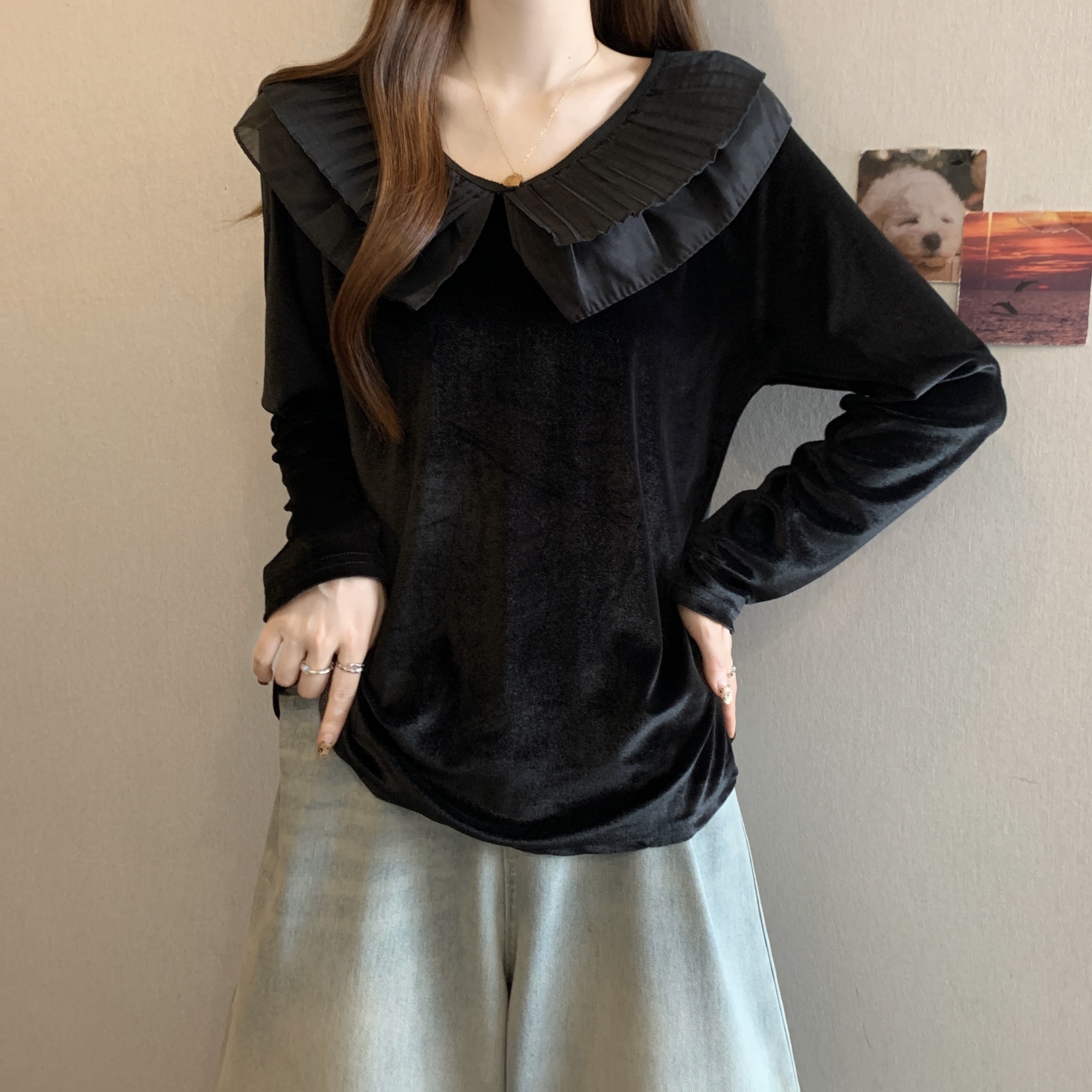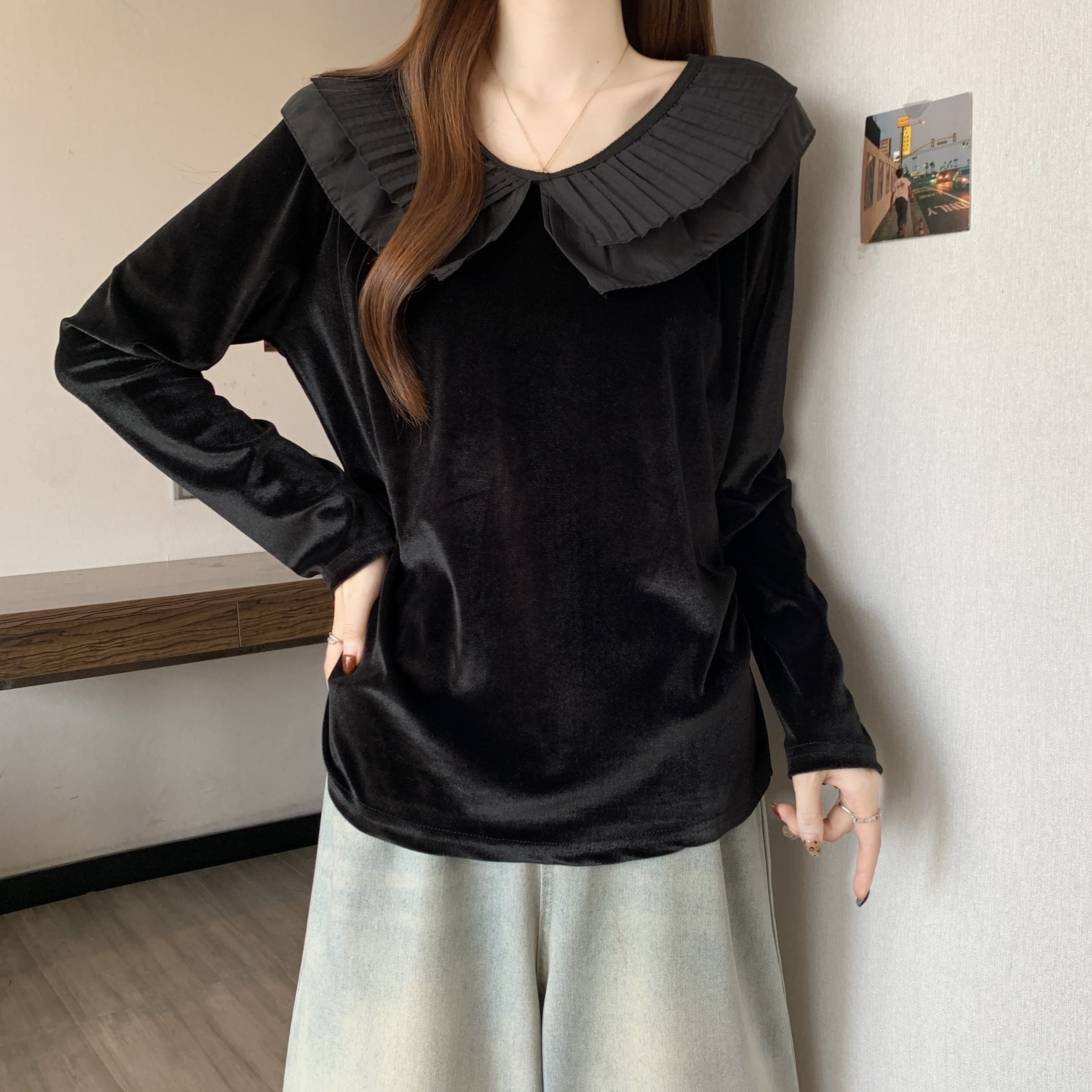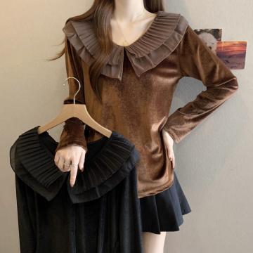 FA44822# 大码法式荷叶边拼接丝绒洋气T恤秋季新款胖mm减龄显瘦上衣 服裝批發女裝批發服飾貨源