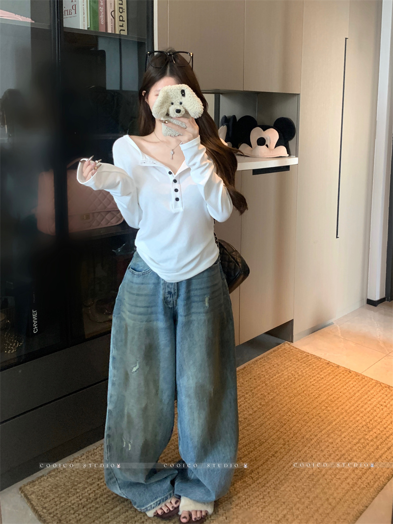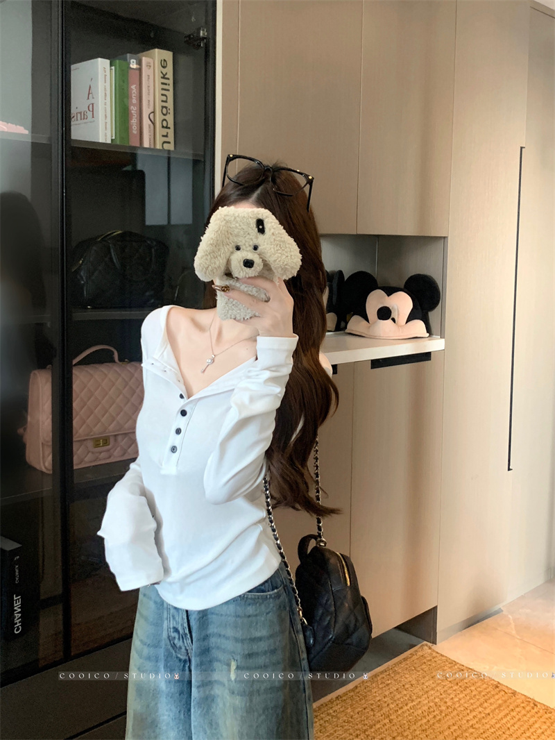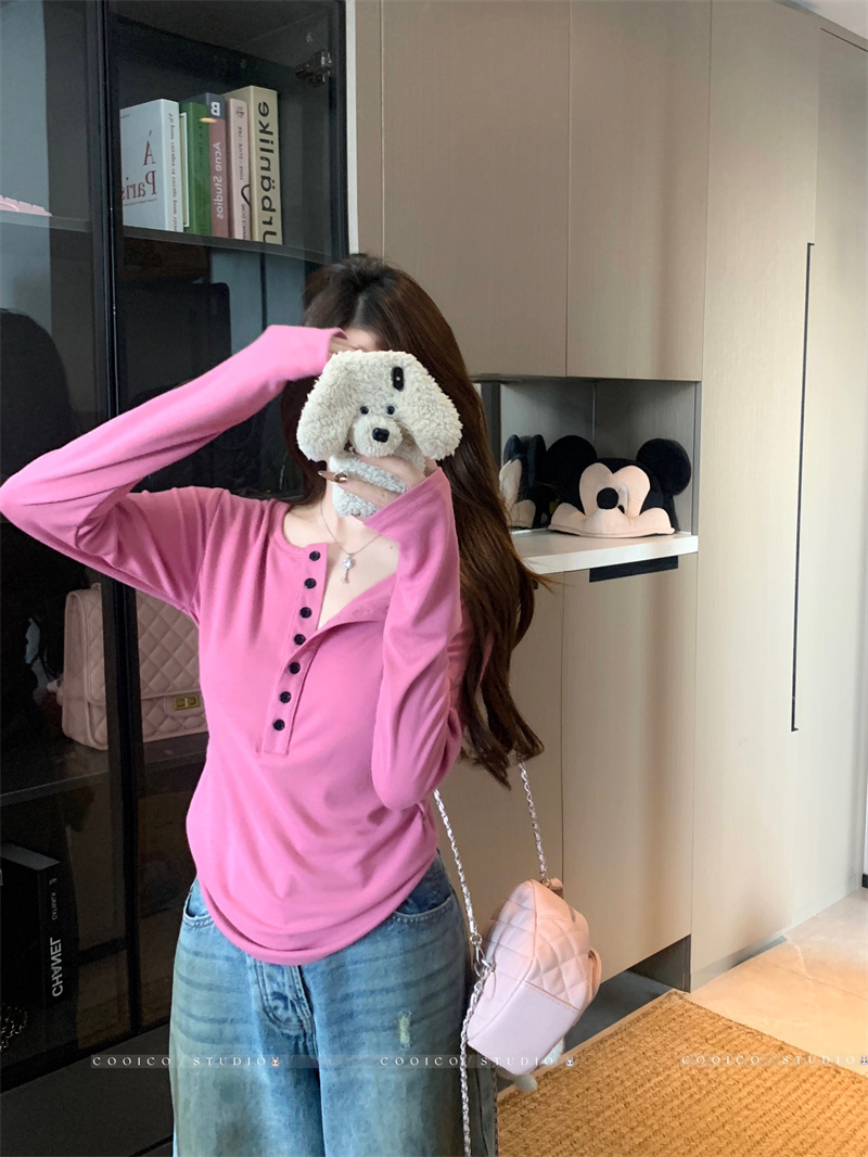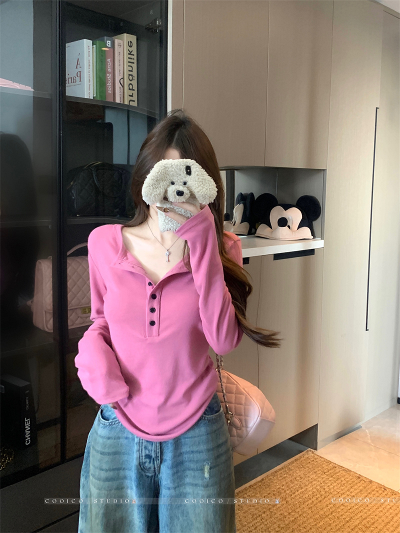 FA44854# 设计感纯色纽扣半开领长袖T恤女装秋季宽松百搭休闲上衣 服裝批發女裝批發服飾貨源