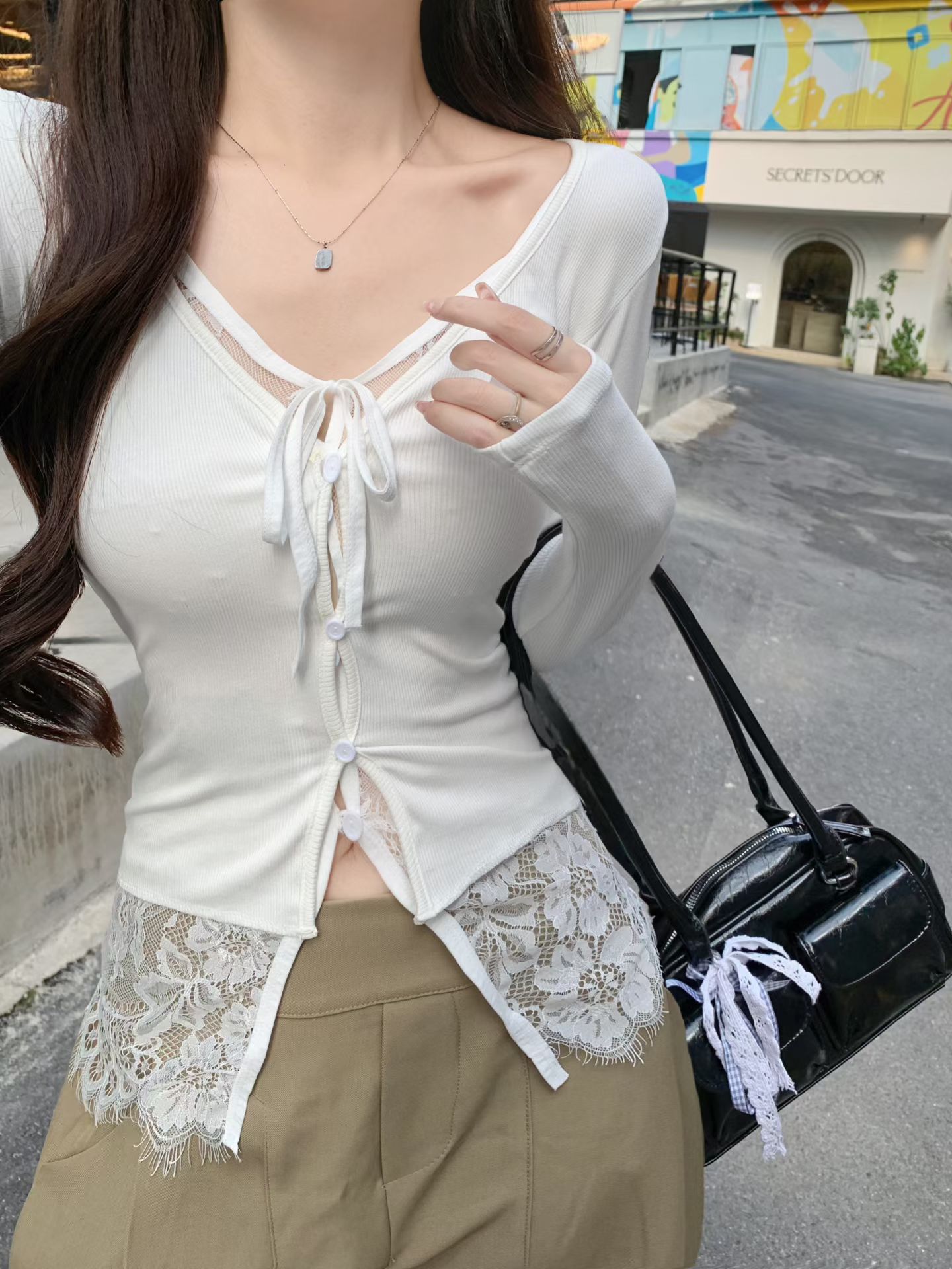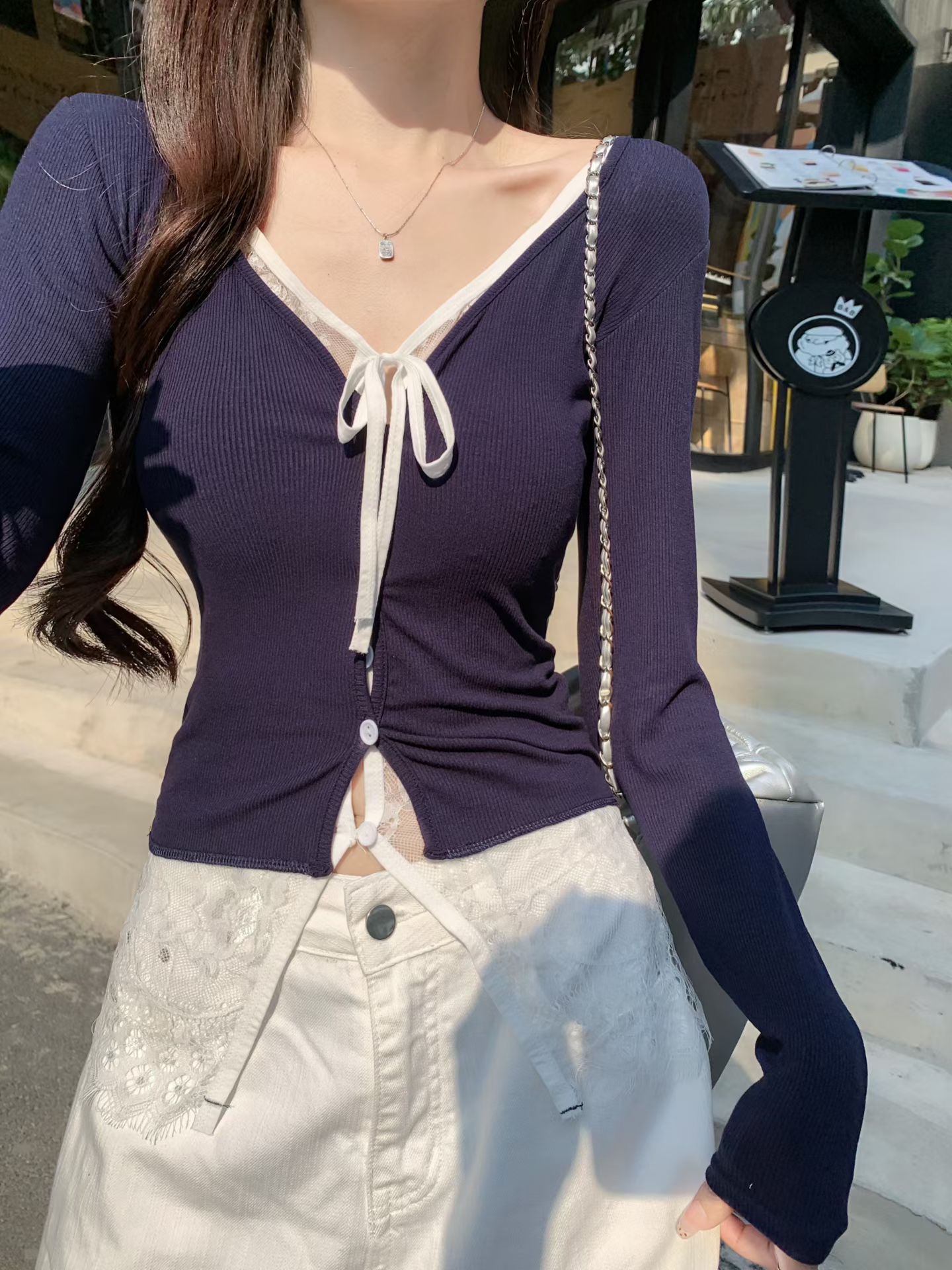 FA44855# 蕾丝拼接假两件长袖V领T恤女早秋季纯欲风甜辣妹修身针织开衫上衣 服裝批發女裝批發服飾貨源