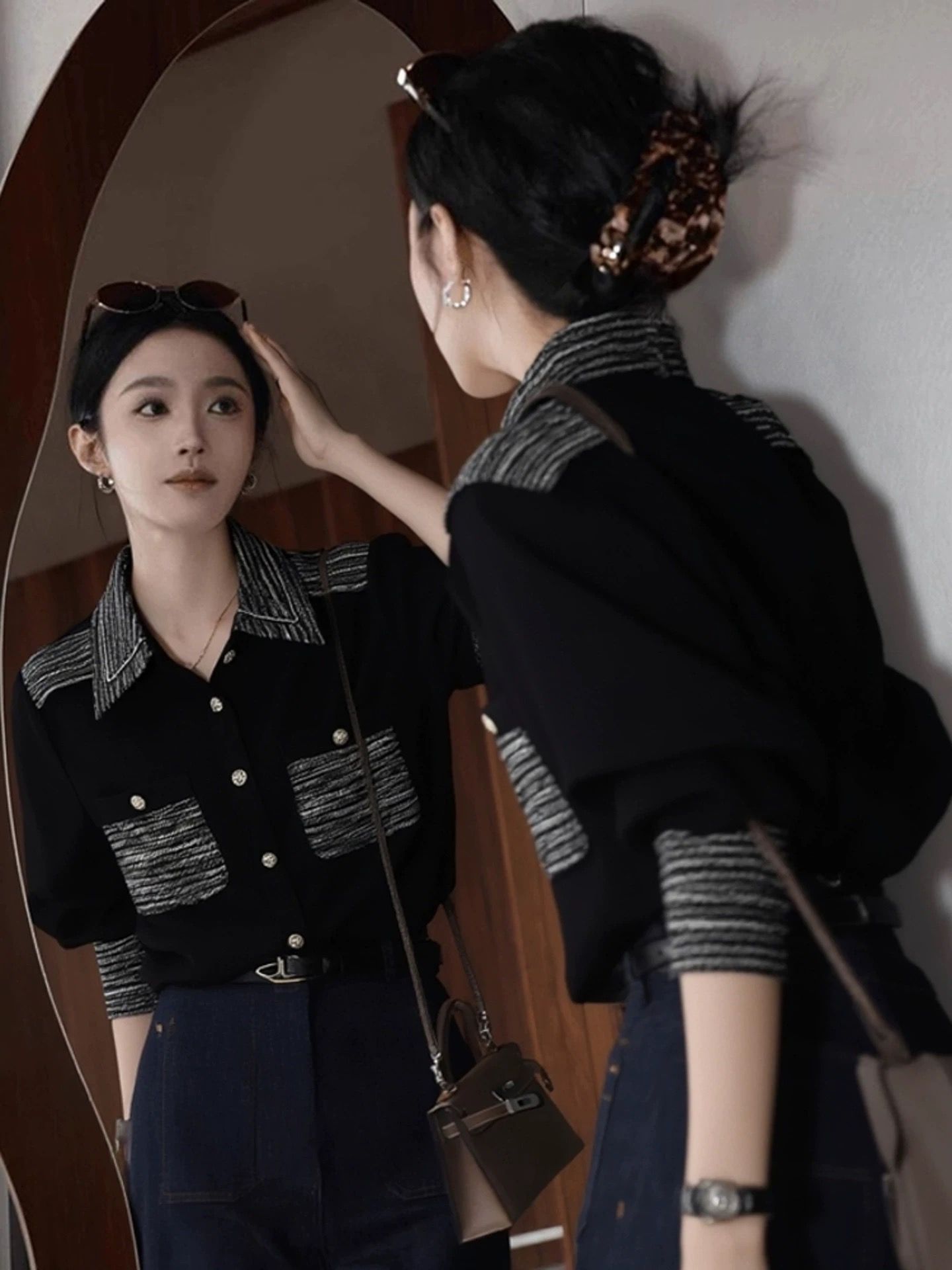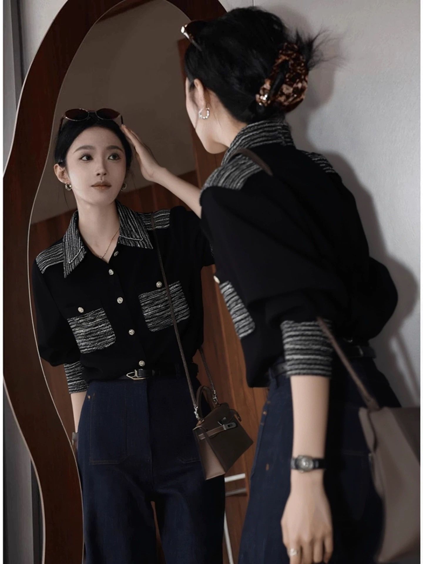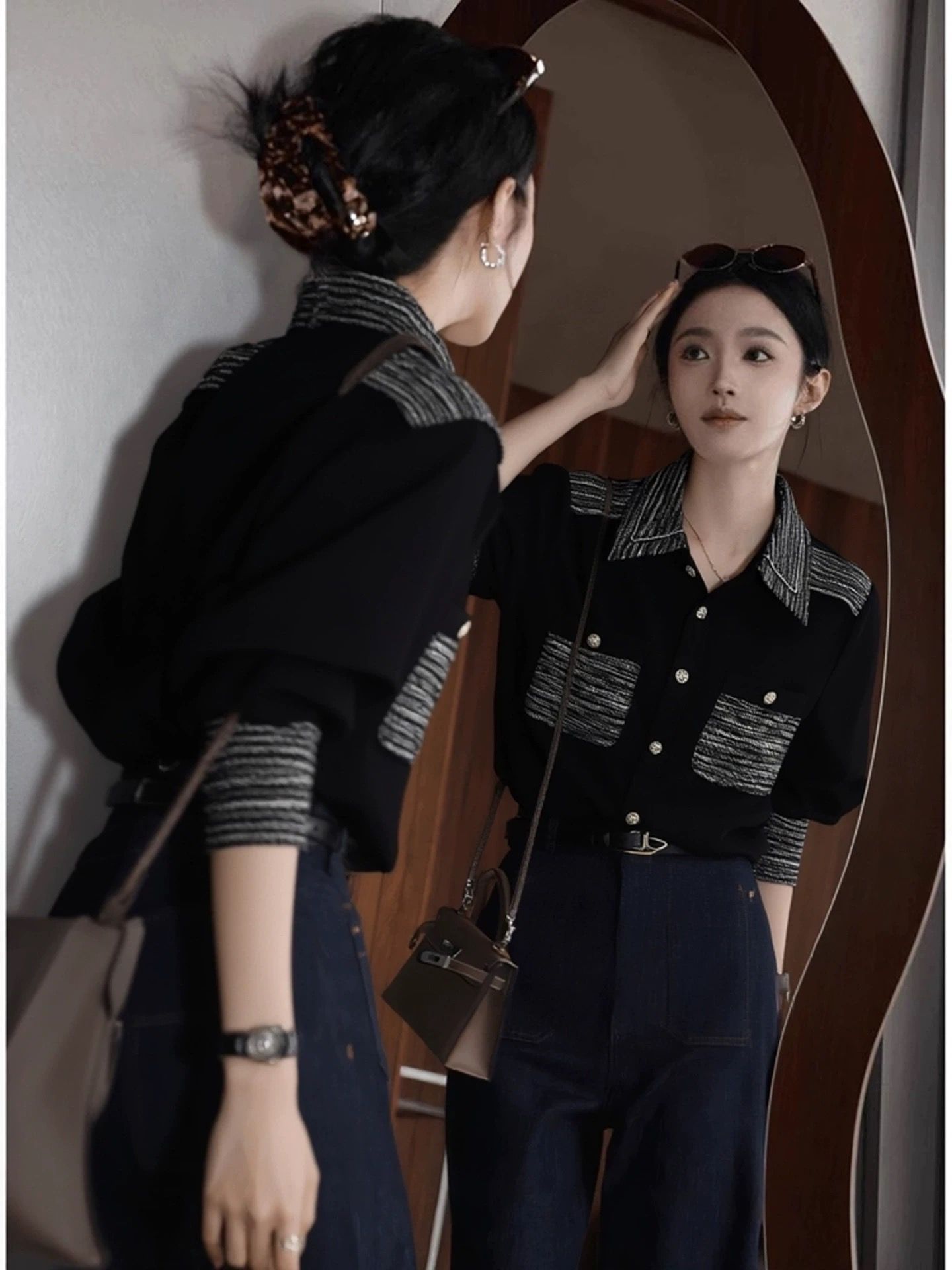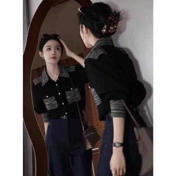FA44982# 法式气质翻领黑色拼接长袖衬衫女设计感秋冬独特漂亮绝美正肩上衣 服裝批發女裝批發服飾貨源