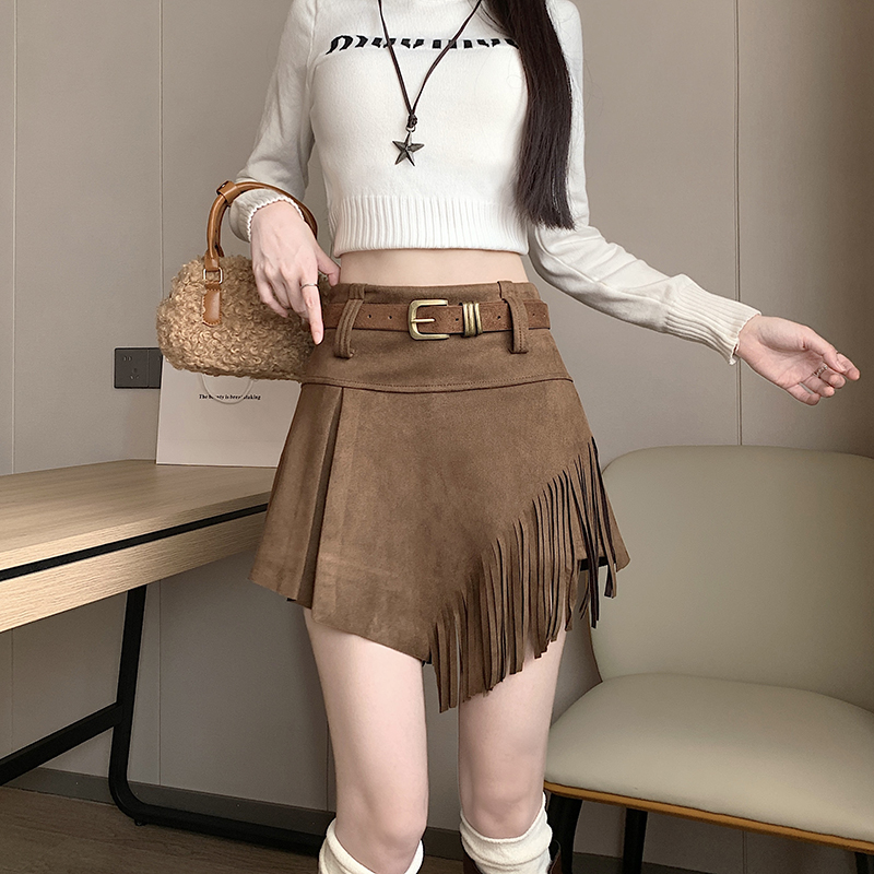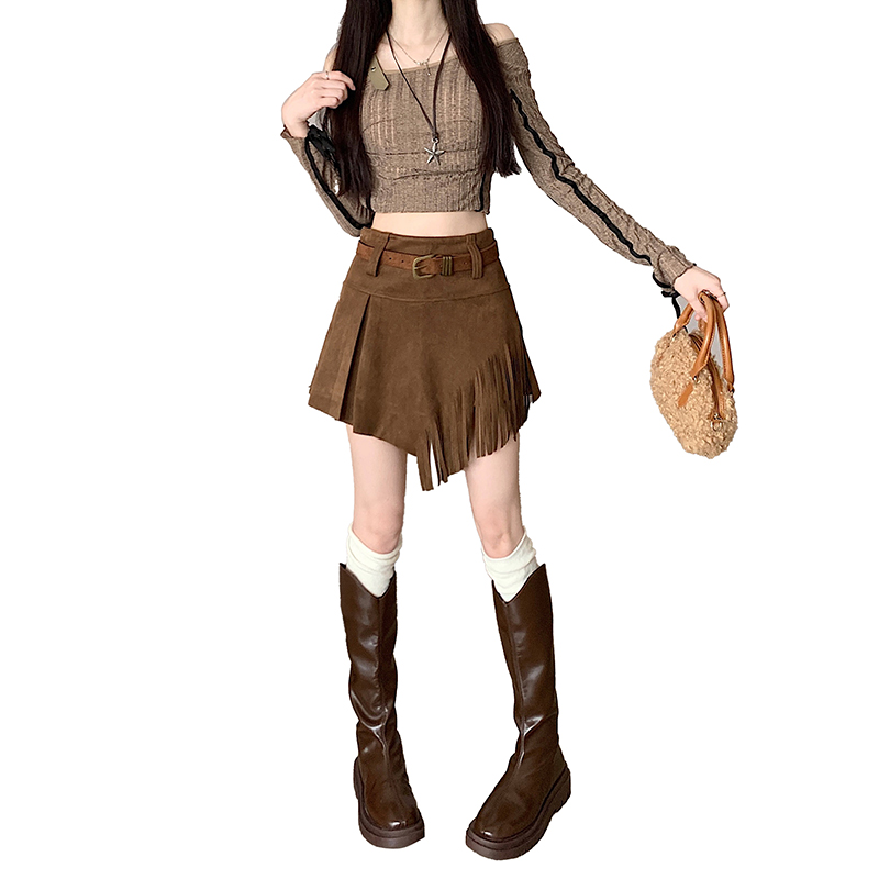 FA45000# 鹿皮绒短裙半身裙女秋冬新款高腰流苏拼接a字一步包臀裙 服裝批發女裝批發服飾貨源