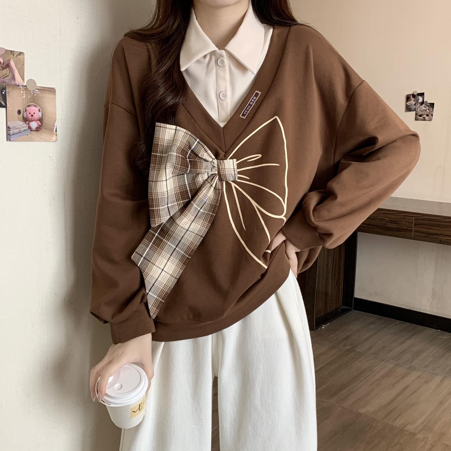 FA45337# 曼巴棉涤纶秋季薄款拼接假两件蝴蝶结上衣卫衣女 服裝批發女裝批發服飾貨源