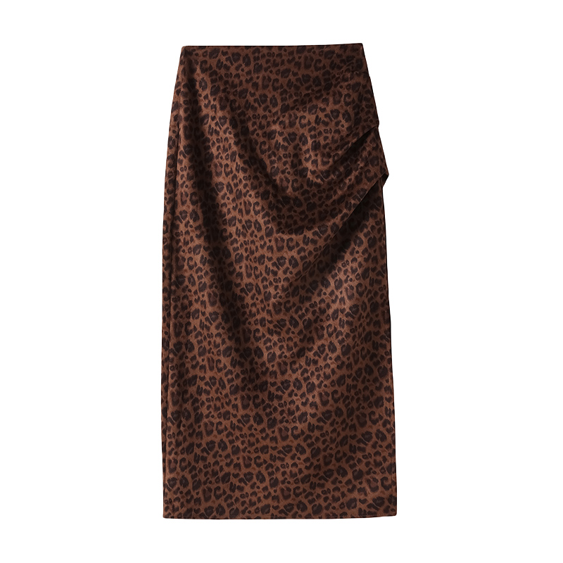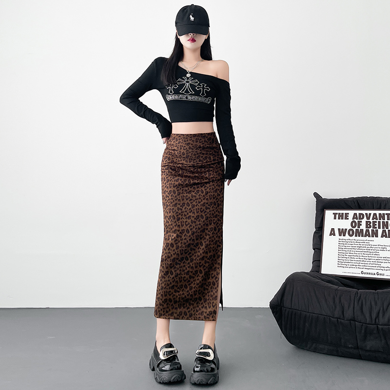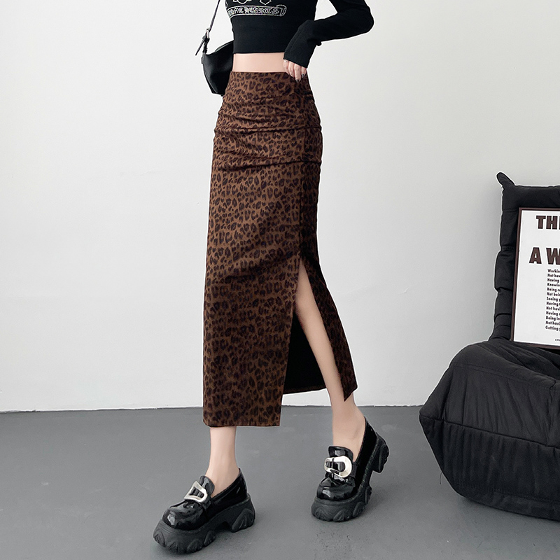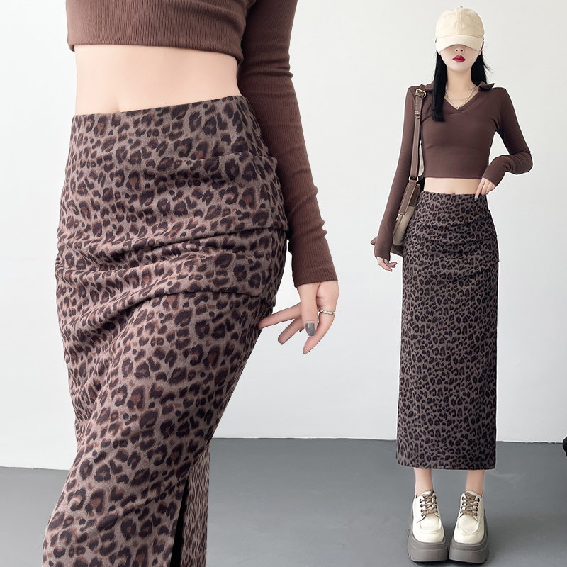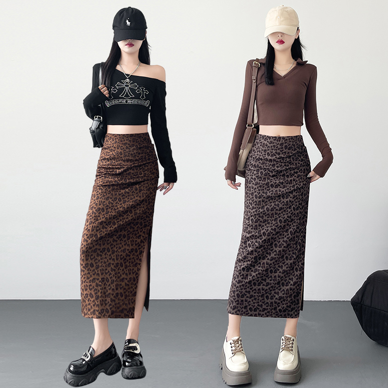 FA45352# 高腰开叉包臀裙半身裙女秋冬新款气质豹纹A字裙中长款裙子潮 服裝批發女裝批發服飾貨源