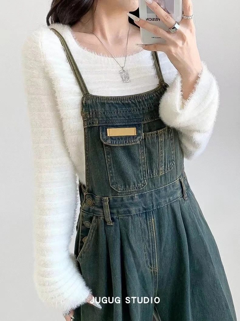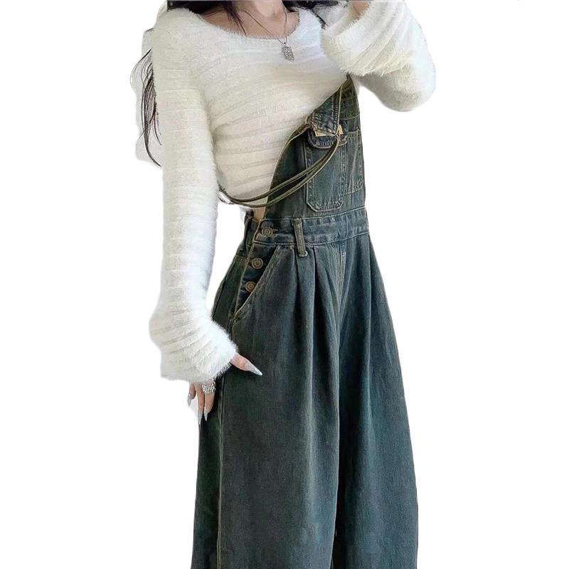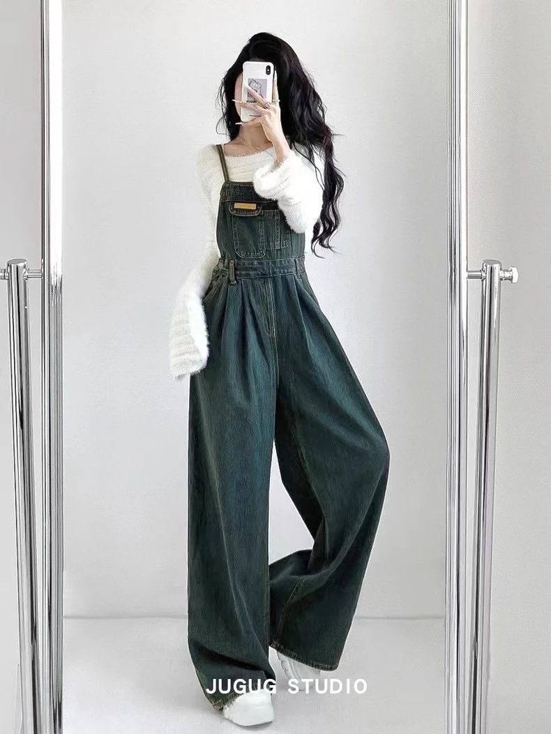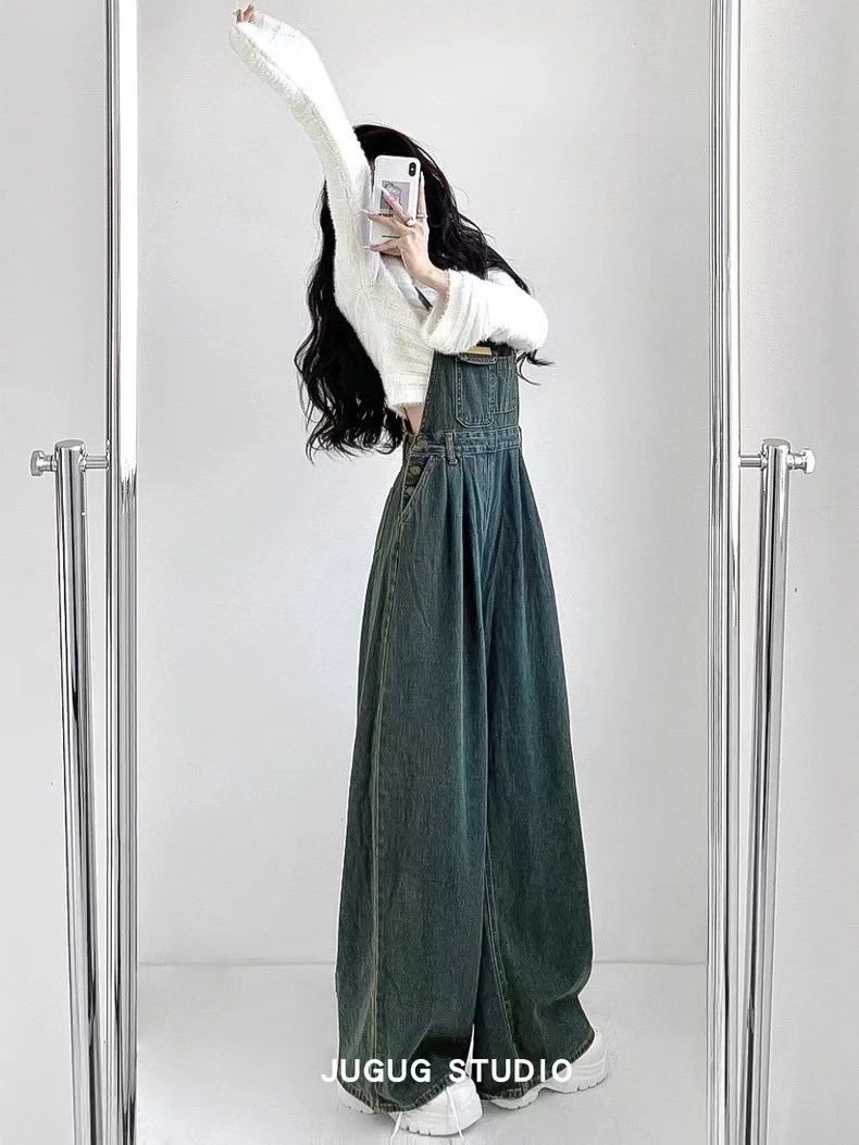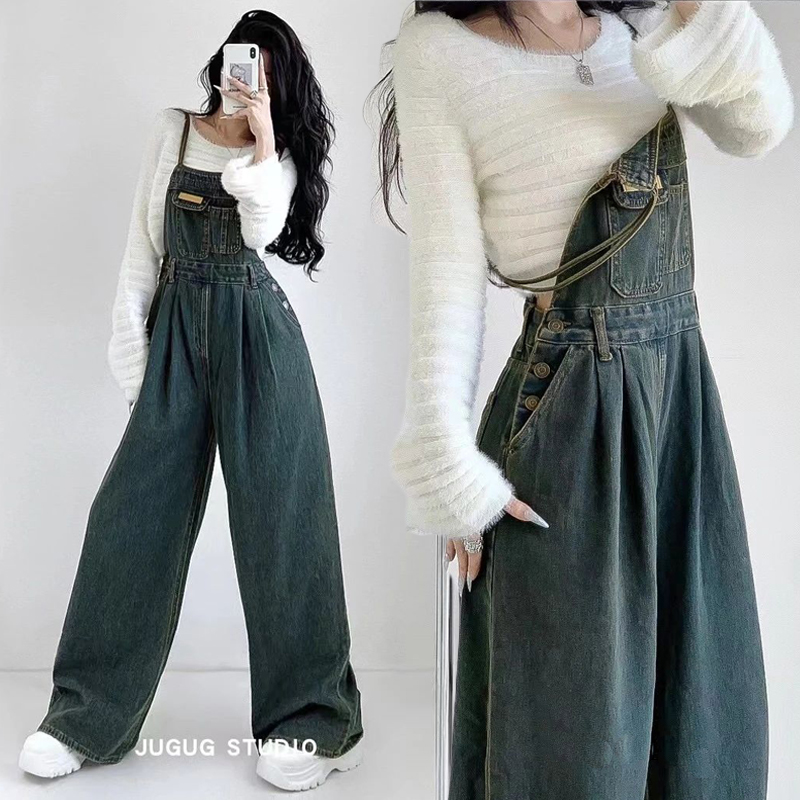 大码复古高腰牛仔背带裤女秋冬新款设计感显瘦宽松直筒阔腿连体裤 服裝批發女裝批發服飾貨源
