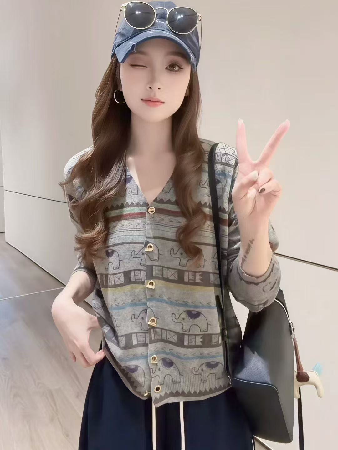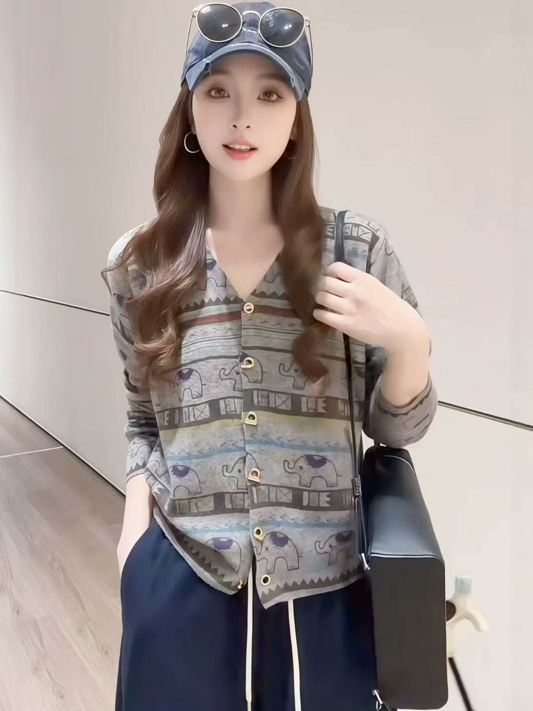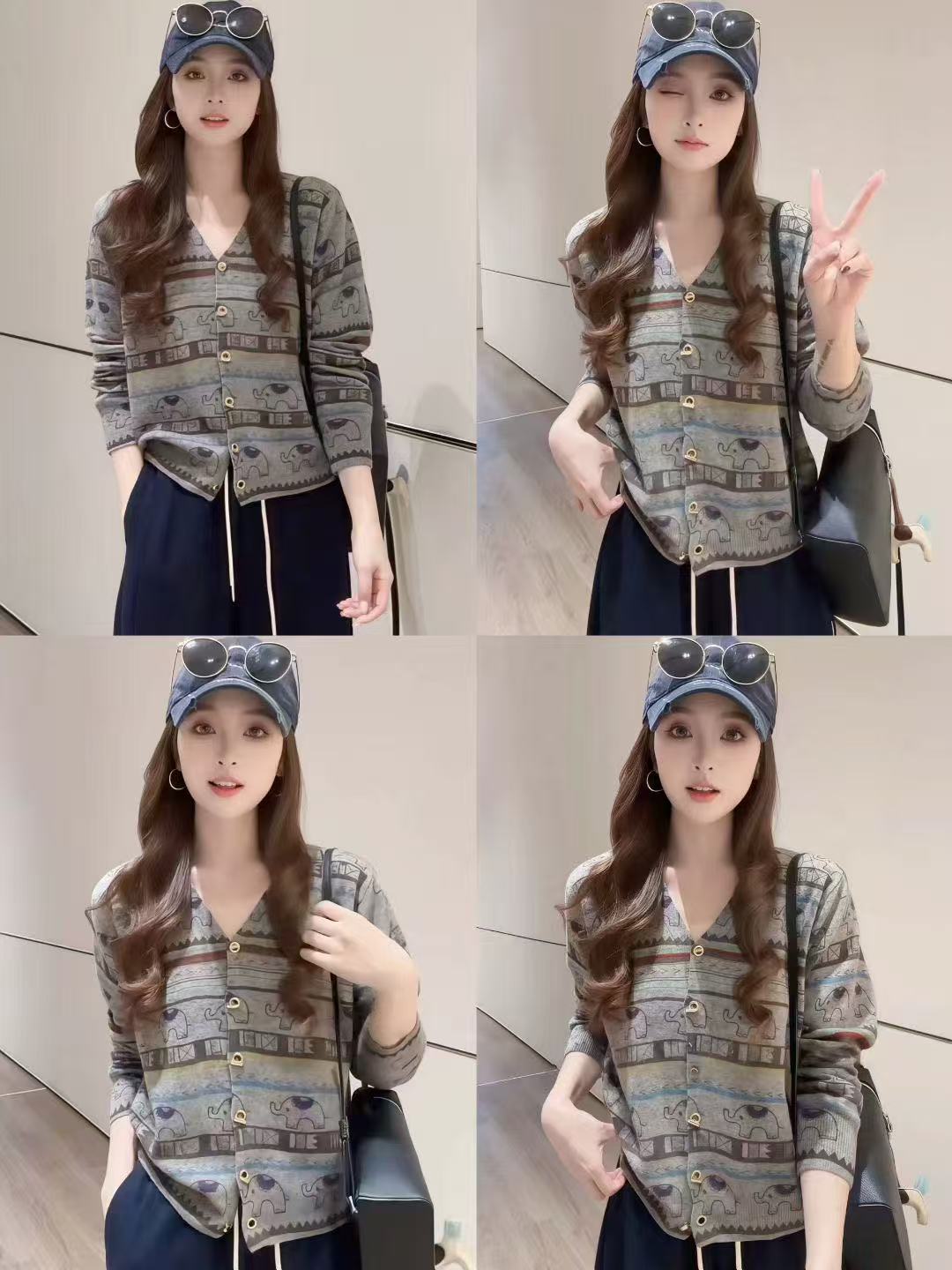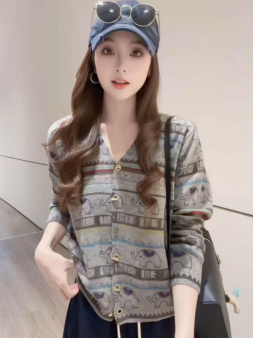 FA45368# 秋季复古洋气显瘦慵懒风撞色软糯V领大象印花针织毛衣外套 服裝批發女裝批發服飾貨源