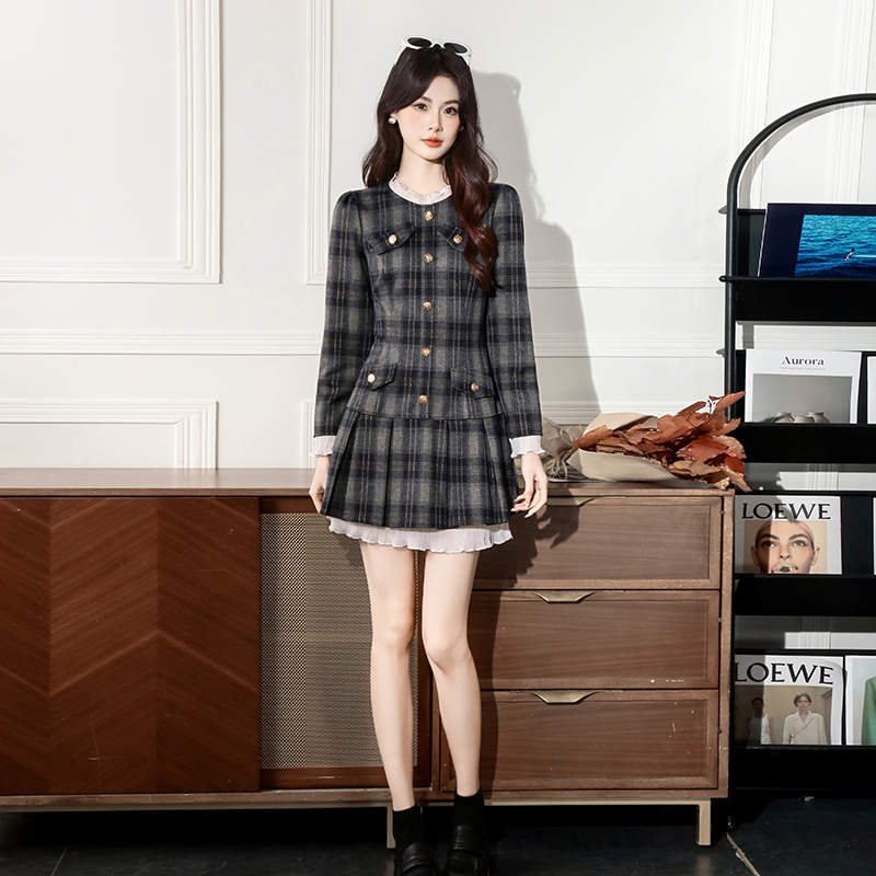 FA45369# 秋季新款甜美减龄荷叶领短款格子印花连衣裙 服裝批發女裝批發服飾貨源