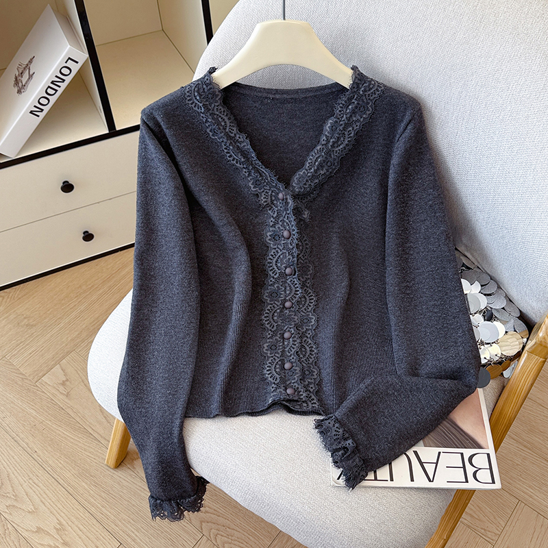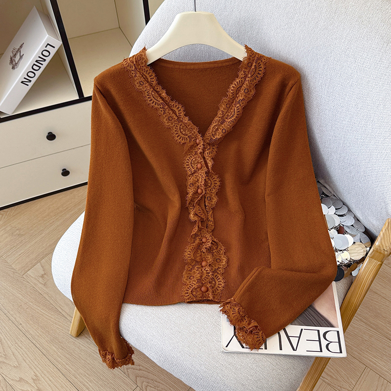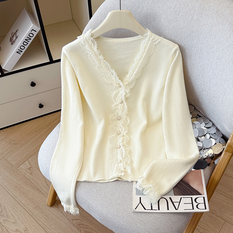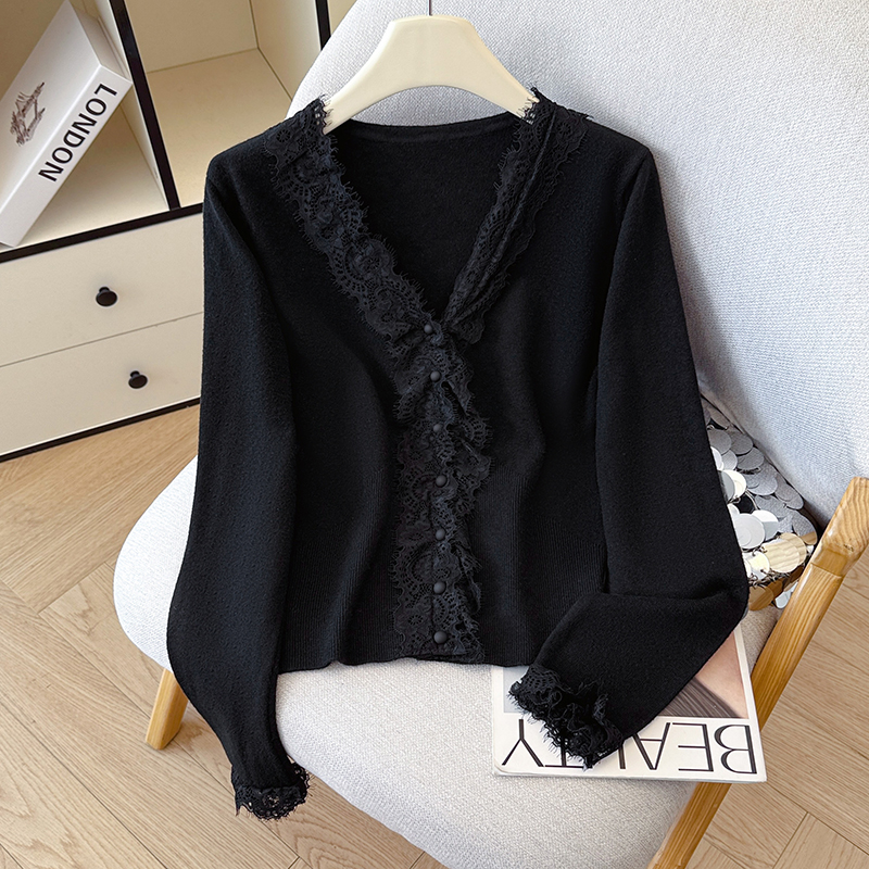 FA45376# 秋冬新款排扣针织衫女设计感v领蕾丝领口打底衫内搭外穿 服裝批發女裝批發服飾貨源