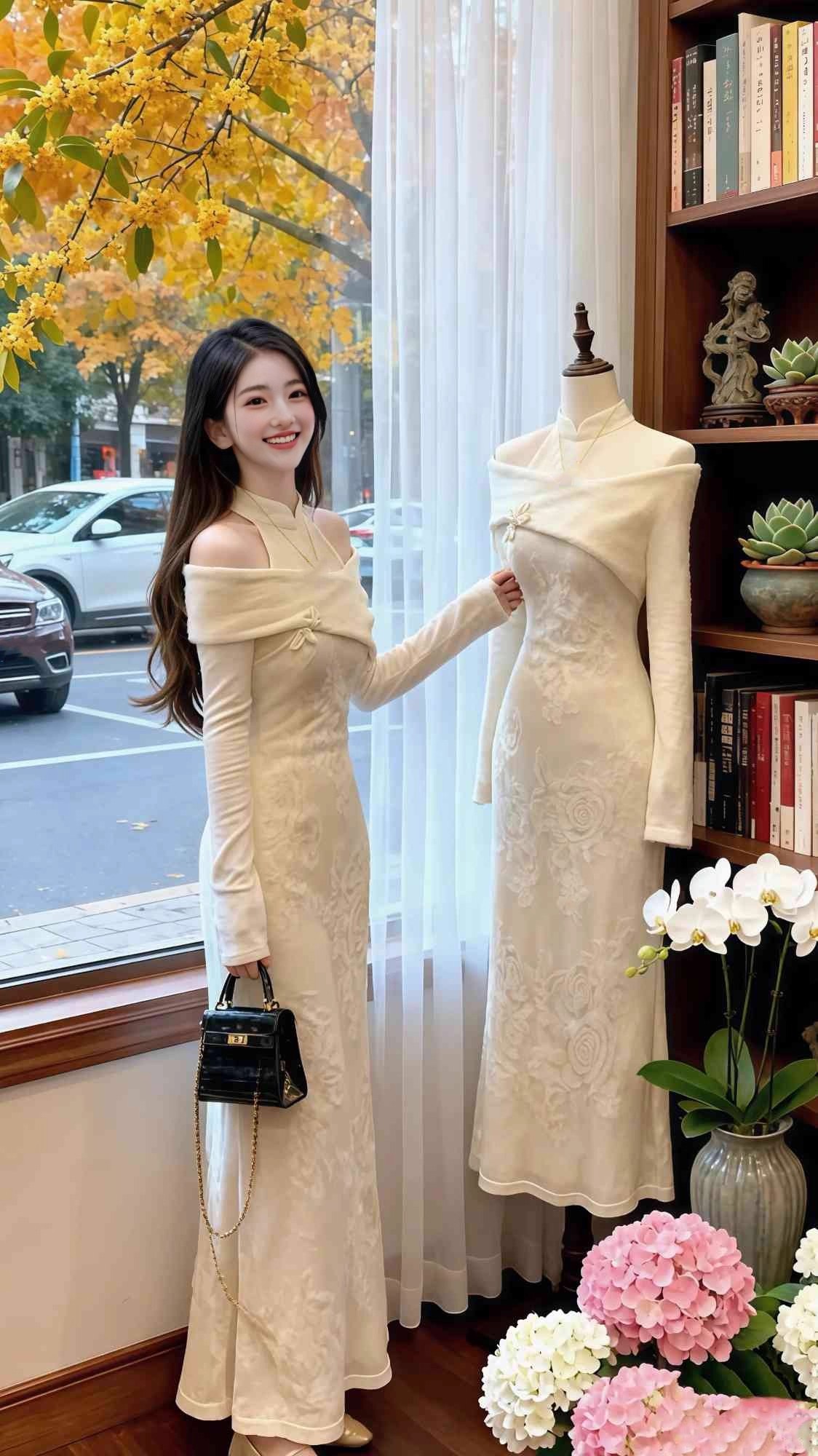 Home > 夜店裙、长袖连衣裙 > 新中式气质改良旗袍连衣裙女装春秋新款时尚露肩收腰针织长裙 服裝批發女裝批發服飾貨源
