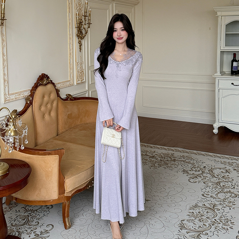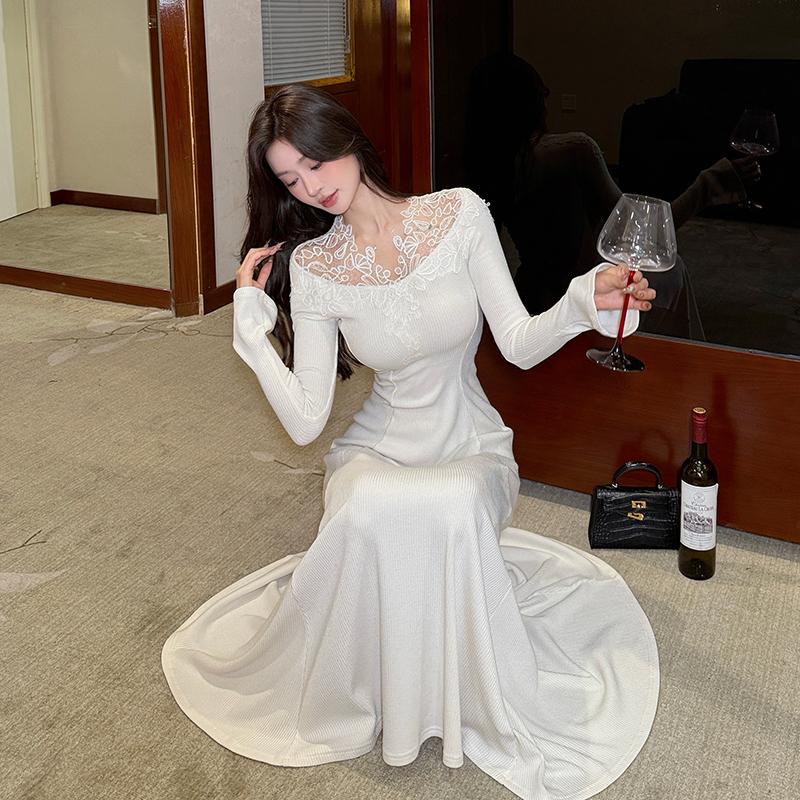 不知雪温柔氛围感蕾丝绣花v领针织连衣裙收腰显瘦a摆长裙 服裝批發女裝批發服飾貨源