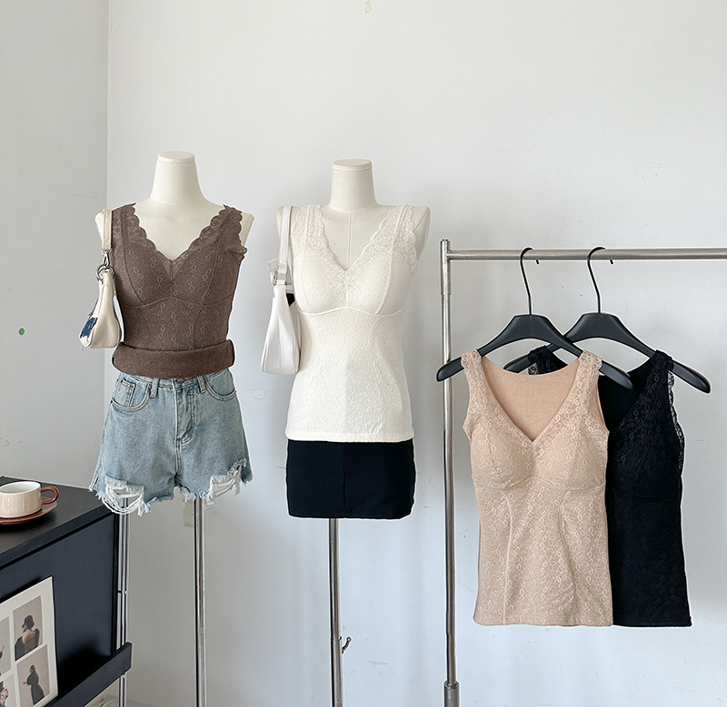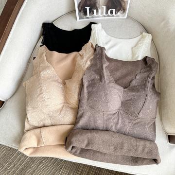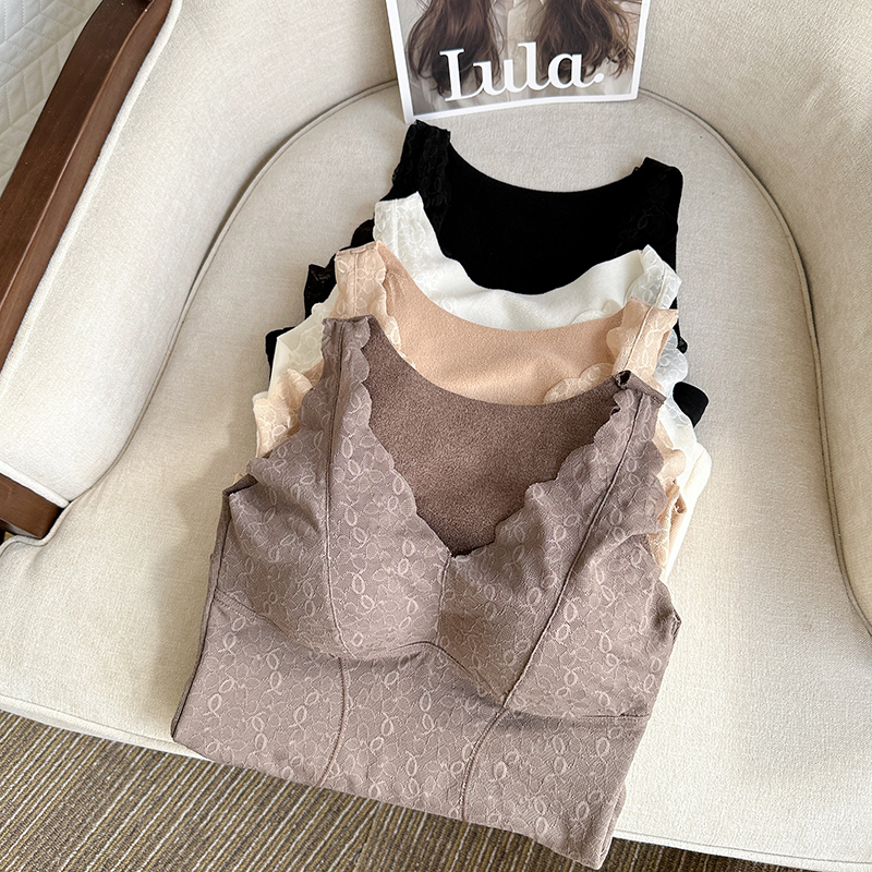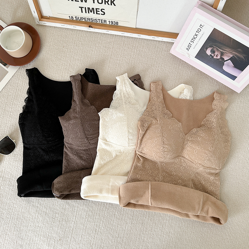 FA45237# 大码V领蕾丝加厚保暖内衣免穿文胸固定杯打底长内搭吊带背心 服裝批發女裝批發服飾貨源