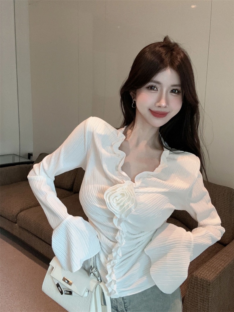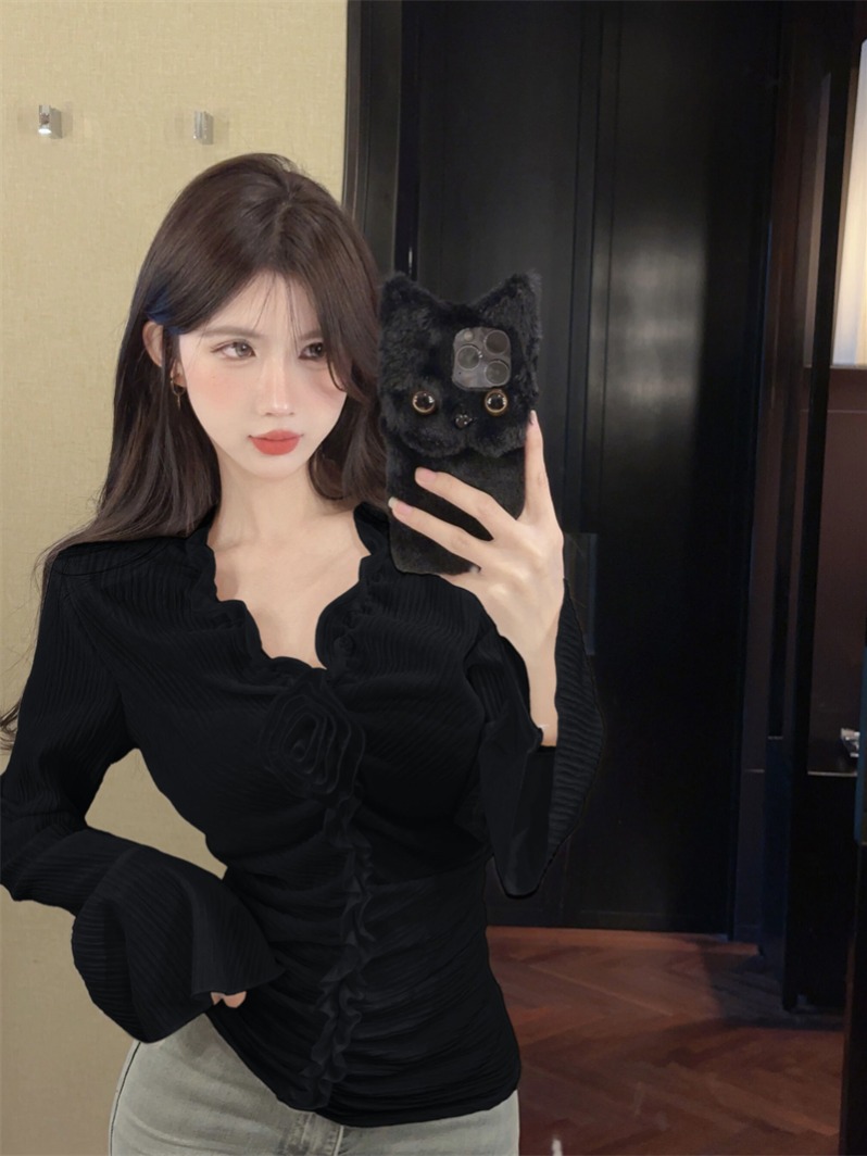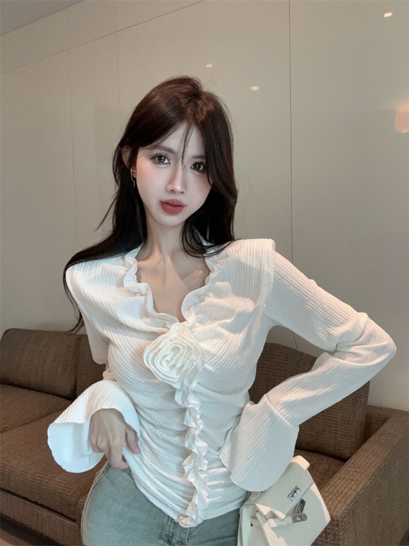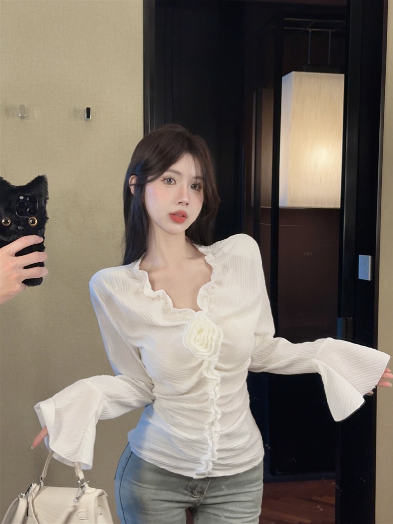 Home > 长袖雪纺衫、衬衫、上衣 > FA45378# 新款轻熟风V领褶皱花朵喇叭袖打底衫百搭上衣 服裝批發女裝批發服飾貨源
