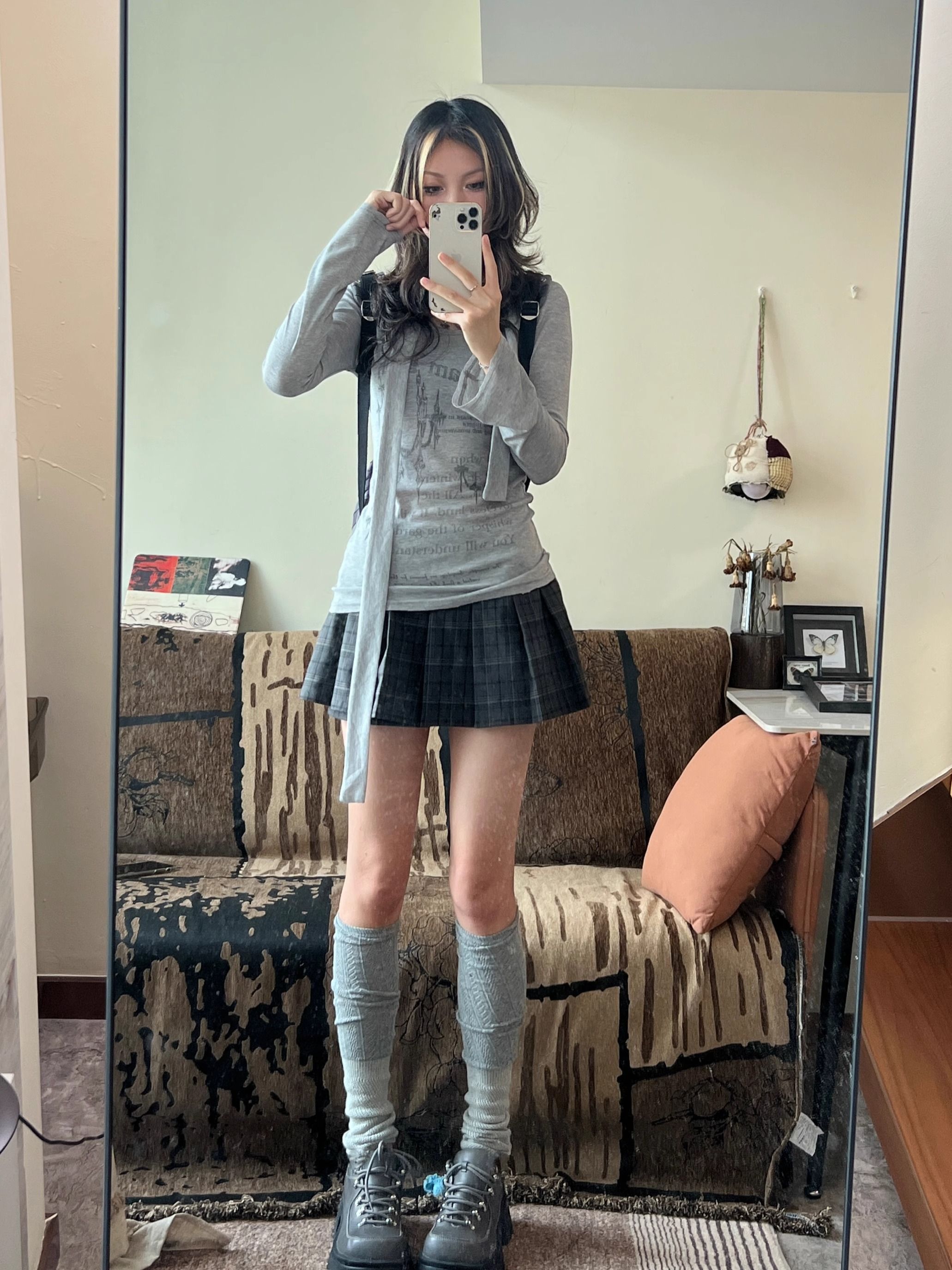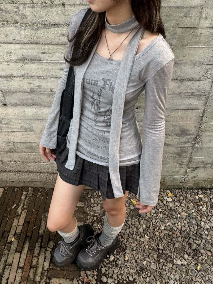 FA45388# 灰色飘带长袖t恤女秋季新款辣妹设计感创意字母印花修身显瘦上衣 服裝批發女裝批發服飾貨源