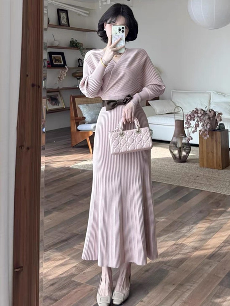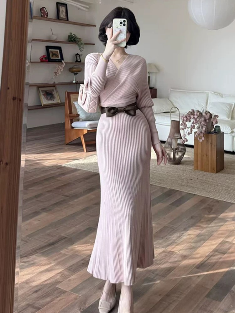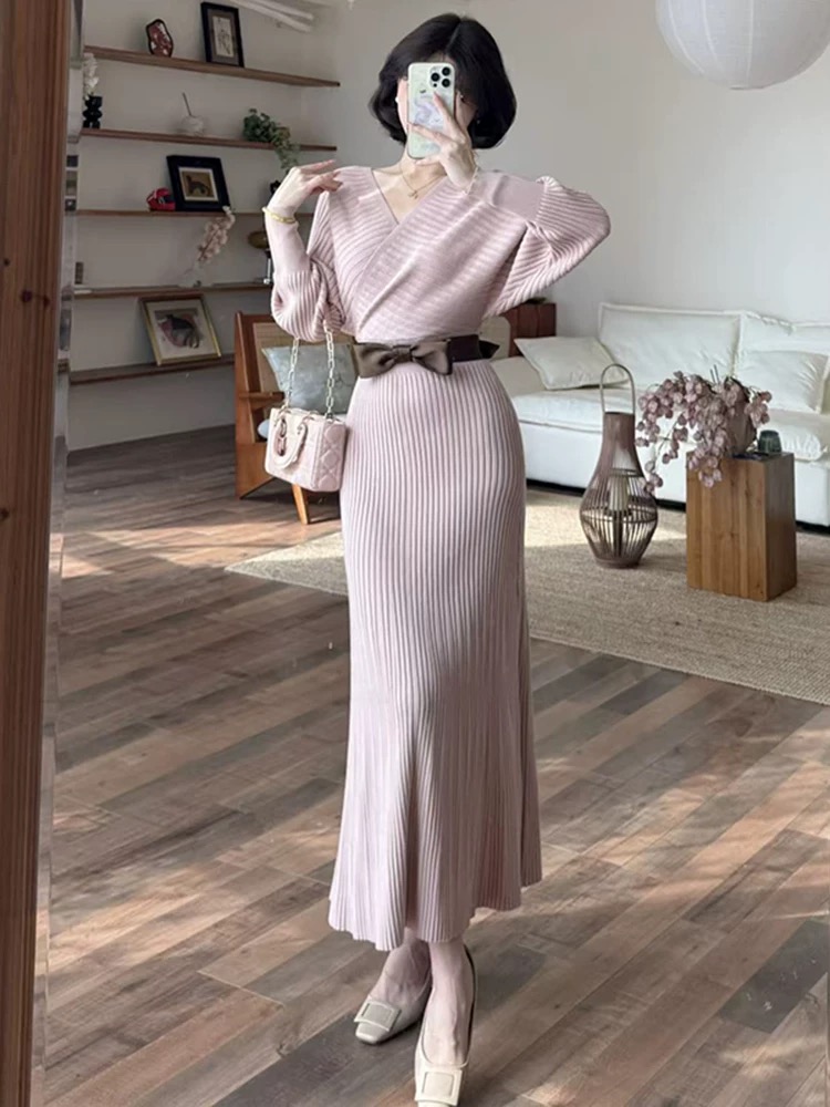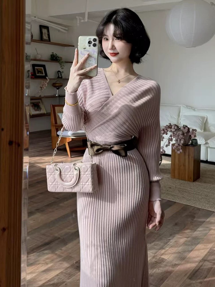 FA45395# 加厚毛衣蕾英俊心动情书-秋季韩系性感辣妹名媛气质V领针织连衣裙 服裝批發女裝批發服飾貨源