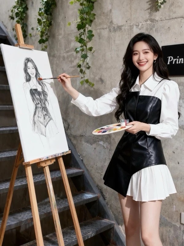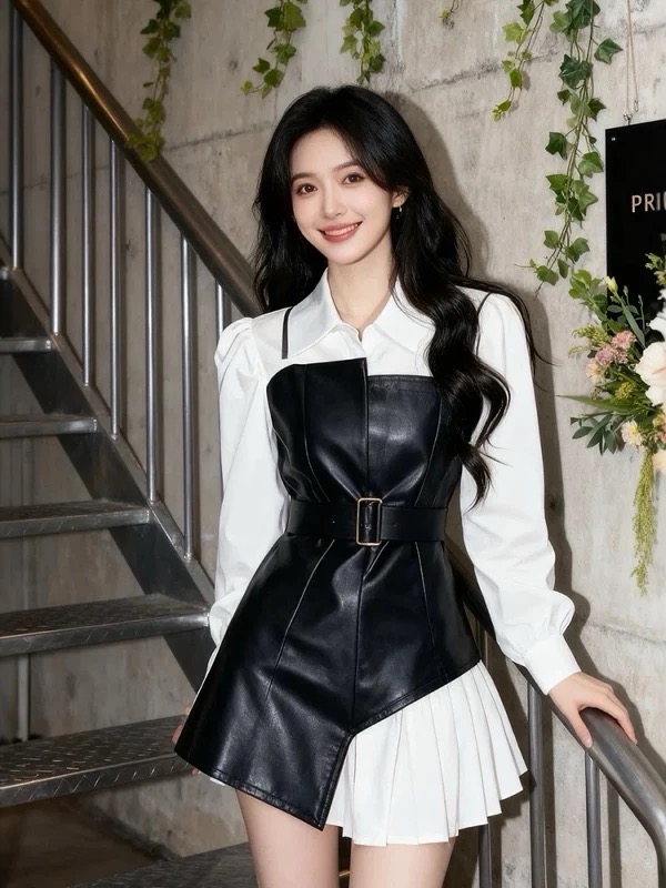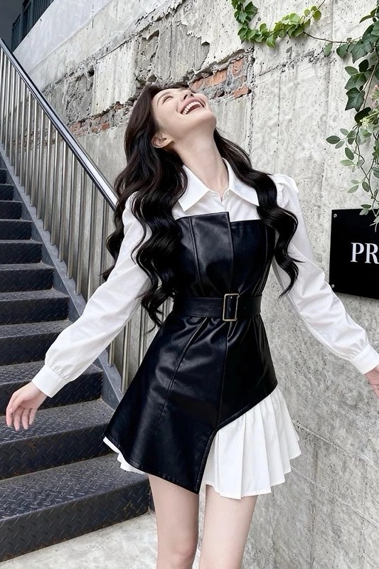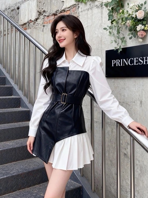 FA45435# 高级感假两件拼接长袖衬衫连衣裙女秋新款气质收腰显瘦pu皮短裙子 服裝批發女裝批發服飾貨源