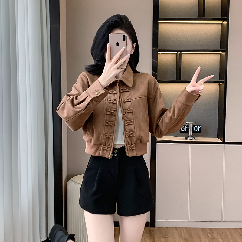 Home > 风衣、西装外套 > FA45749# 翻领复古港风短外套女夹克休闲秋季新款女装麂皮绒上衣女 服裝批發女裝批發服飾貨源