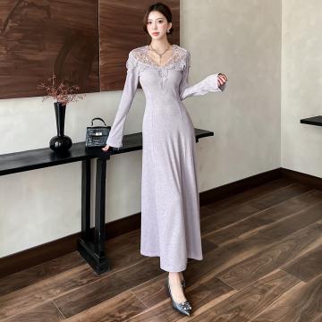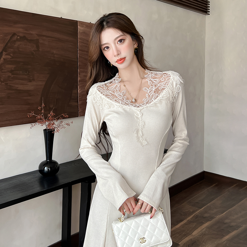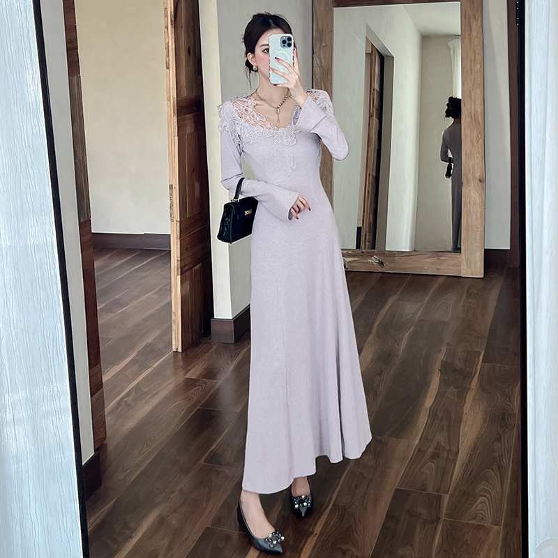 FA45961# 韩系温柔风蕾丝V领针织连衣裙秋冬高级感优雅气质收腰显瘦长裙子 服裝批發女裝批發服飾貨源