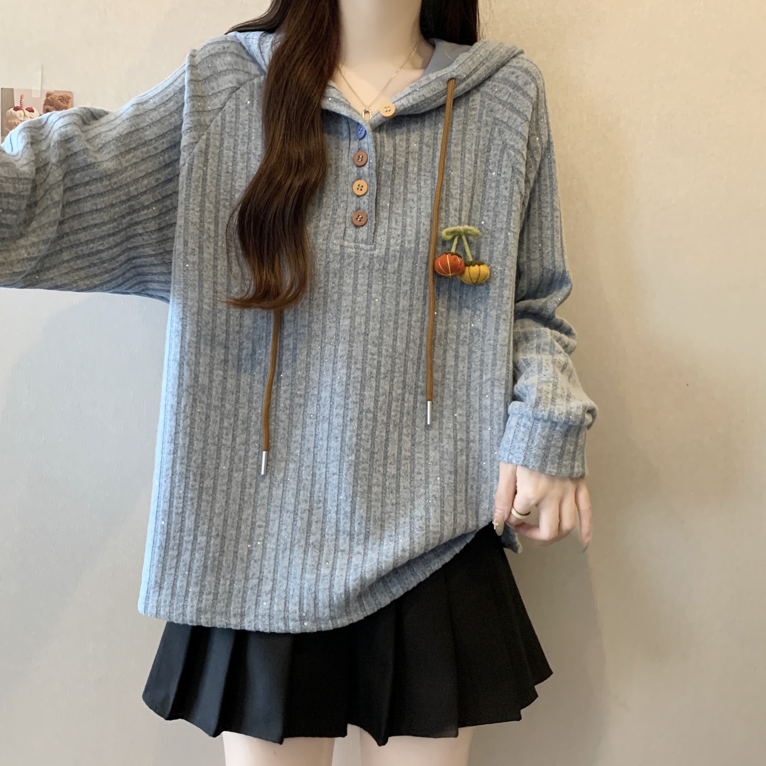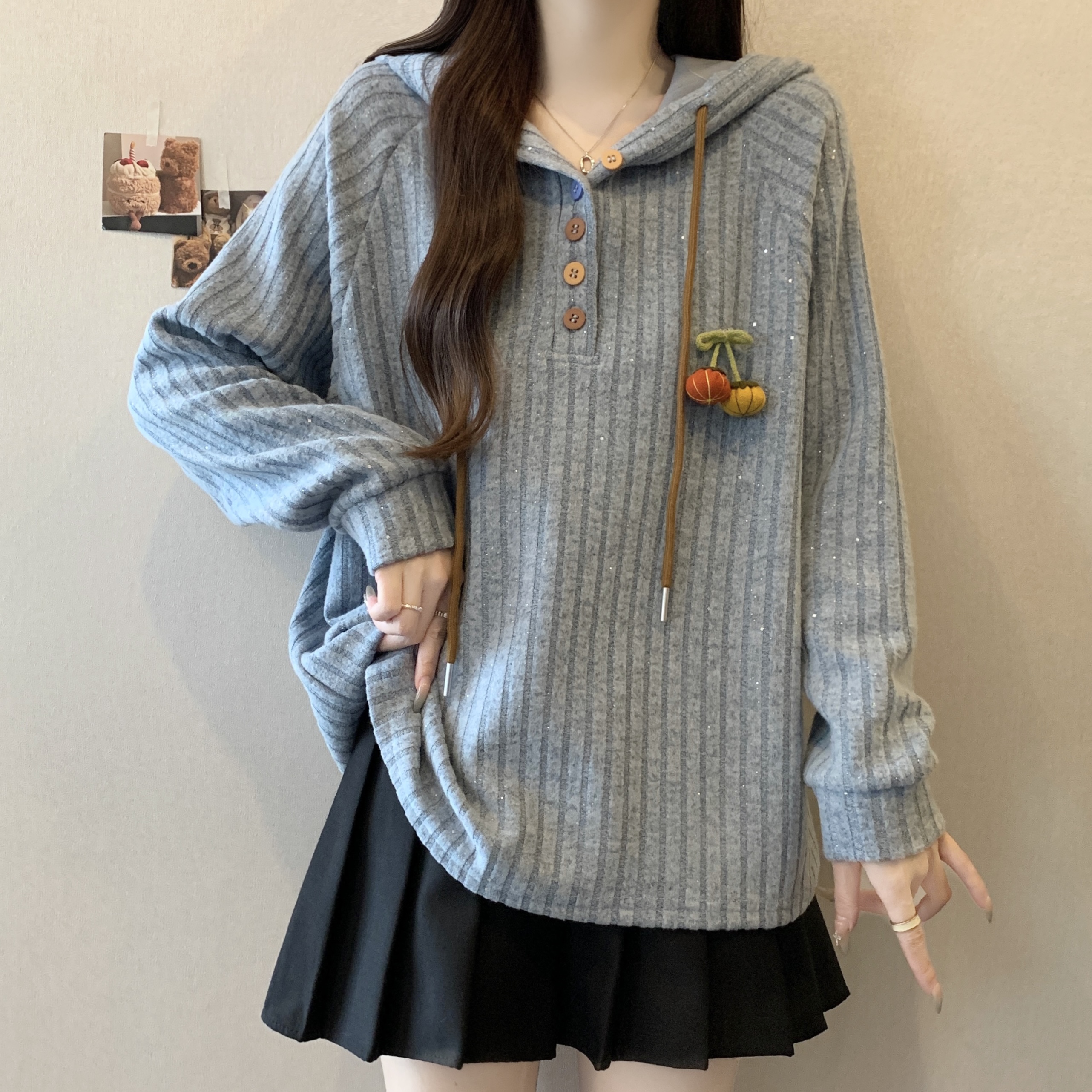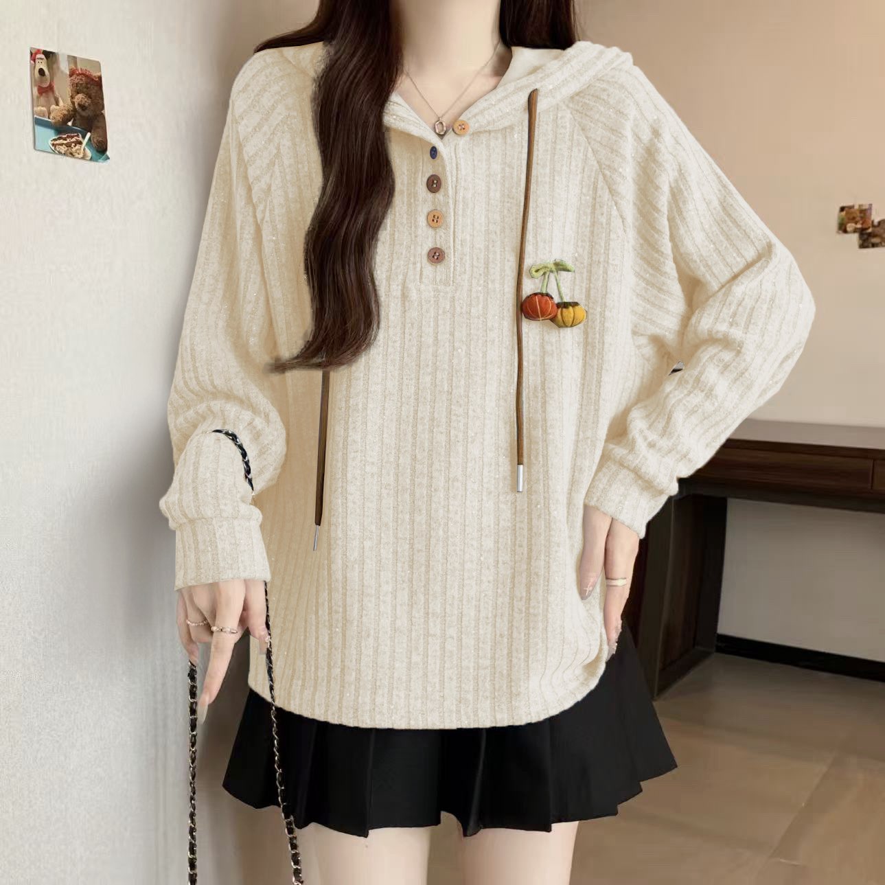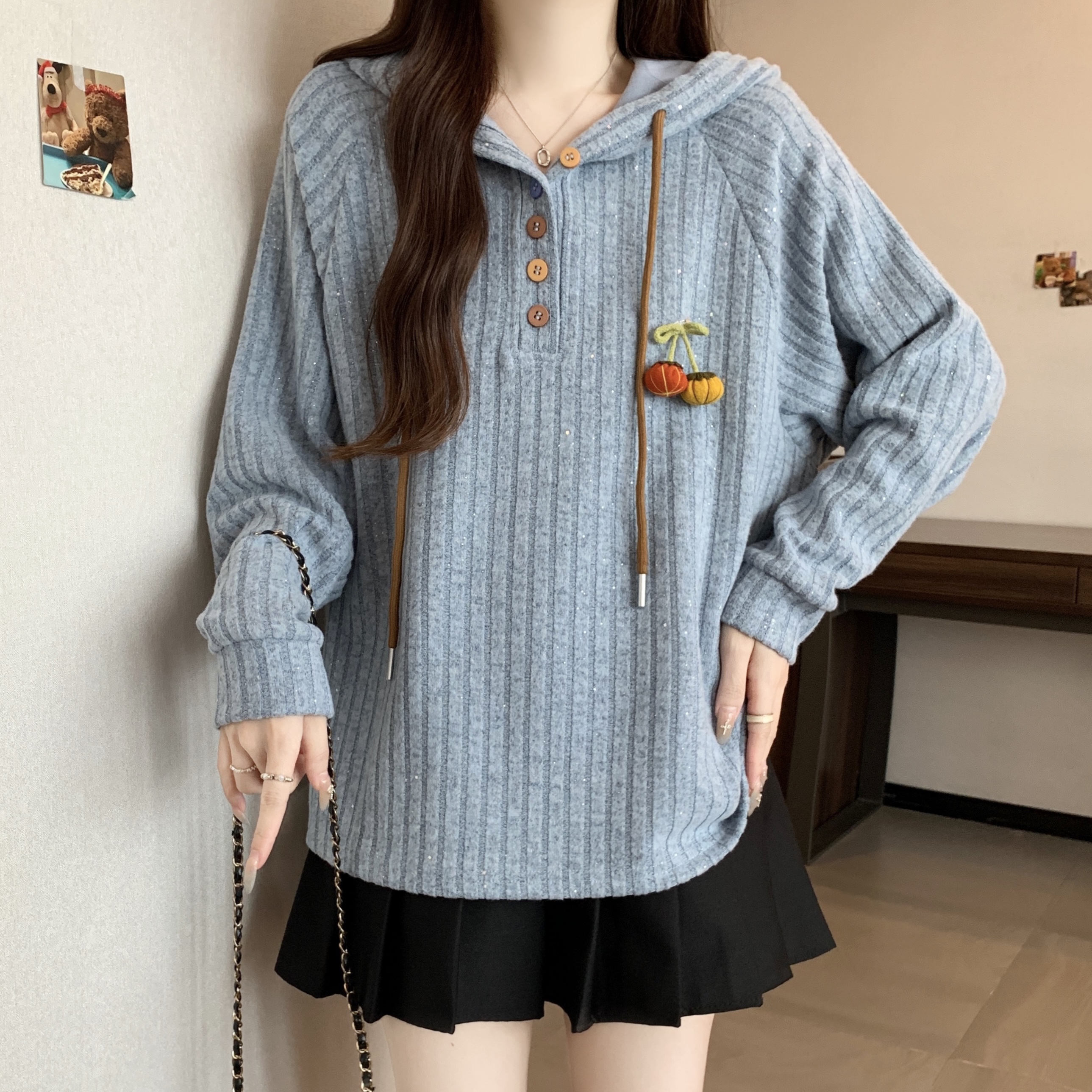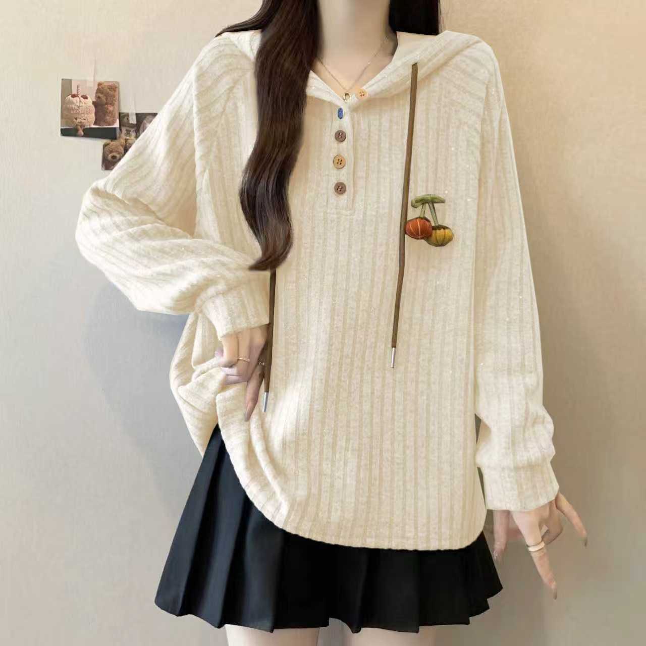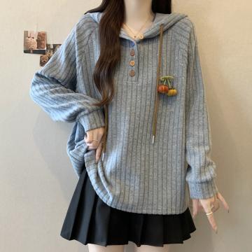 FA46412# 大码新款时尚设计款减龄秋冬宽松显瘦遮肉坑条感连帽卫衣 服裝批發女裝批發服飾貨源