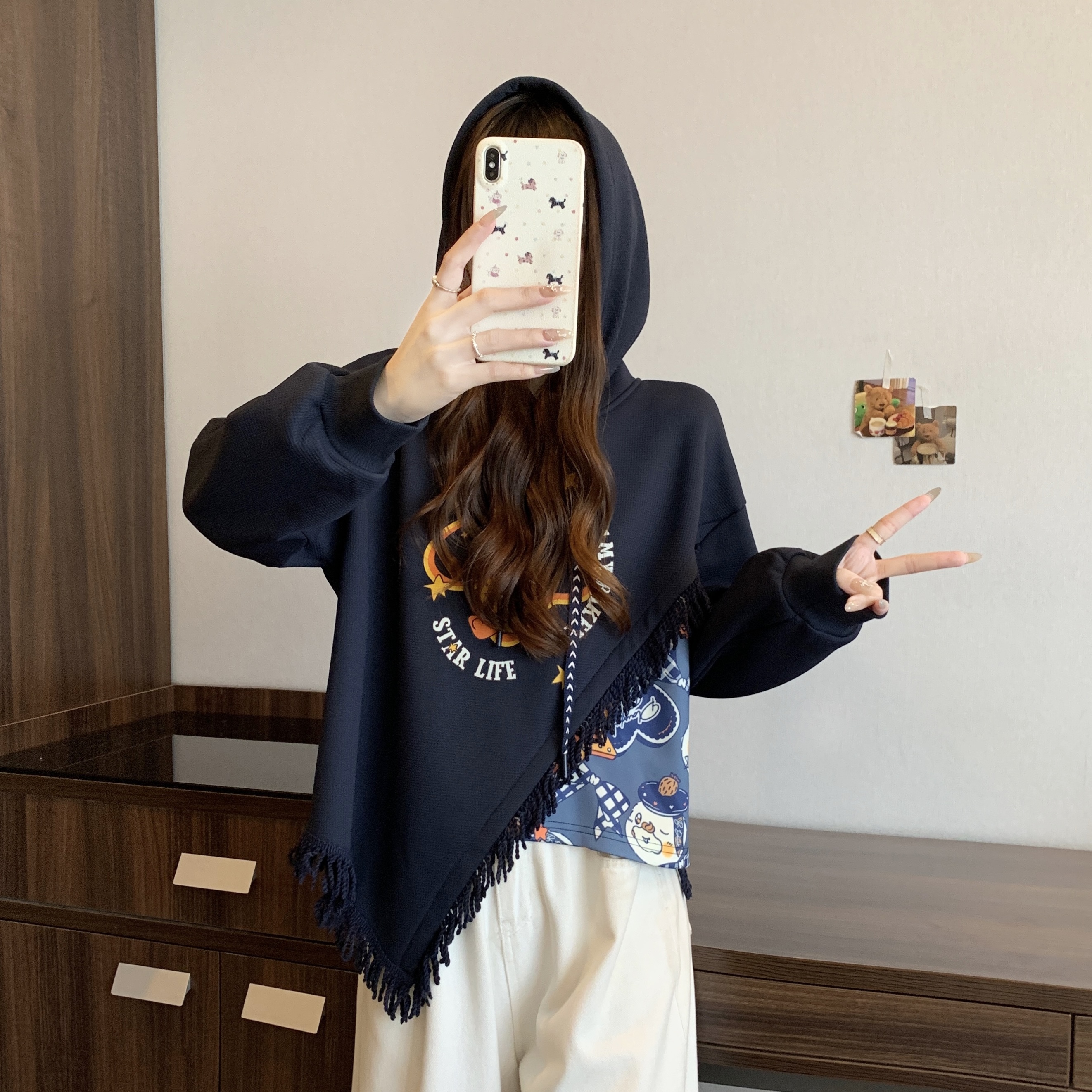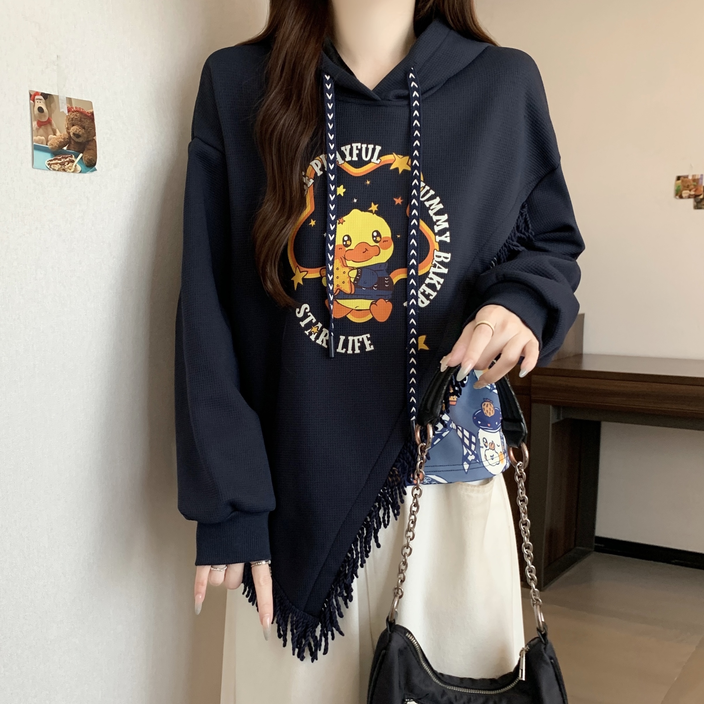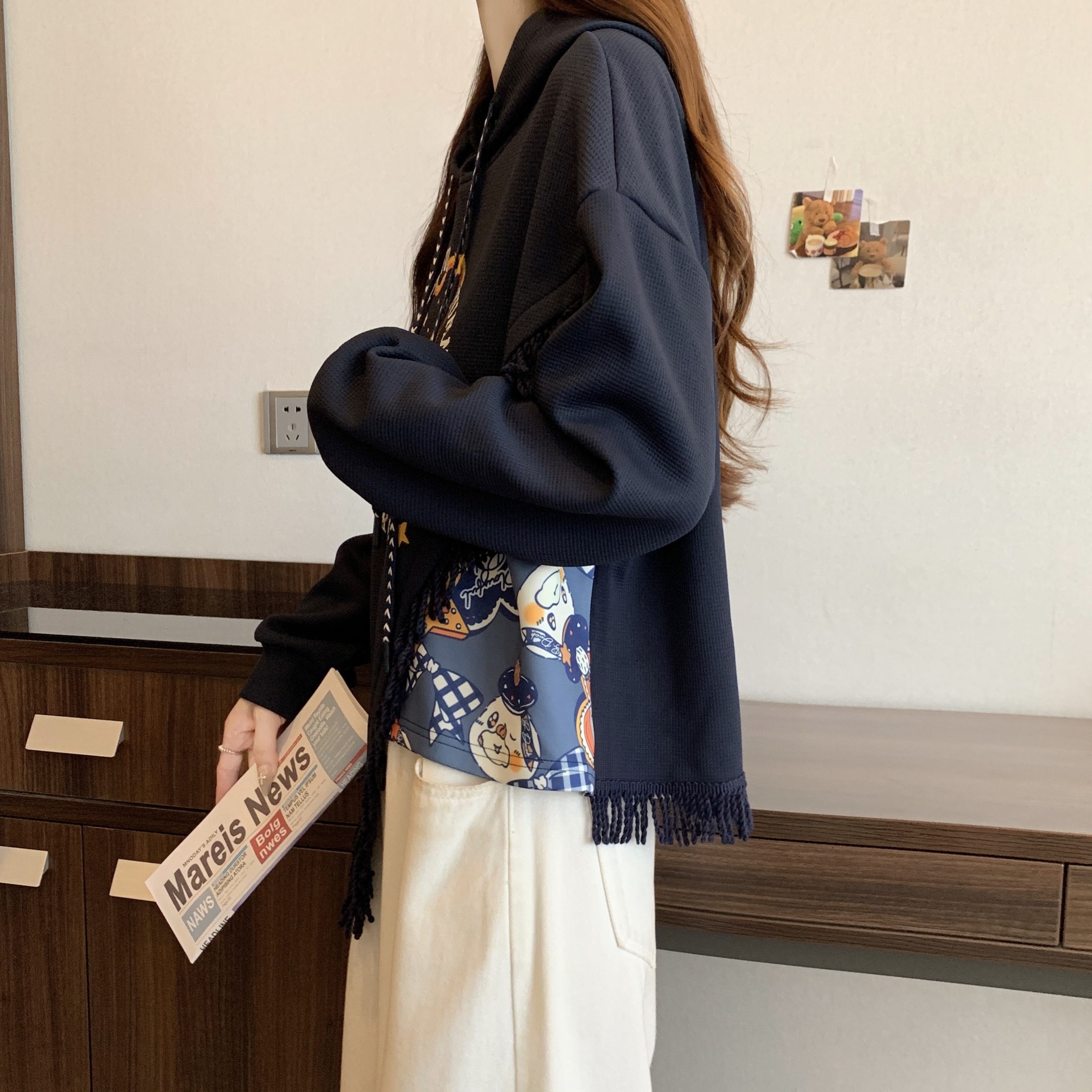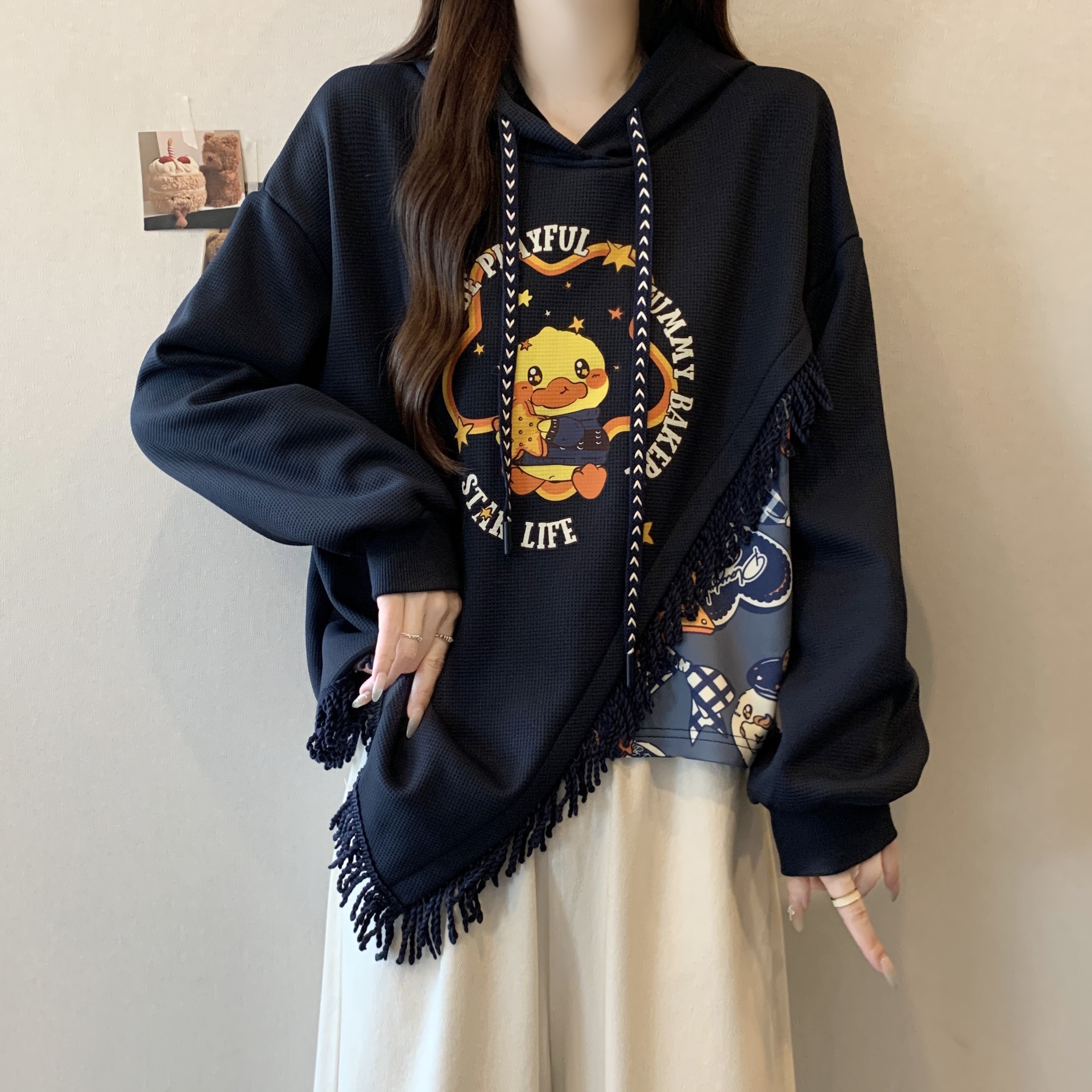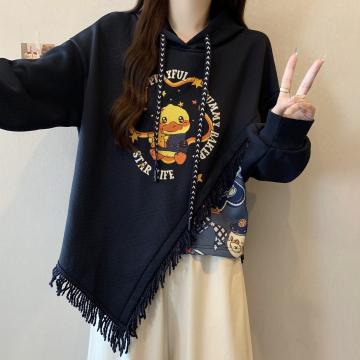 FA46415# 新款大码秋冬加绒加厚学院风复古流苏拼接印花连帽卫衣女 服裝批發女裝批發服飾貨源