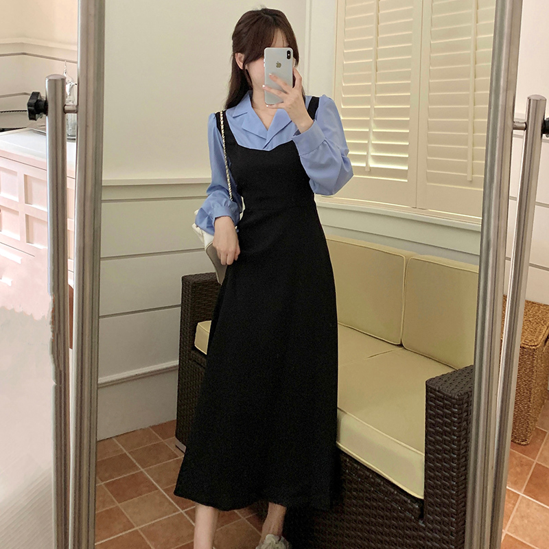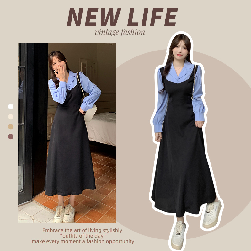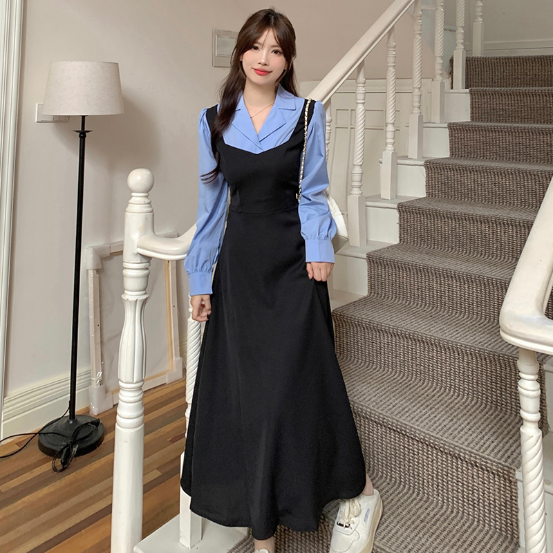 FA46452# 后包领做工新款撞色拼接假两件收腰系带A字长袖连衣裙 服裝批發女裝批發服飾貨源