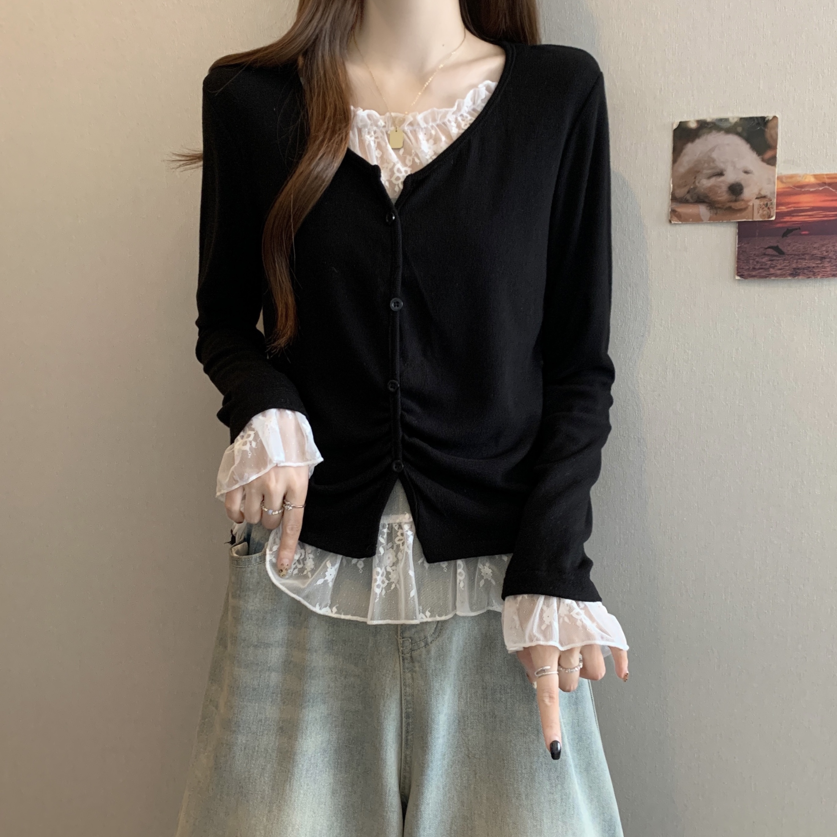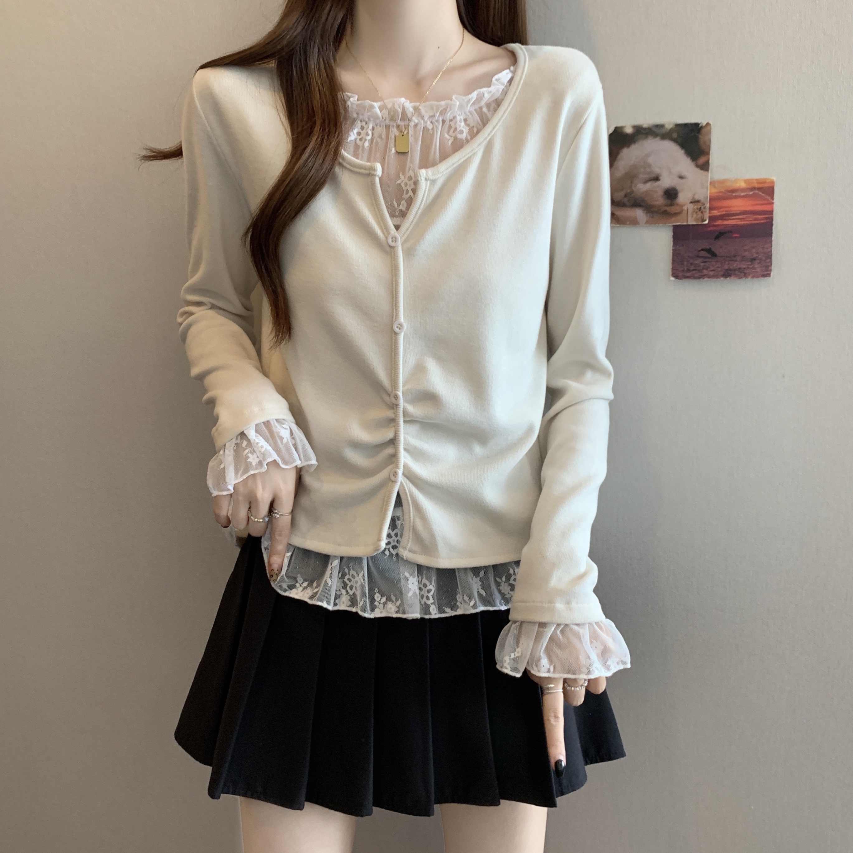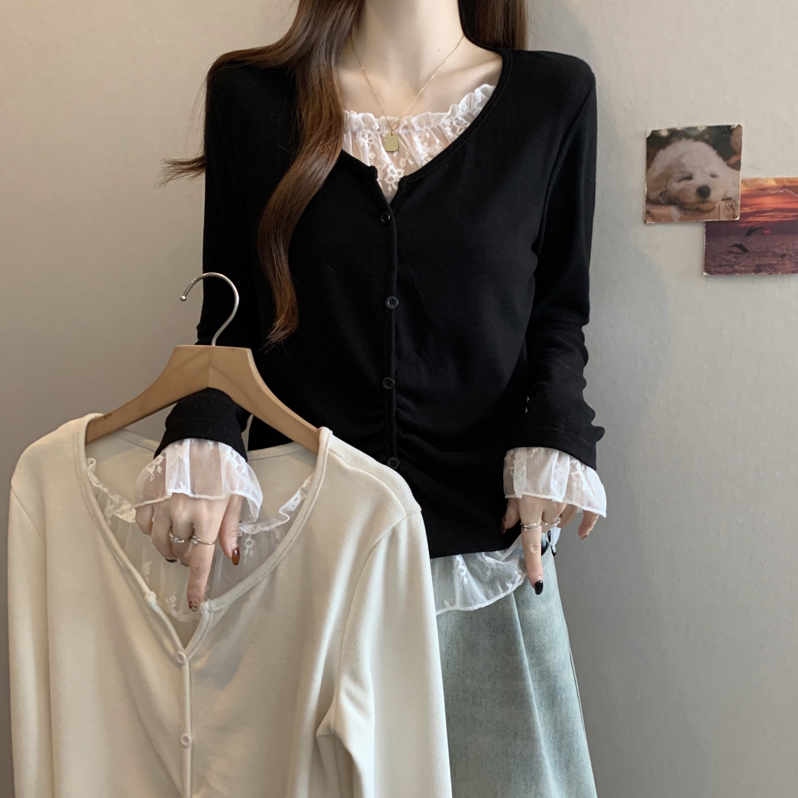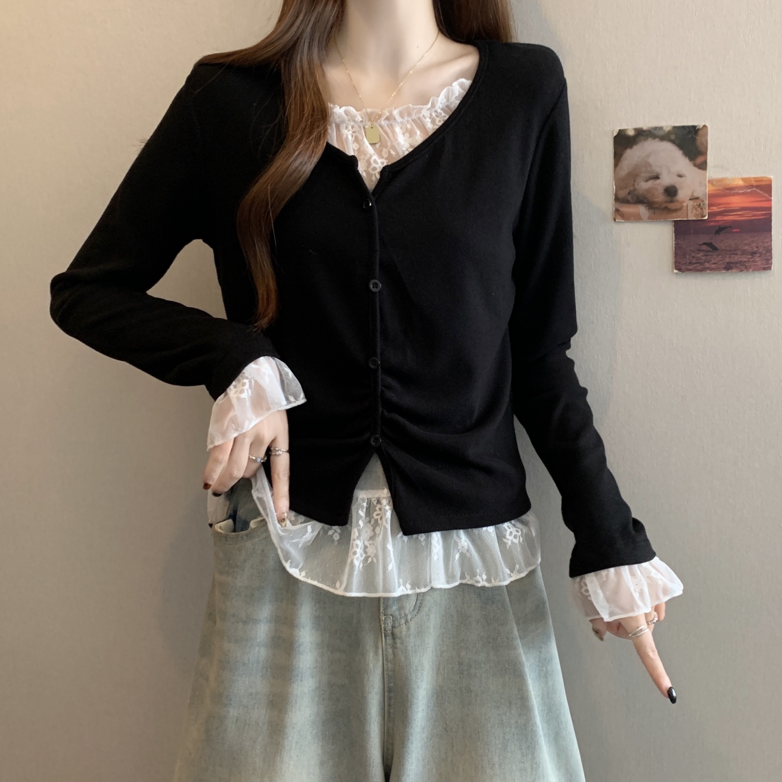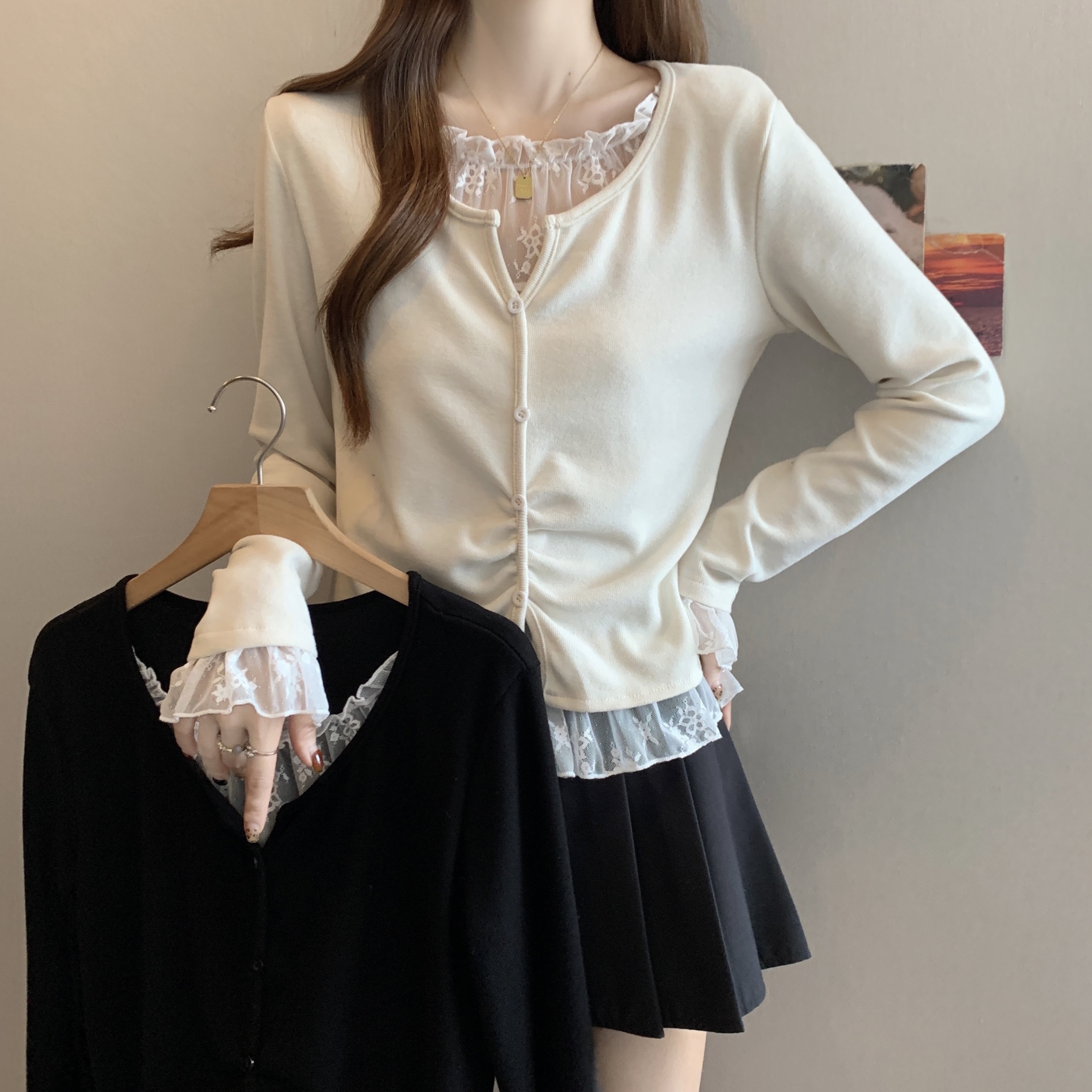 Home > 长袖T恤 > FA46772# 大码秋冬新款胖MM蕾丝拼接假两件设计感不规则遮肉显瘦上衣女 服裝批發女裝批發服飾貨源