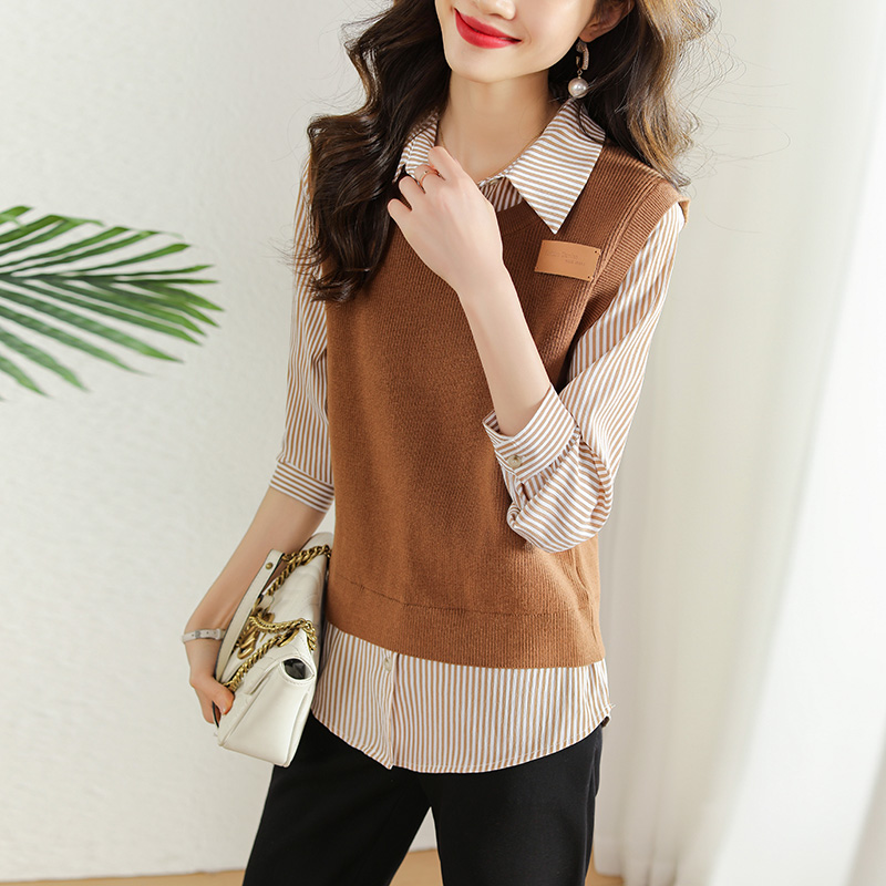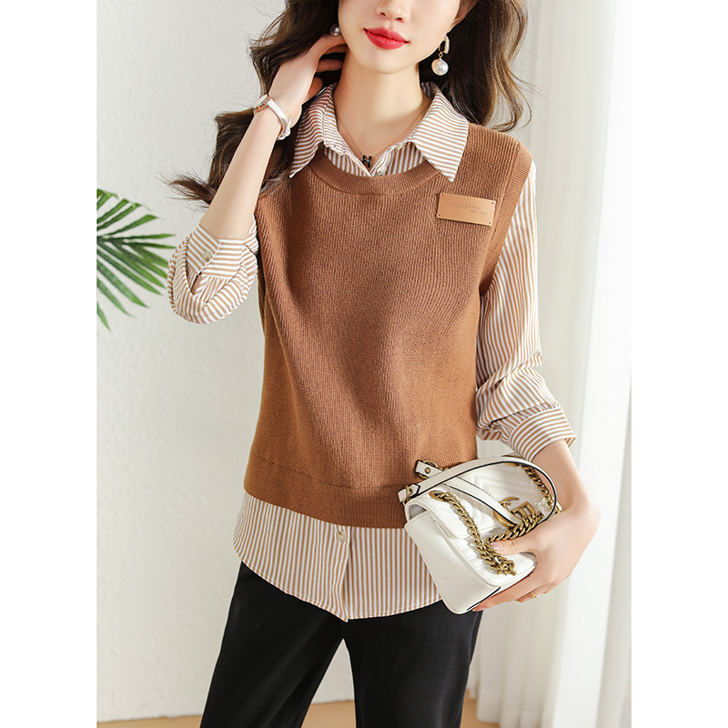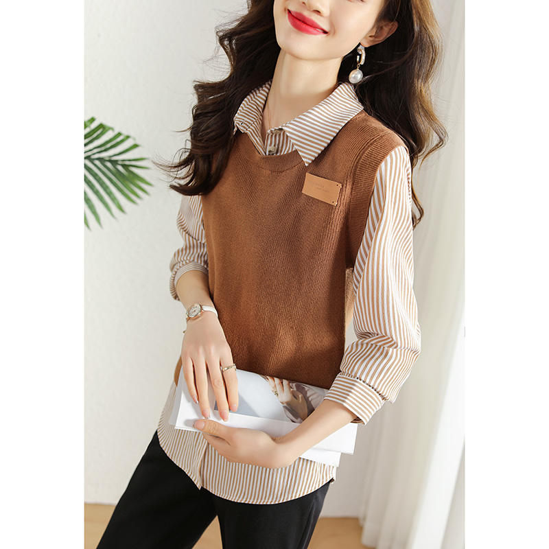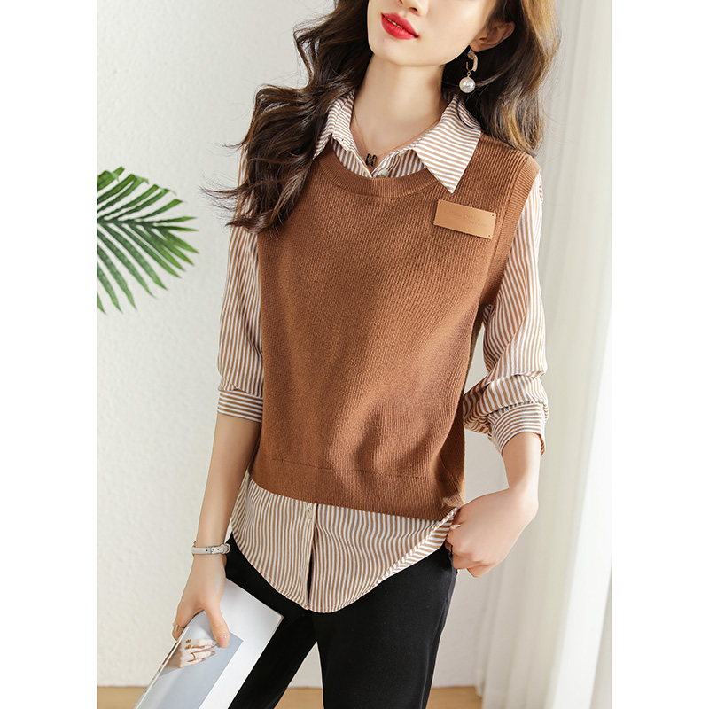 FA46823# 美拉德针织拼接假两件衬衫女秋季新款优雅时尚通勤上衣 服裝批發女裝批發服飾貨源