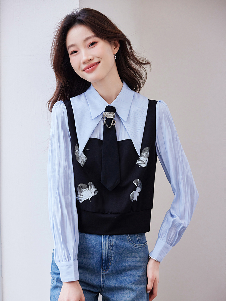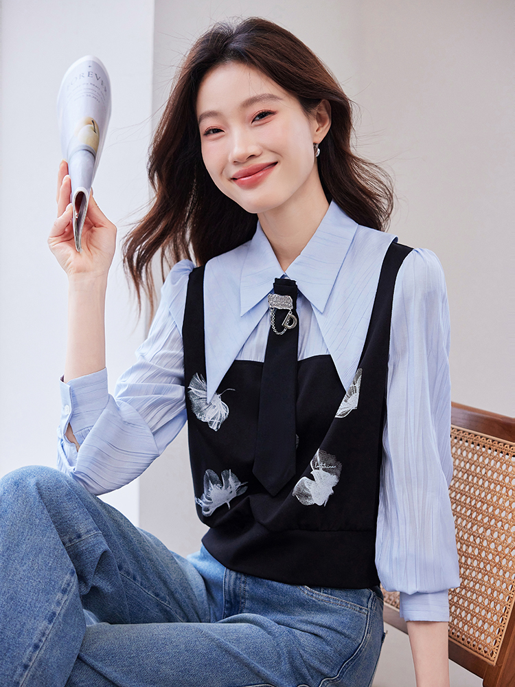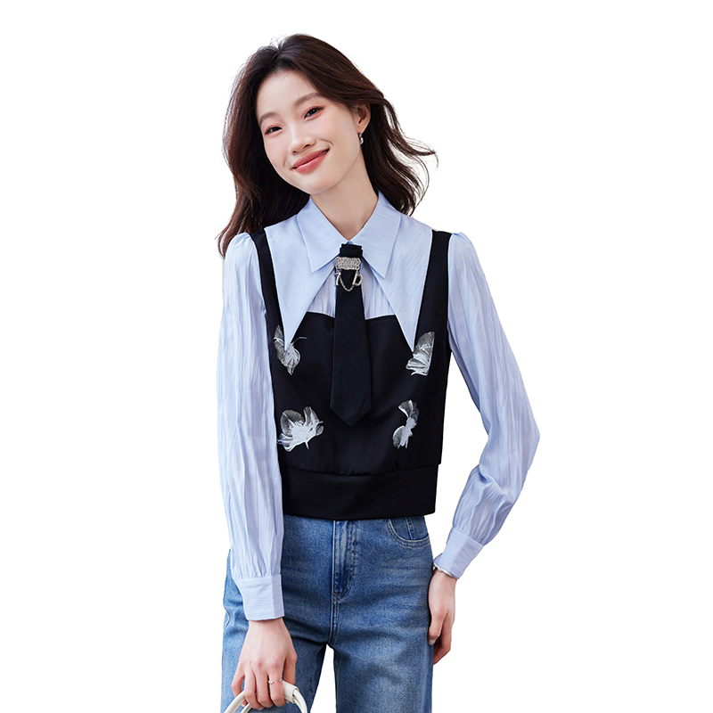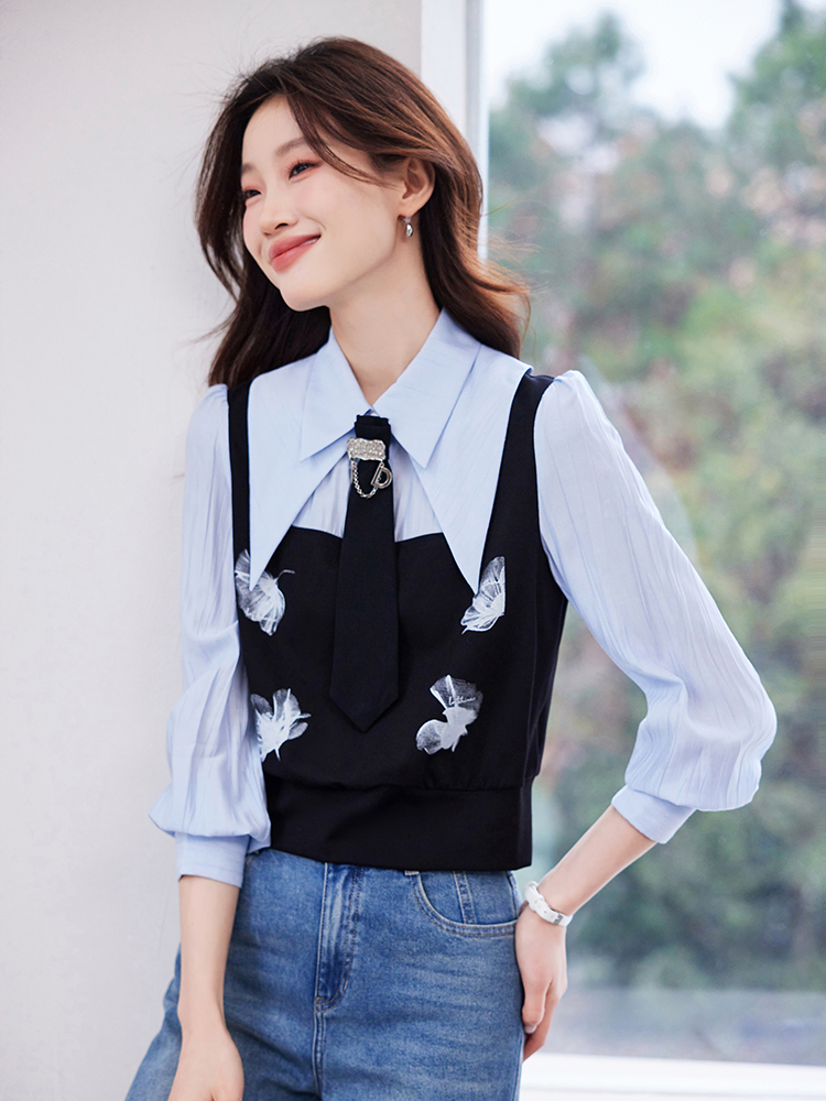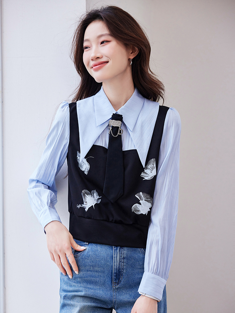 FA46826# 设计感小众法式拼接上衣女春季新款洋气假两件气质衬衫 服裝批發女裝批發服飾貨源
