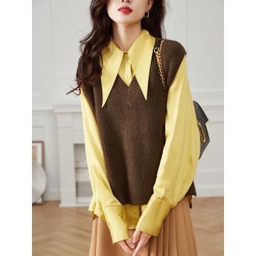黄色衬衣搭咖色背心