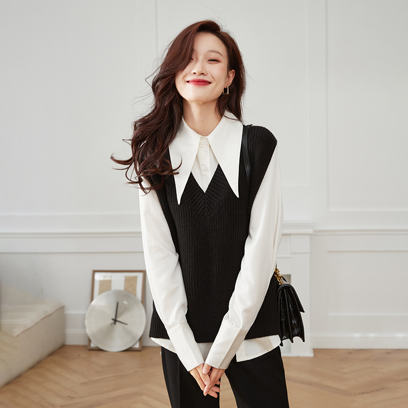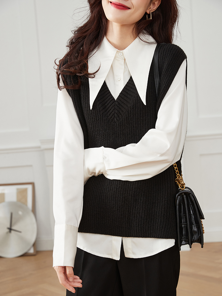 白色衬衣搭黑色背心