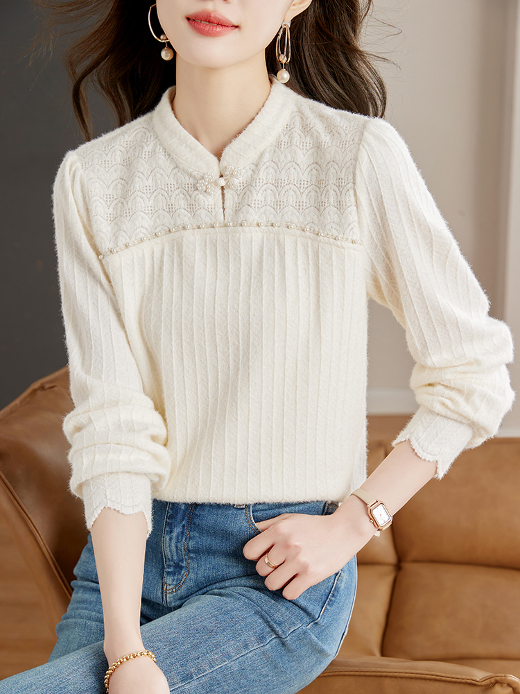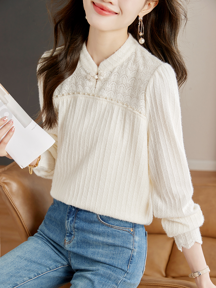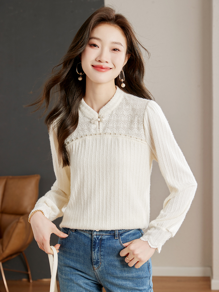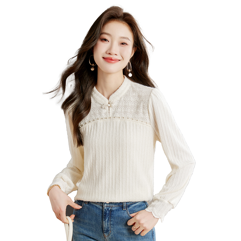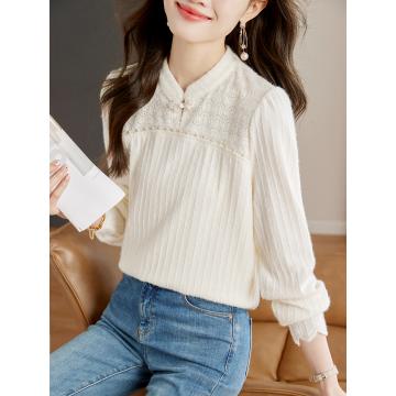 FA46839# 新中式上衣女秋季新款长袖蕾丝打底衫盘扣复古米白色衬衫 服裝批發女裝批發服飾貨源