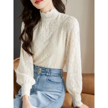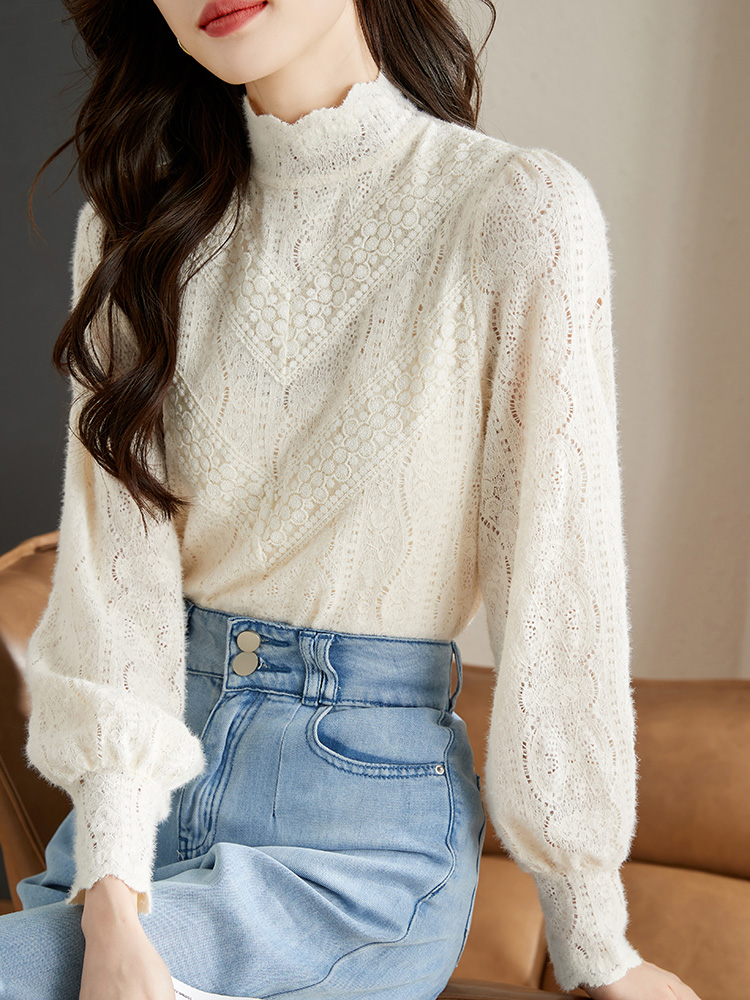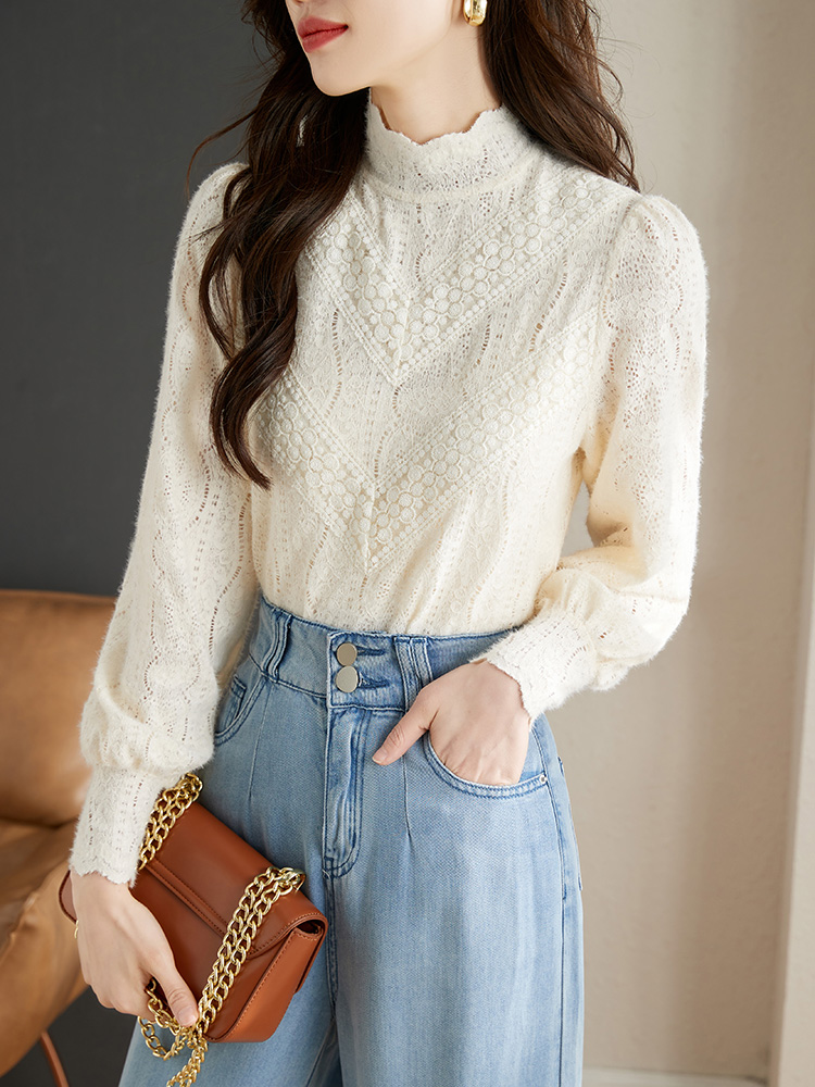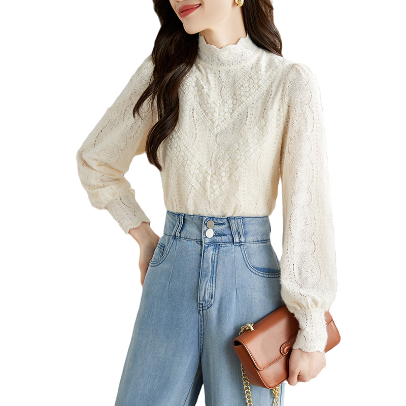 FA46841# 法式米杏色雪纺蕾丝衫女秋季新款淑女花边小立领上衣 服裝批發女裝批發服飾貨源
