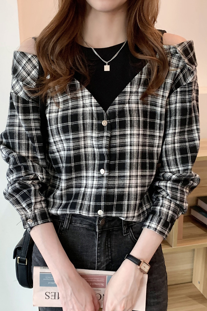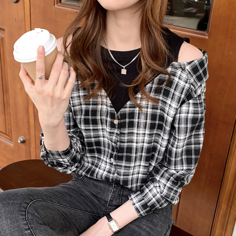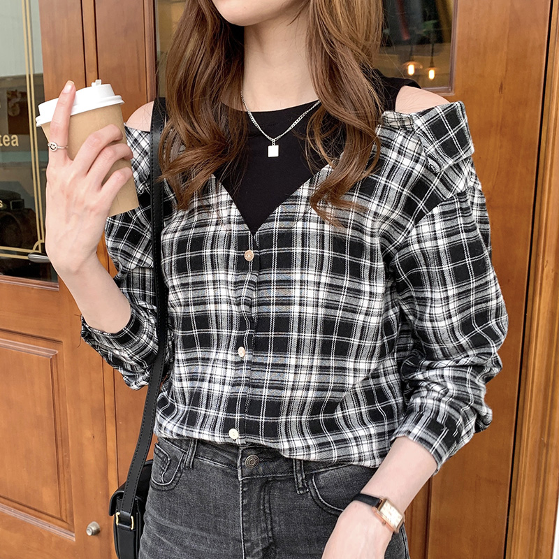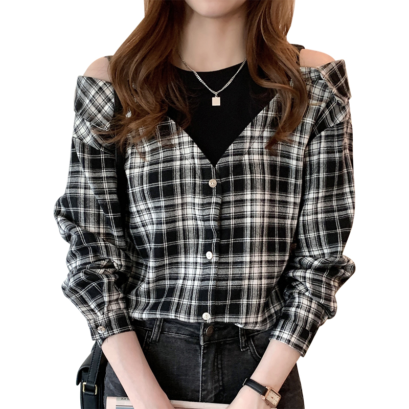 FA46846# 露肩格子假两件拼接t恤女秋装新款设计感小众别致长袖上衣 服裝批發女裝批發服飾貨源