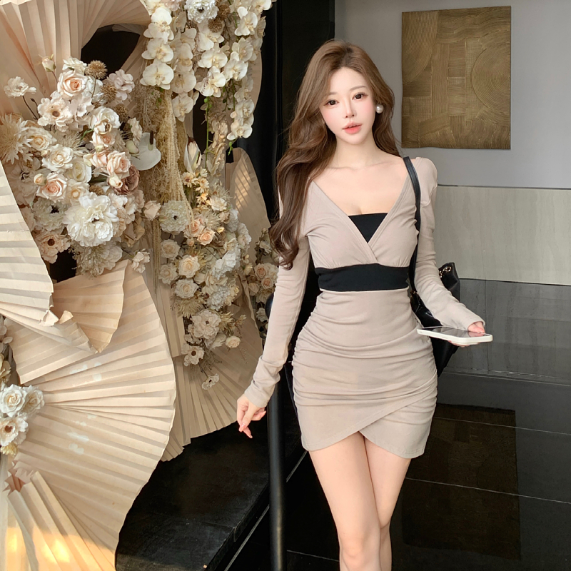 FA46855# 带胸垫高级气质修身撞色假两件加绒长袖连衣裙秋冬包臀短裙子 服裝批發女裝批發服飾貨源