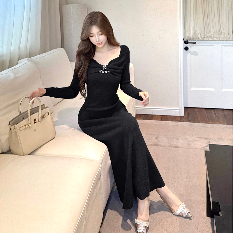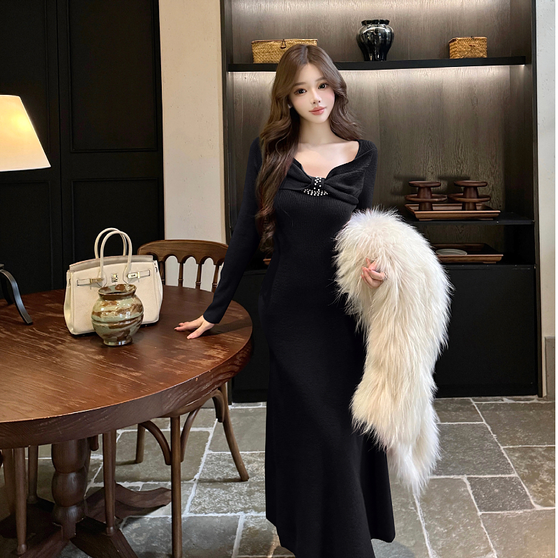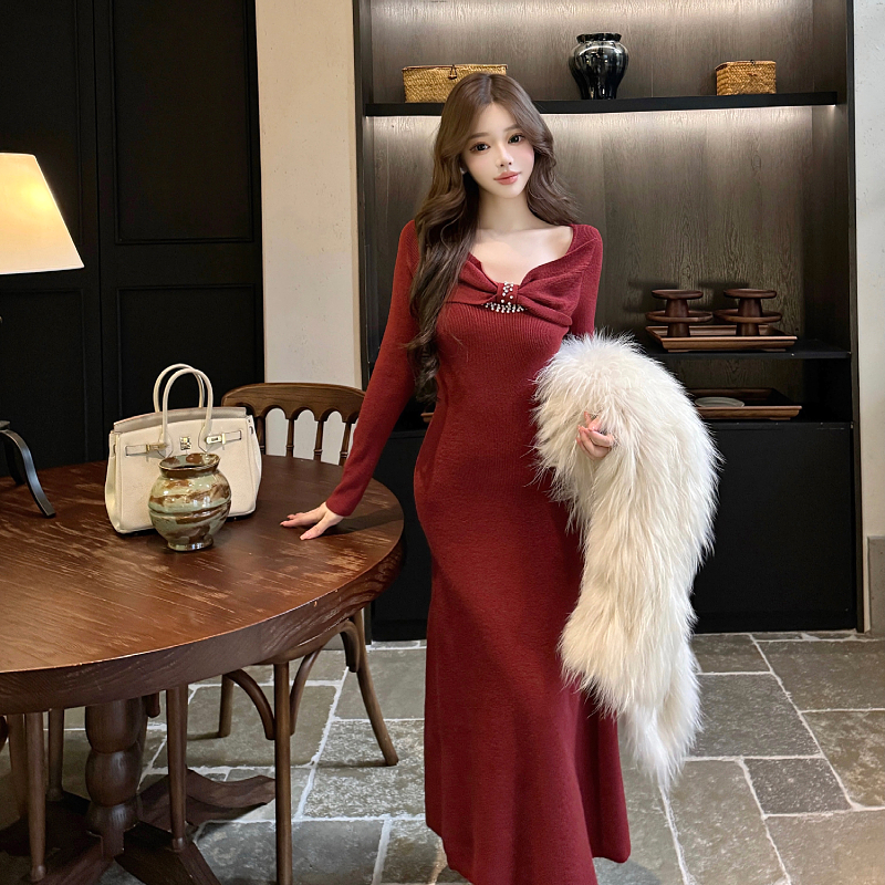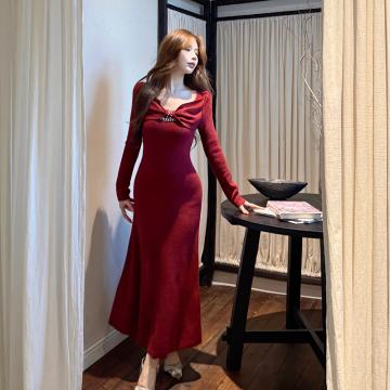FA46856# 红色蝴蝶结一字肩长袖连衣裙女秋冬新款性感纯欲内搭A字长裙 服裝批發女裝批發服飾貨源