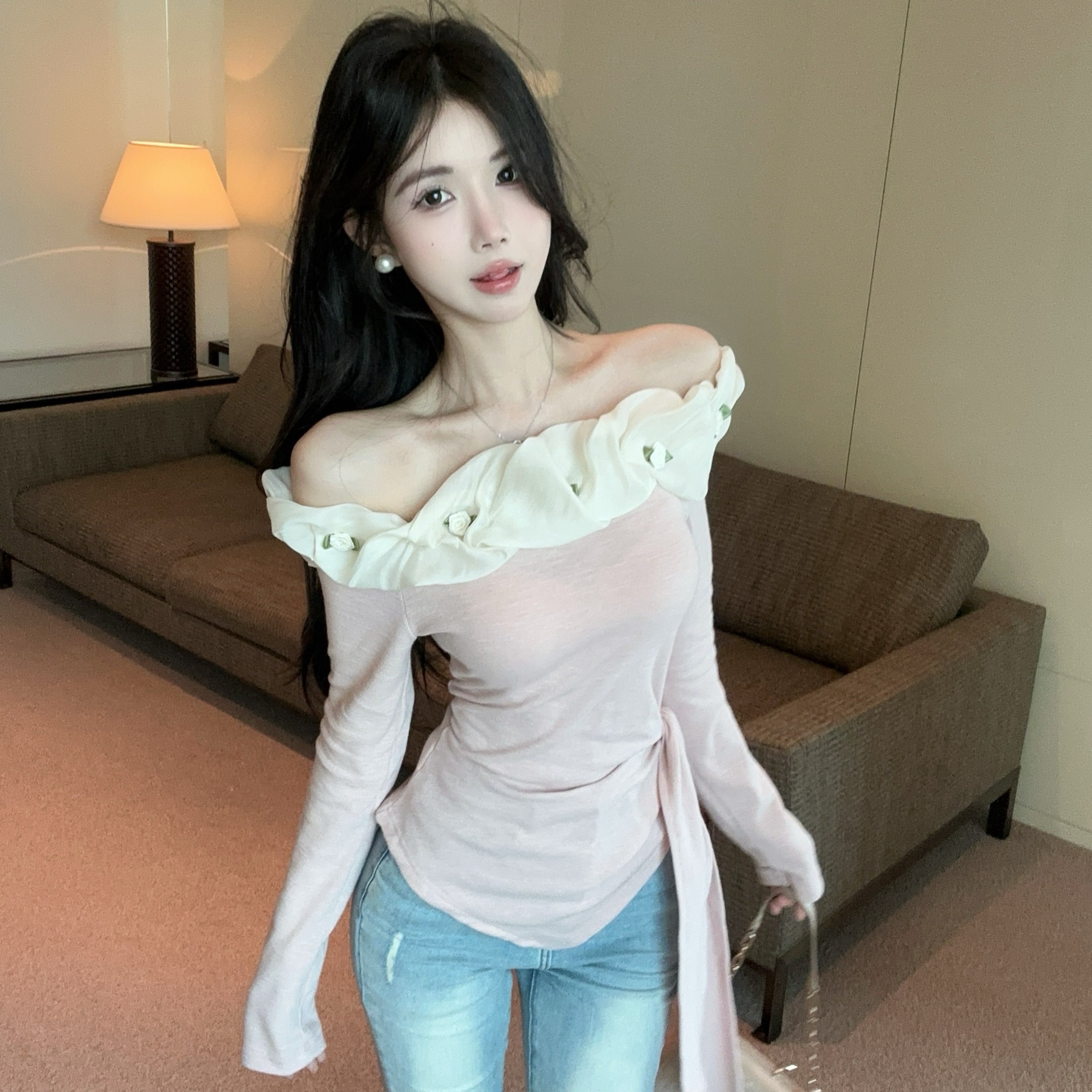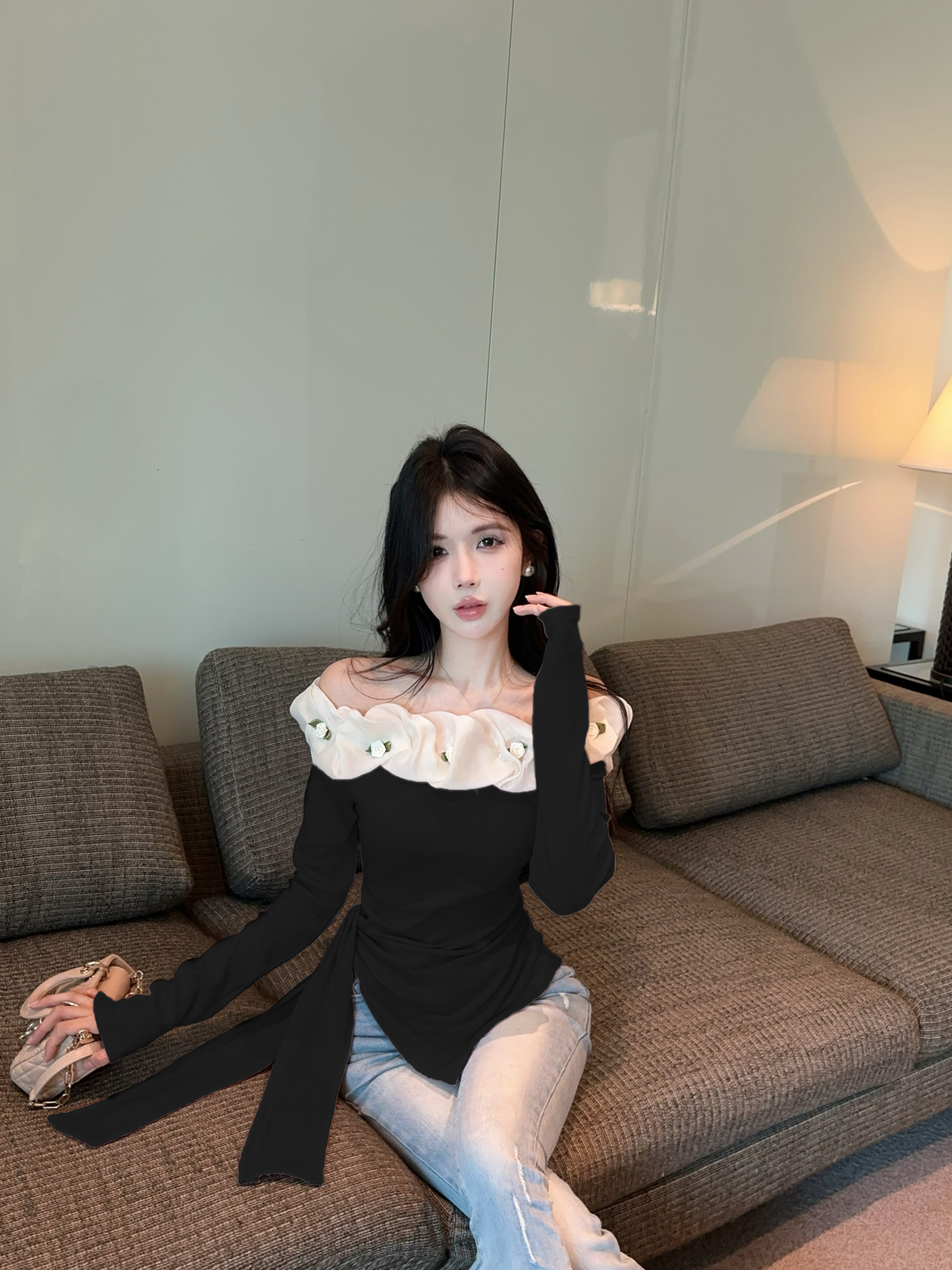 FA46814# 清新甜美立体花朵一字领显瘦不规则百搭上衣 服裝批發女裝批發服飾貨源